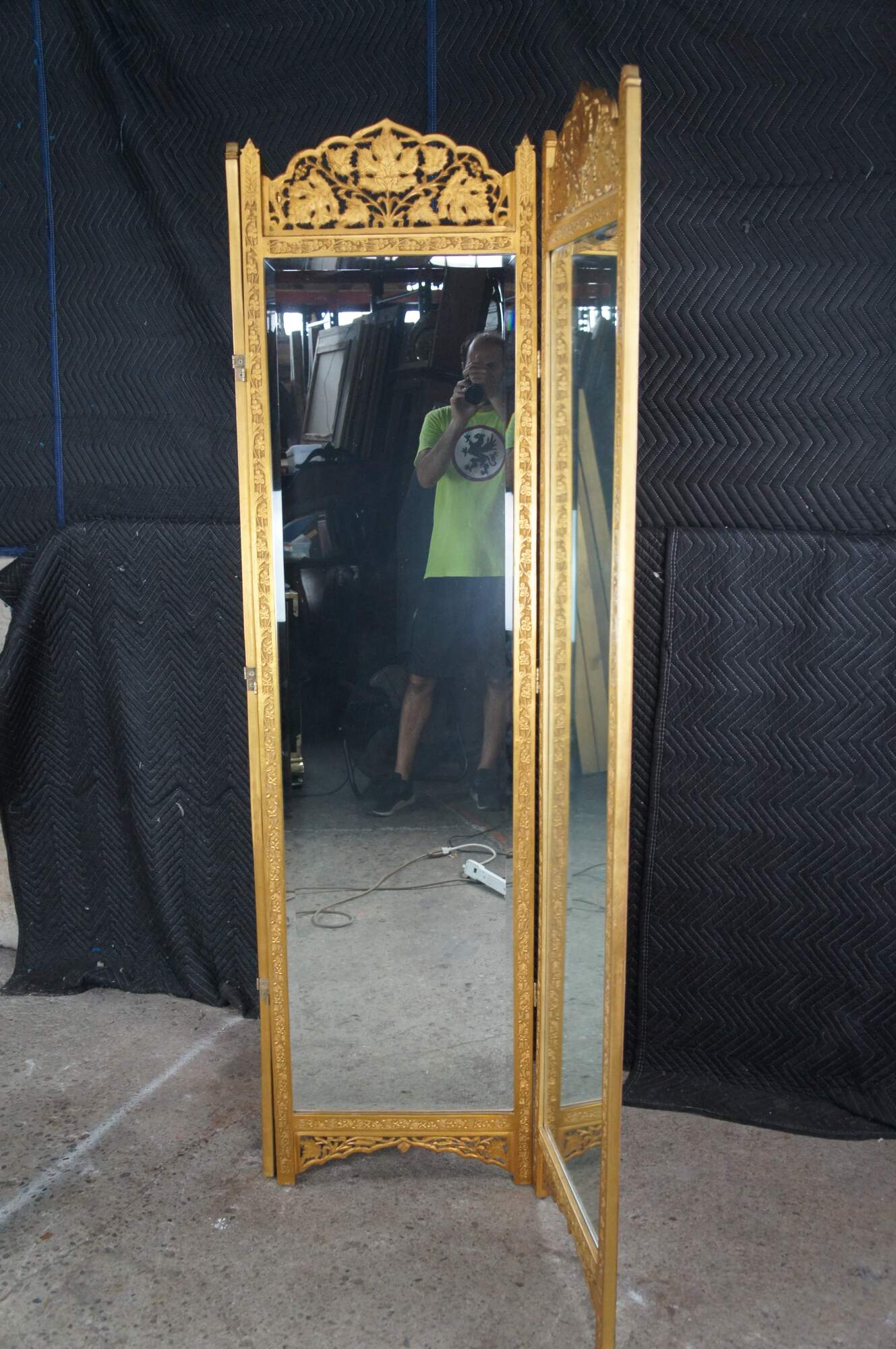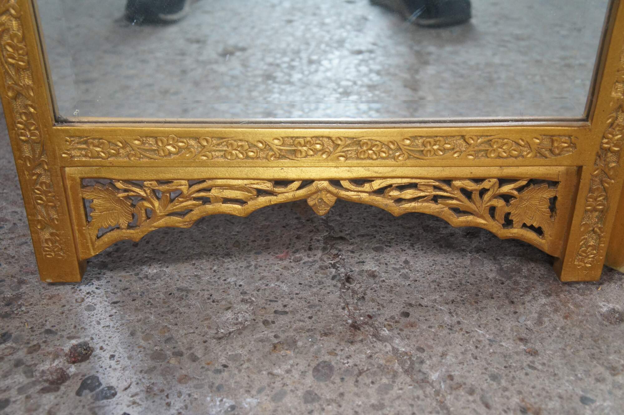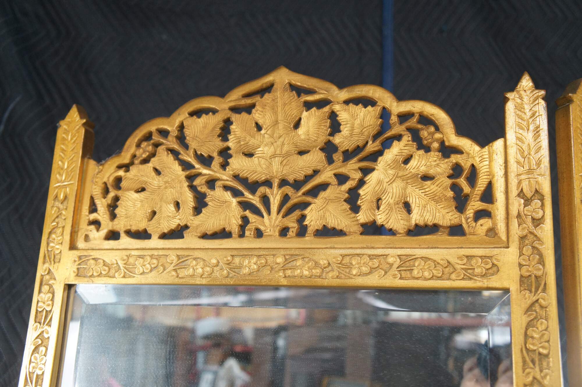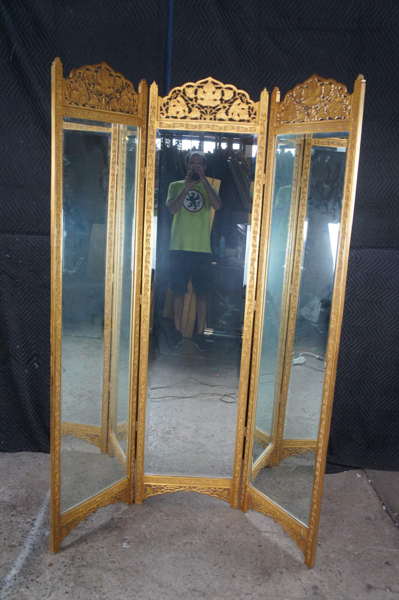 Vintage Chinese Chippendale / Hollywood Regency style gold giltwood tri fold full length dressing mirror / room divider featuring three double hinged beveled mirror panels with reticulated / pierced maple leaf and carved foliate designs.
