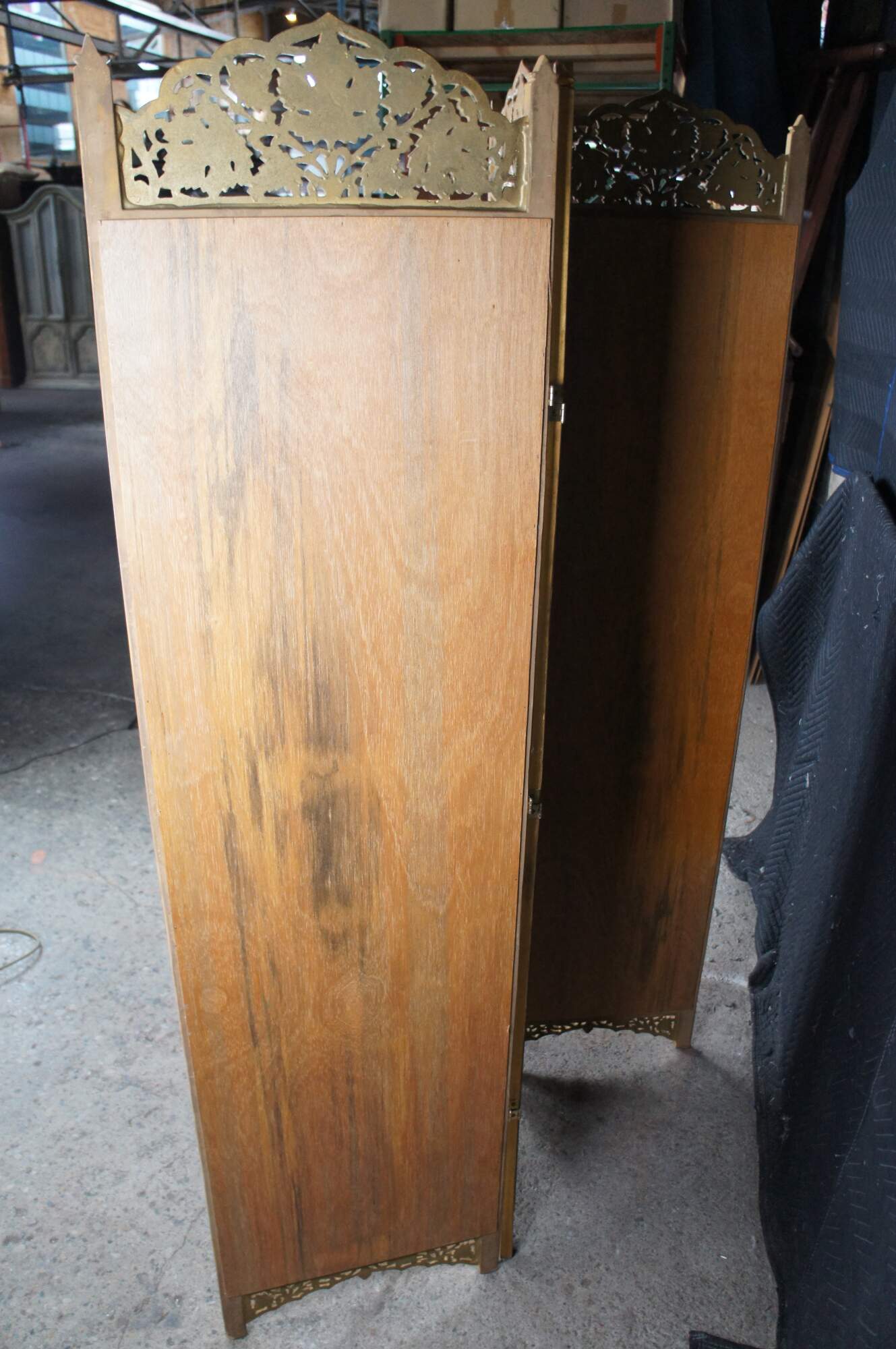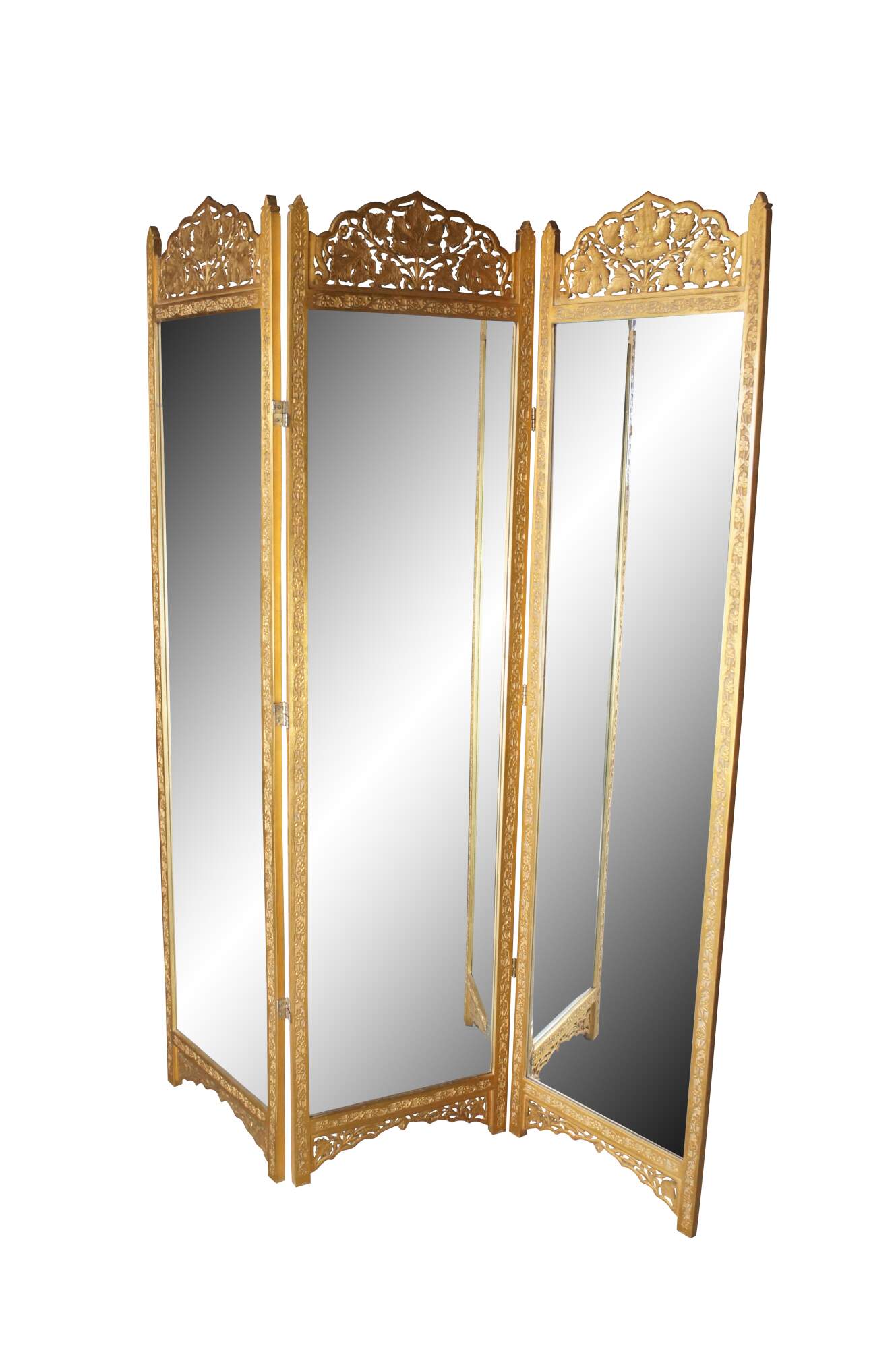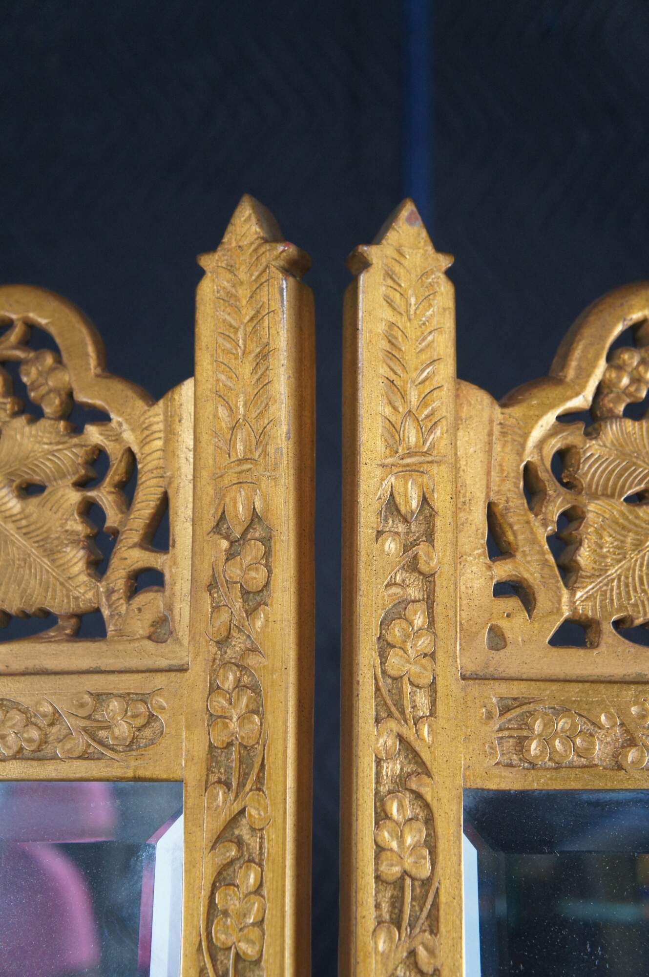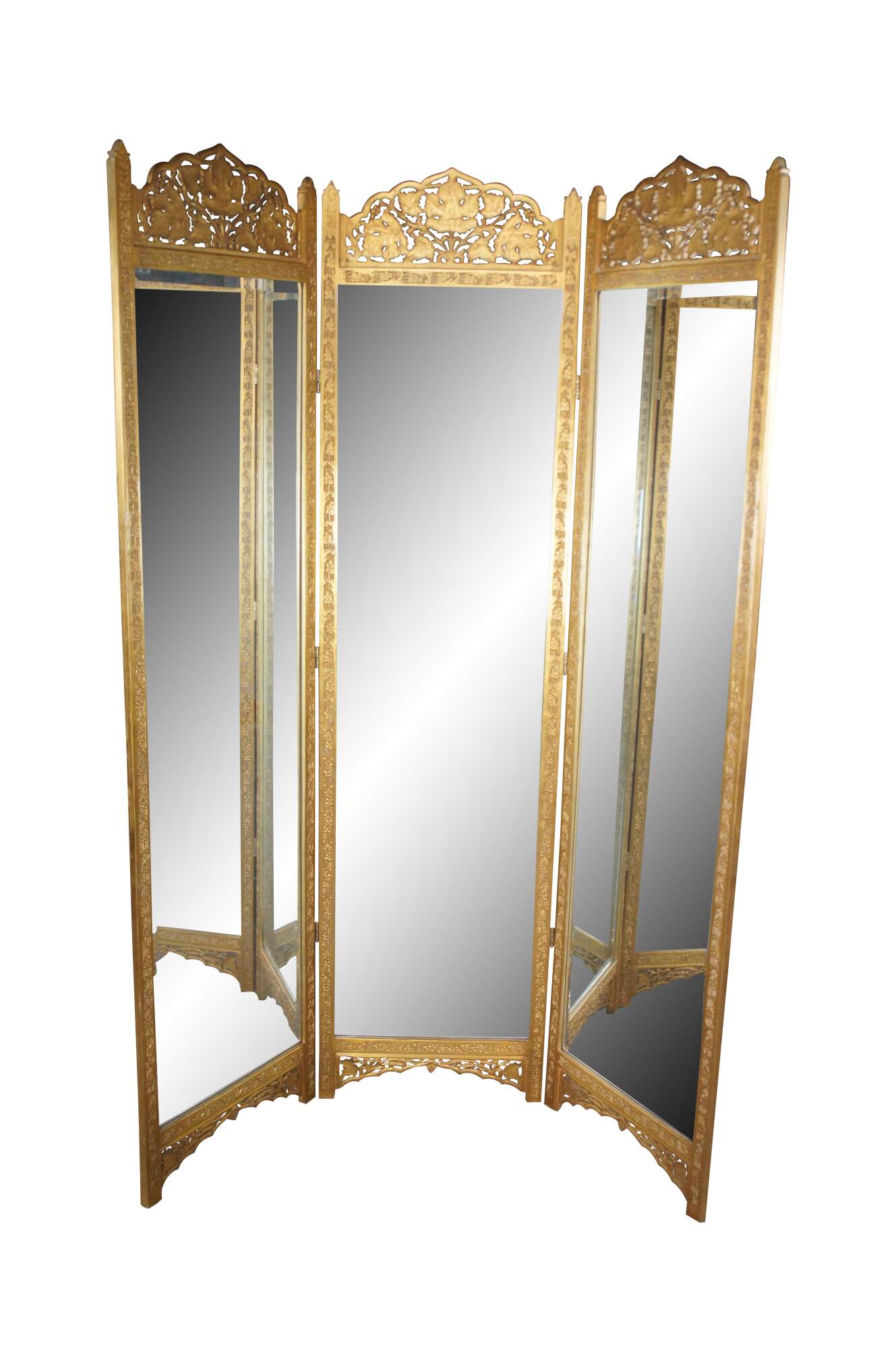 Vintage Chinese Chippendale / Hollywood Regency style gold giltwood tri fold full length dressing mirror / room divider featuring three double hinged beveled mirror panels with reticulated / pierced maple leaf and carved foliate designs.