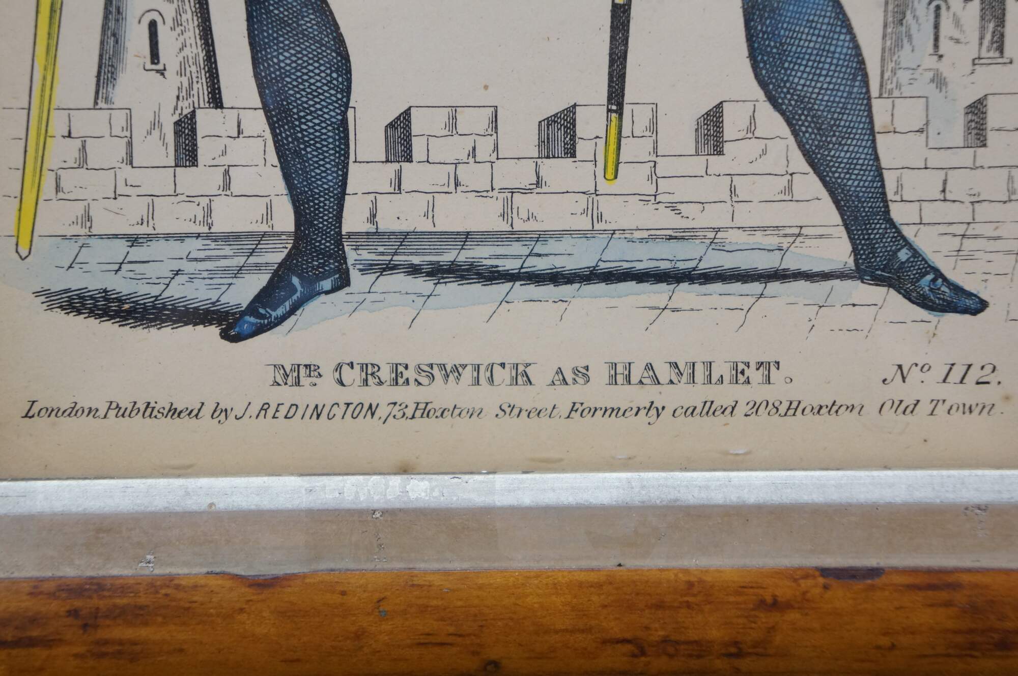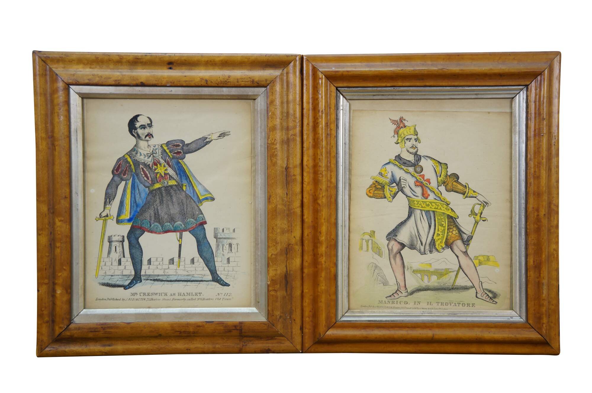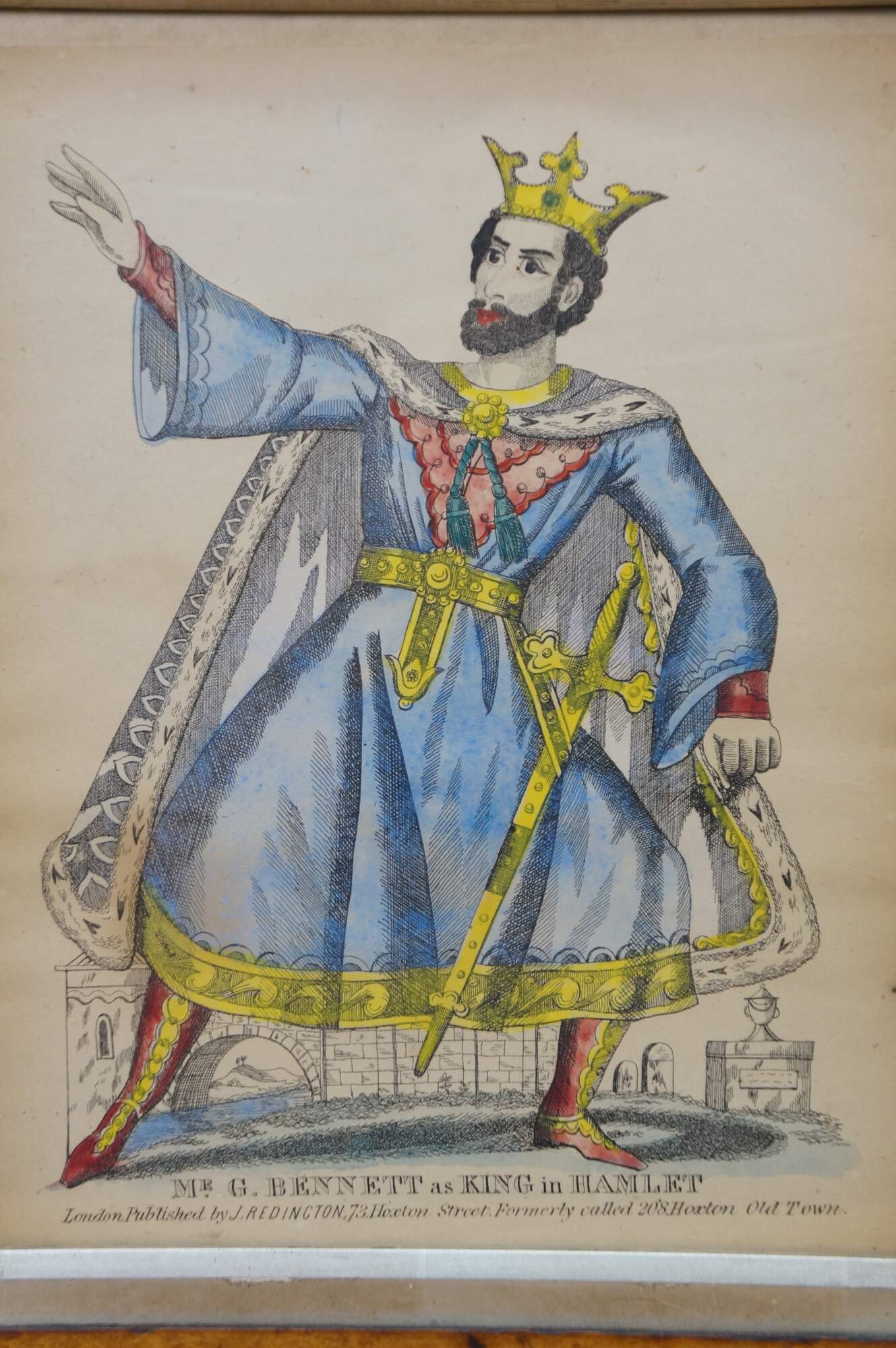 Set of four mid 19th century hand colored etchings / tinsel prints depicting actors dressed as figures from the works of Shakespeare and opera. Set includes: Mr G. Bennett as King in Hamlet, Mr Holloway as Richard the 3rd, Mr Creswick as Hamlet No 112 (London Published by J. Redington, 73 Hoxton Street, Formerly called 208 Hoxton Old Town), and Manrico in Il Trovatore (London Pub. by J. Redington, 208 Hoxton Old Town, Sold by J. Webb, Brick Lane St Lukes). Beveled wood frame with silver gilt inner border. Circa 1840s-1870s.