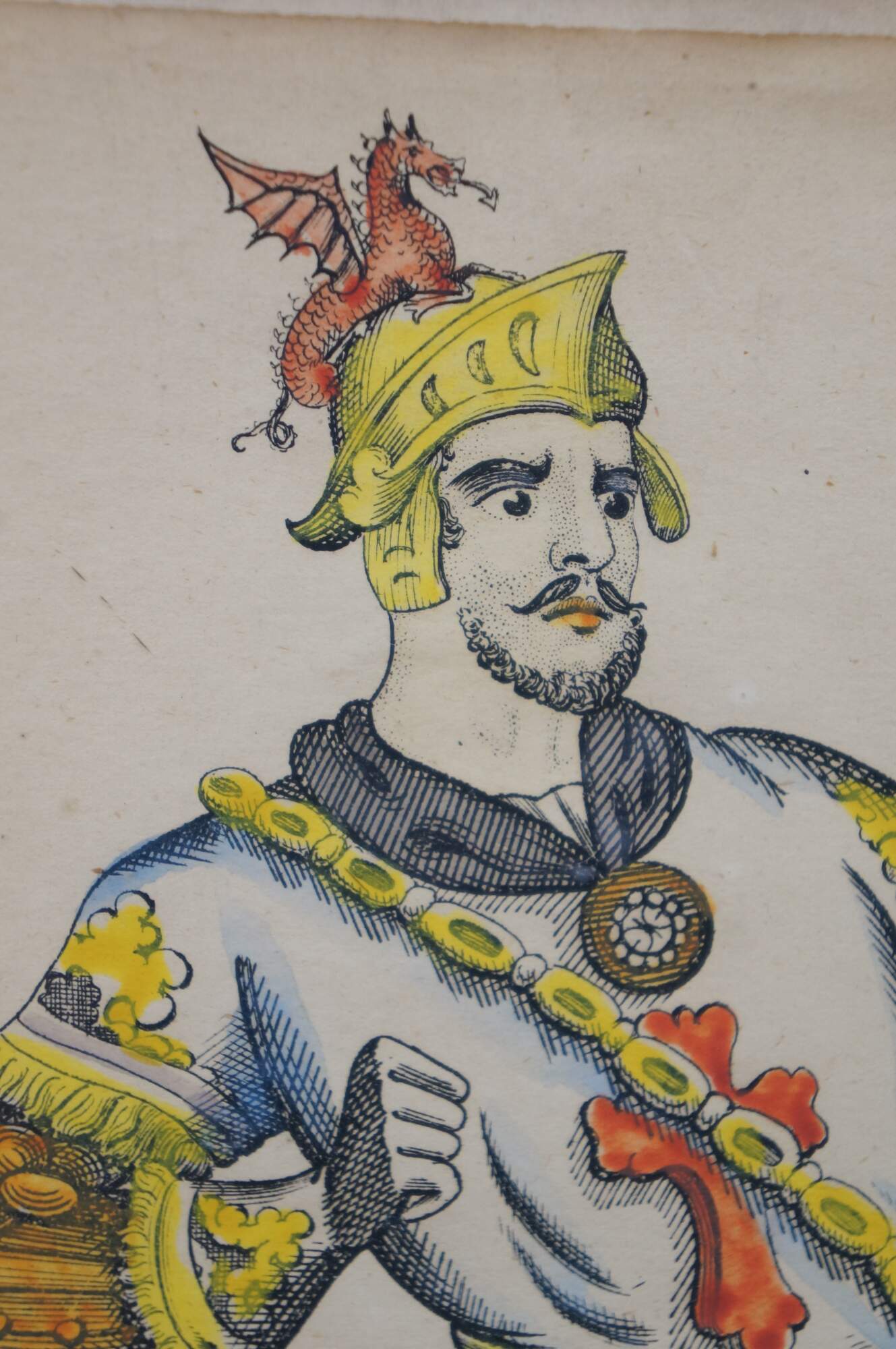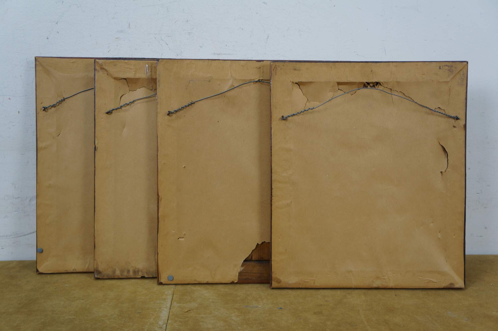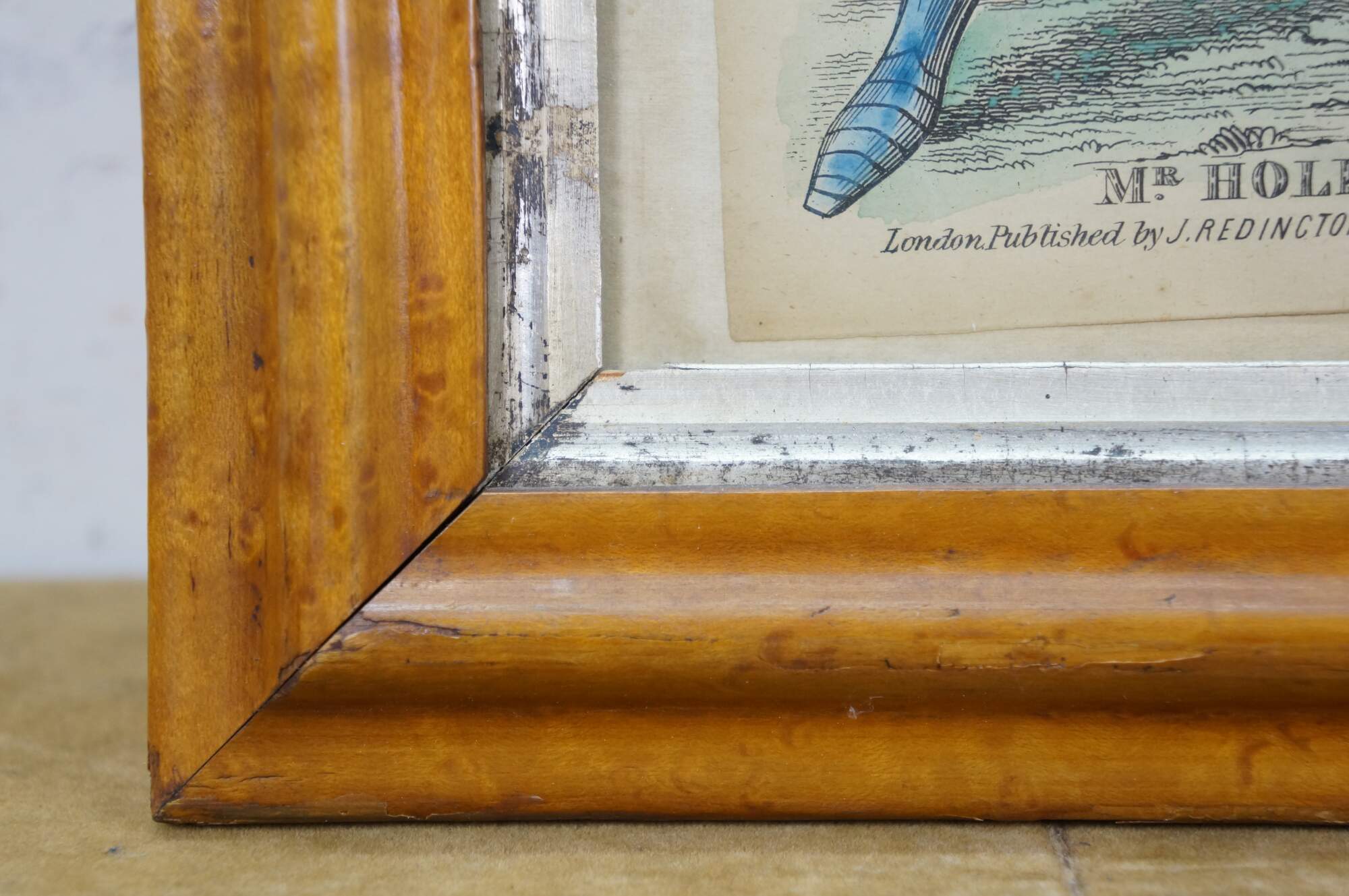 Set of four mid 19th century hand colored etchings / tinsel prints depicting actors dressed as figures from the works of Shakespeare and opera. Set includes: Mr G. Bennett as King in Hamlet, Mr Holloway as Richard the 3rd, Mr Creswick as Hamlet No 112 (London Published by J. Redington, 73 Hoxton Street, Formerly called 208 Hoxton Old Town), and Manrico in Il Trovatore (London Pub. by J. Redington, 208 Hoxton Old Town, Sold by J. Webb, Brick Lane St Lukes). Beveled wood frame with silver gilt inner border. Circa 1840s-1870s.