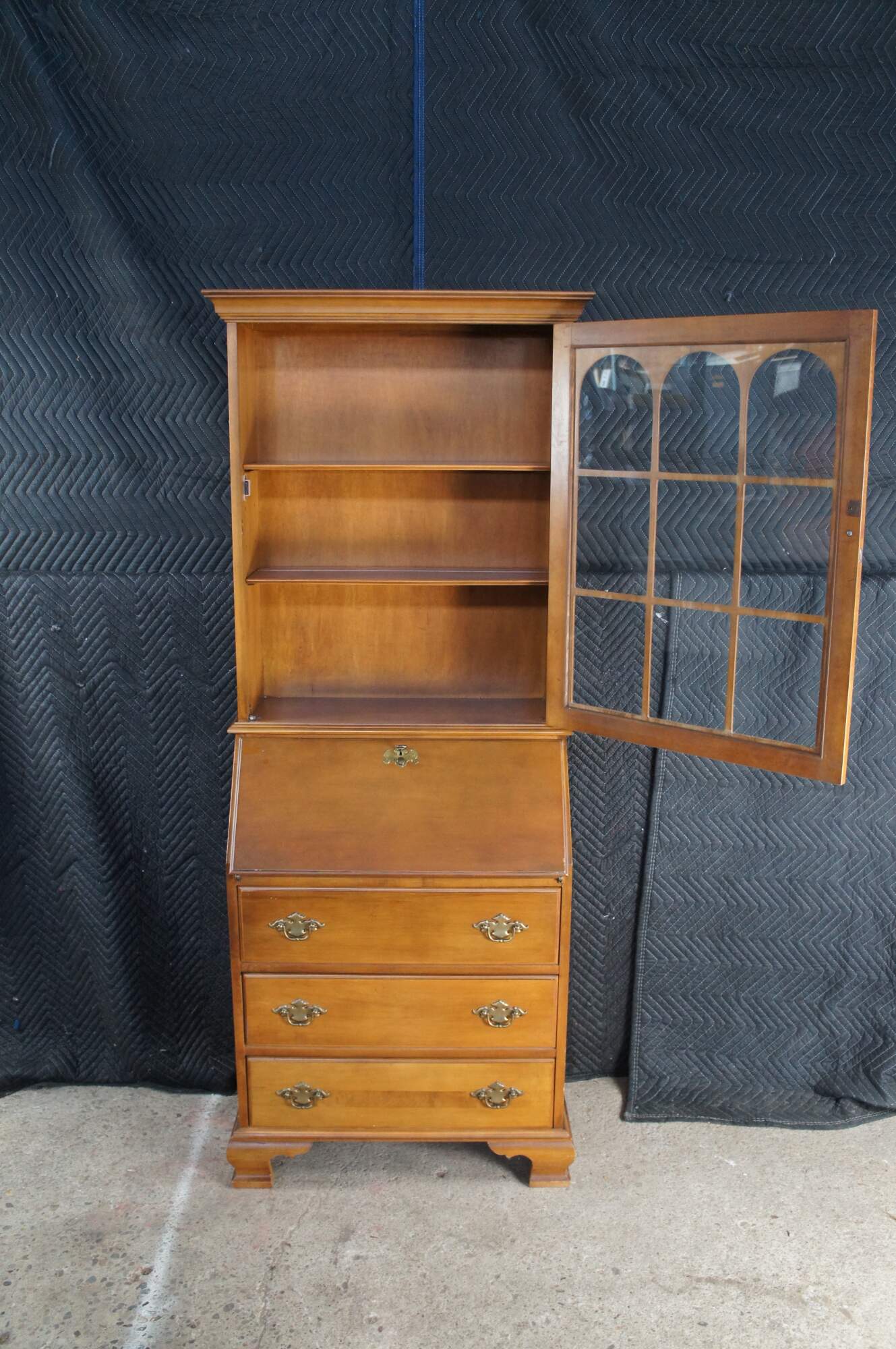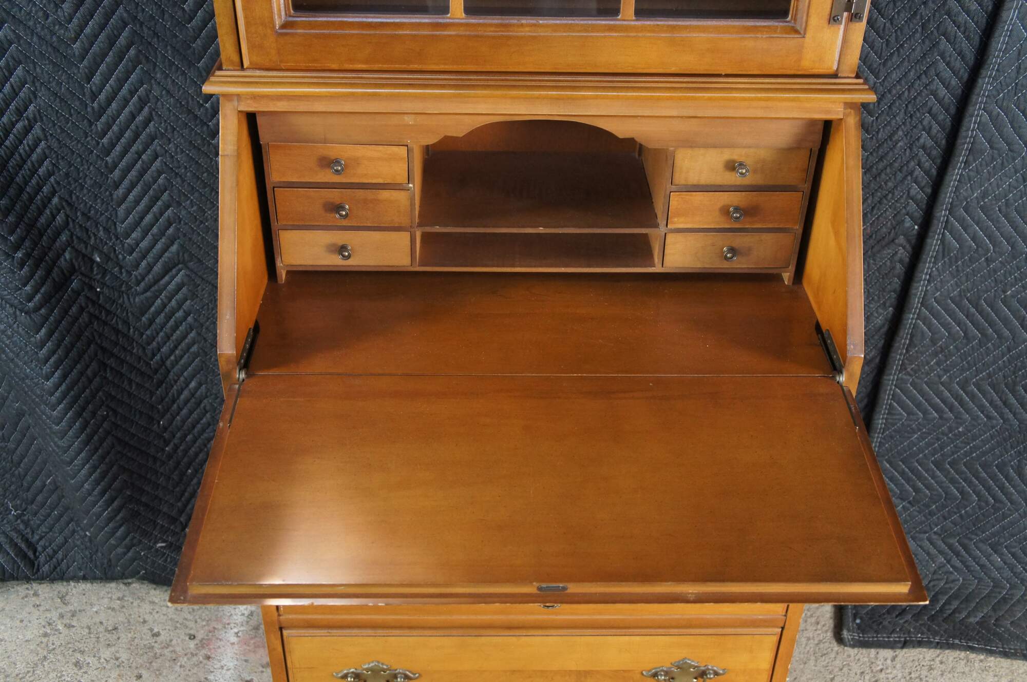A Petite Secretary Desk & Bookcase by Jasper Cabinet Company of Indiana. Circa 1980s. Features a maple case crafted in colonial styling with an arcaded glass front door opening to three shelves over a drop front secretary with six drawers and two cubies. The lower portion of the case has three dovetailed drawers with colonial style brass bale hardware. The secretary is supported by bracket feet. Great for use in a library, office or study.