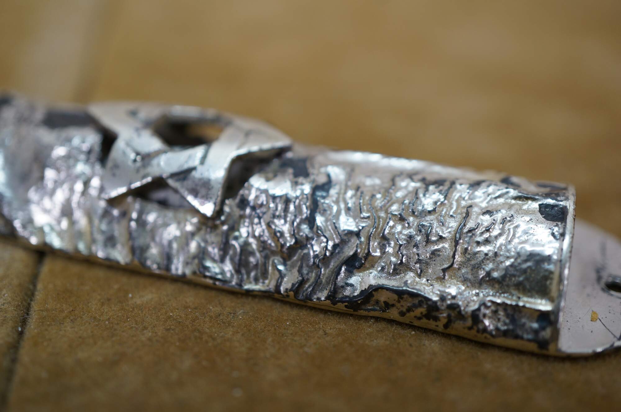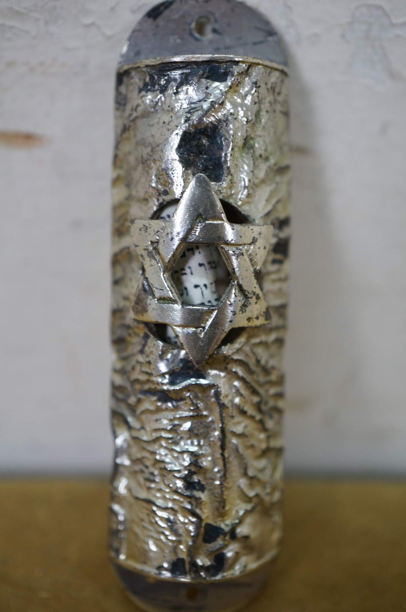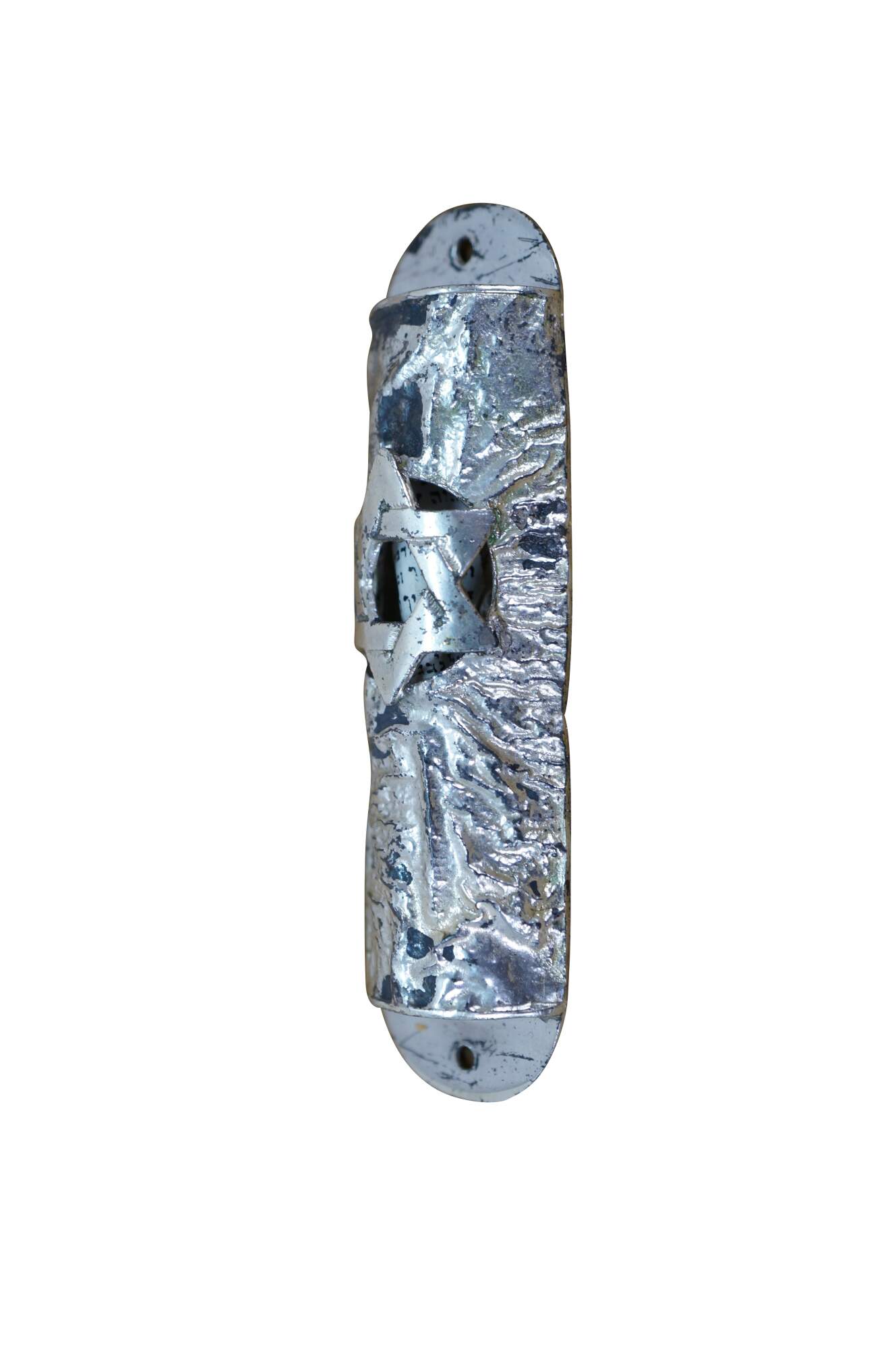 Vintage Lowry sterling silver mezuzah with Torah scroll. Cylindrical shape with a tree bark texture and pierced Star of David providing a glimpse of the scroll inside. Marked Lowry Sterling on reverse.