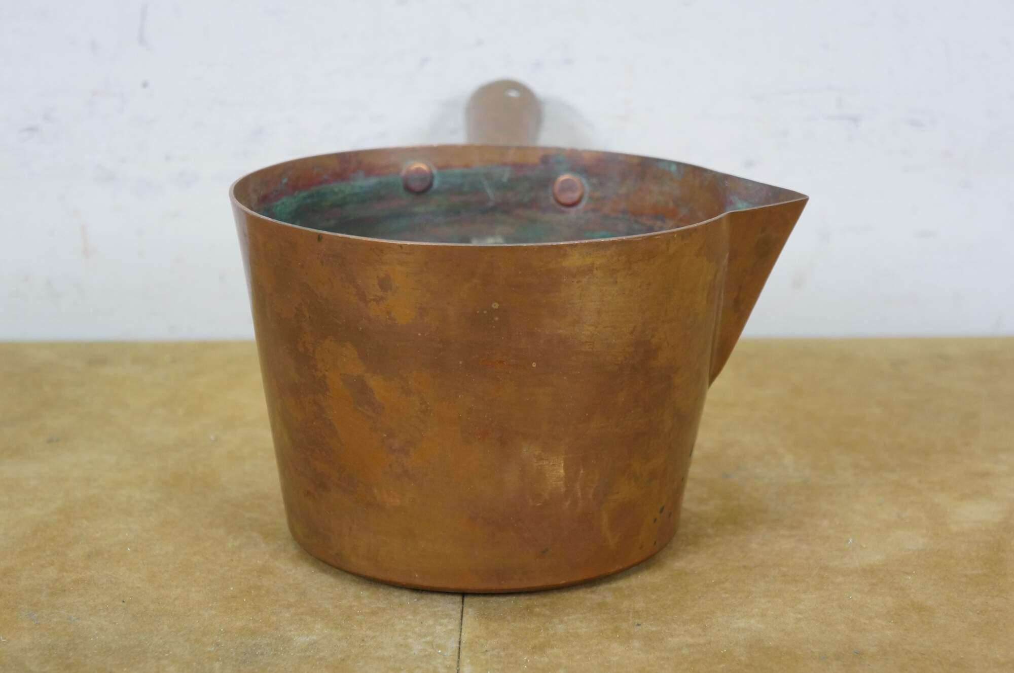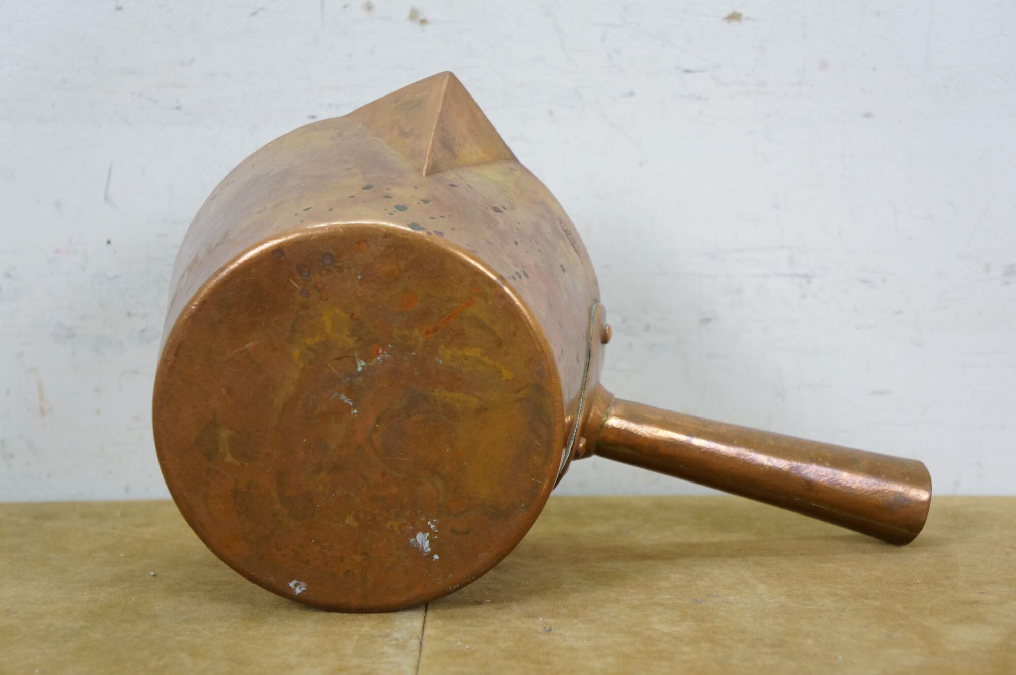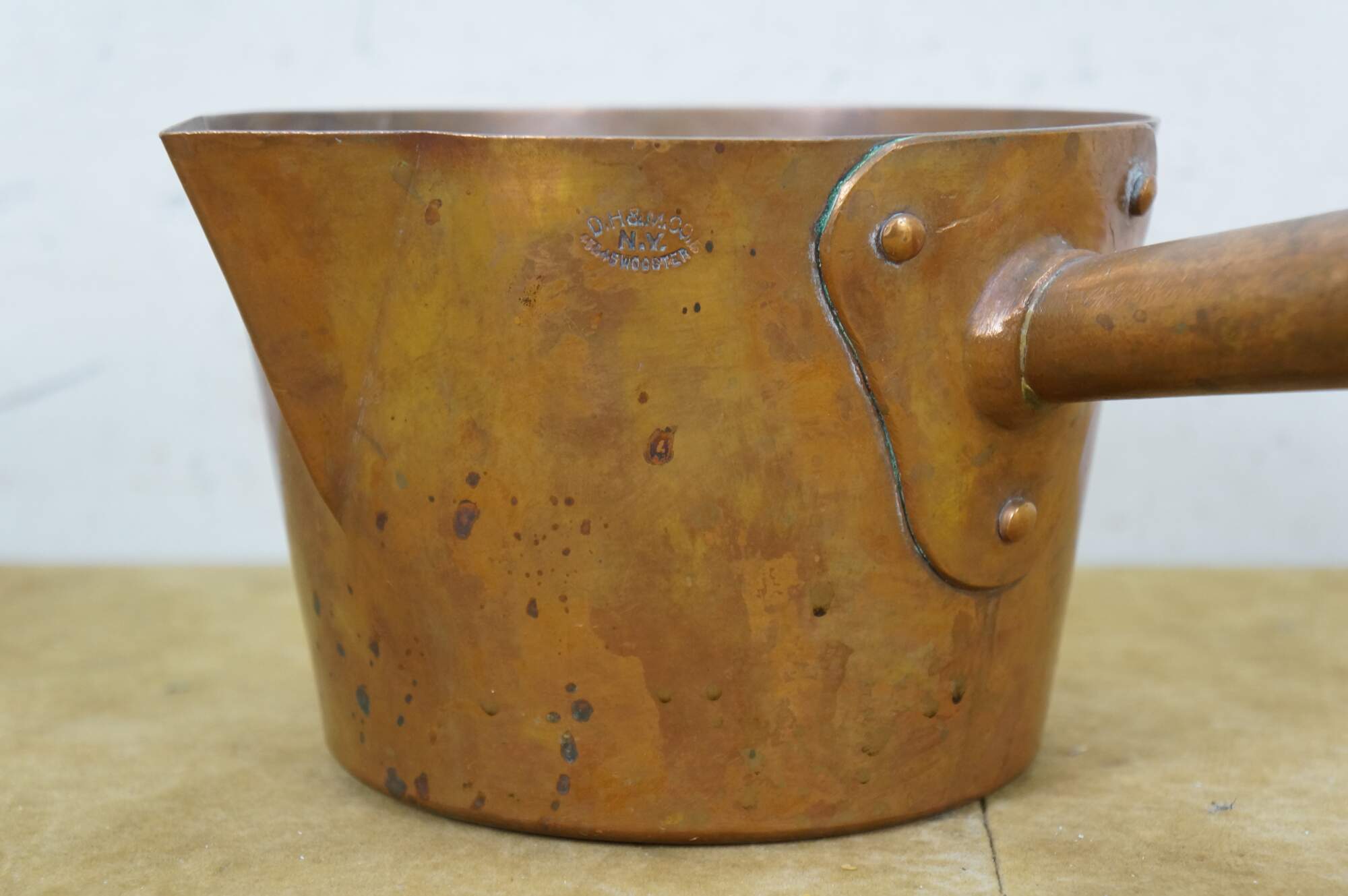 Mid 19th to early 20th century copper patisserie / sugar / candy making / jam pot by Duparquet, Huot & Moneuse Co. Round copper pan with slightly tapered base, triangular pour spout and hollow copper handle.