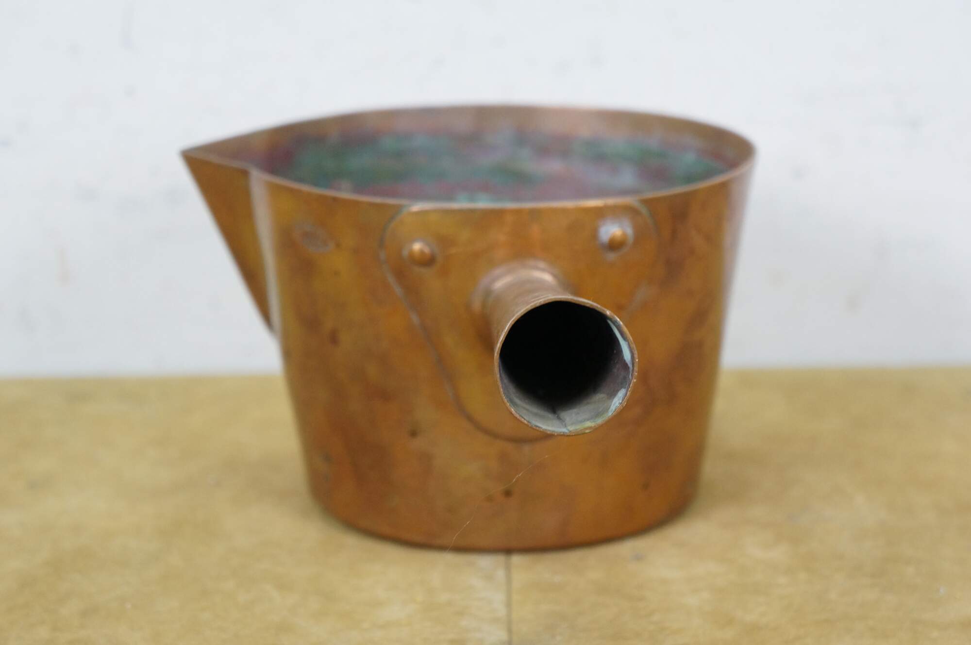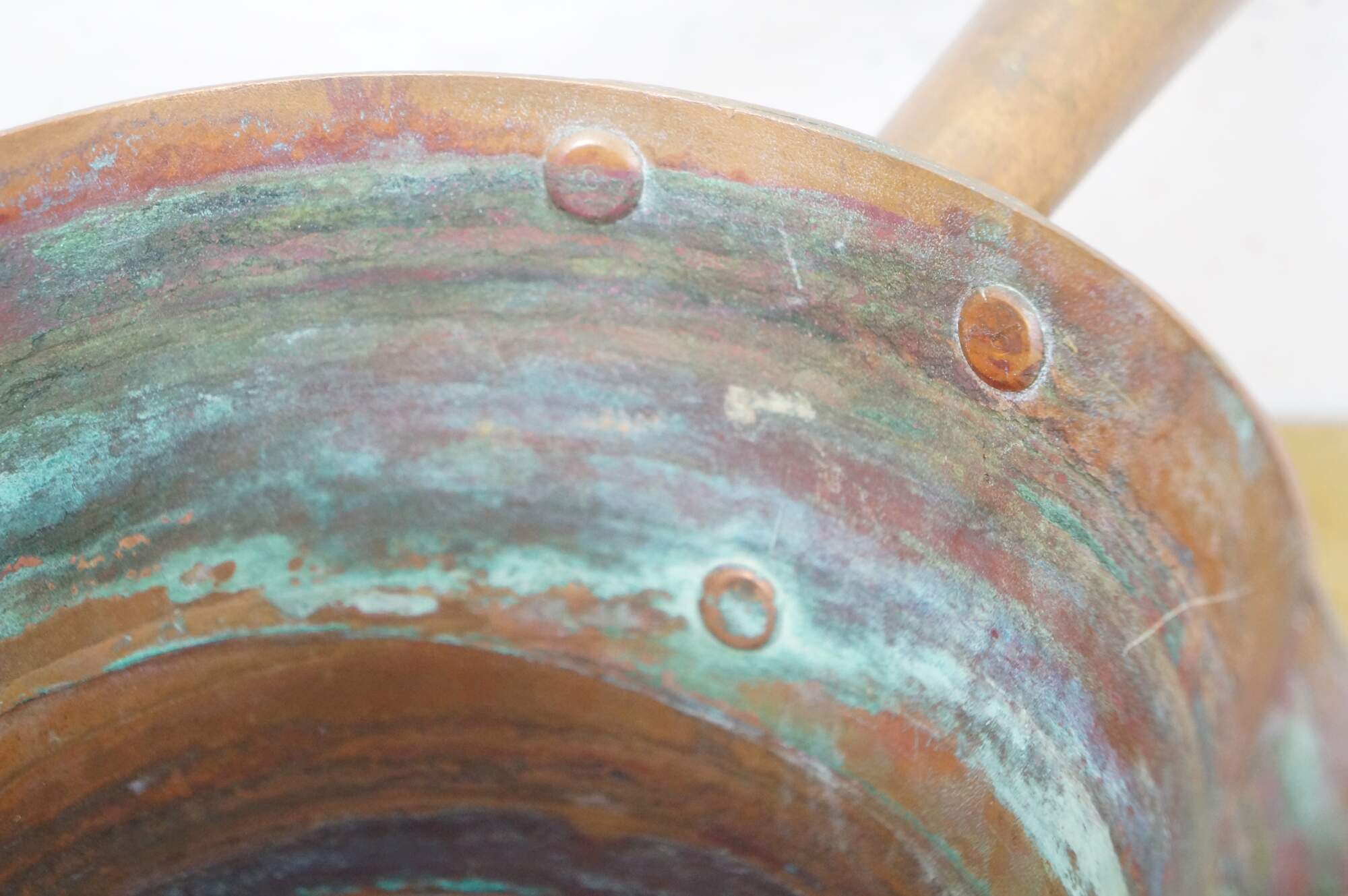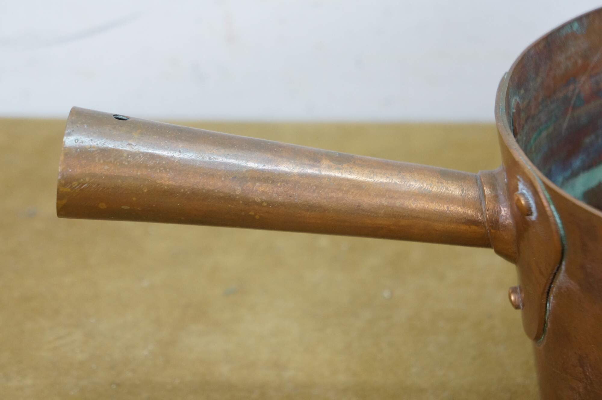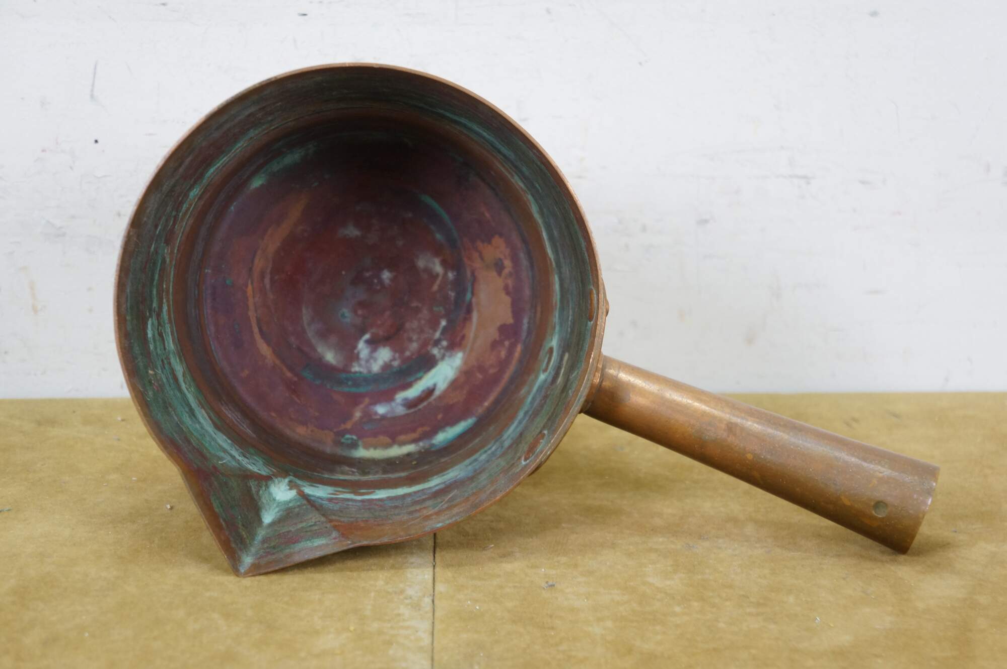 Mid 19th to early 20th century copper patisserie / sugar / candy making / jam pot by Duparquet, Huot & Moneuse Co. Round copper pan with slightly tapered base, triangular pour spout and hollow copper handle.