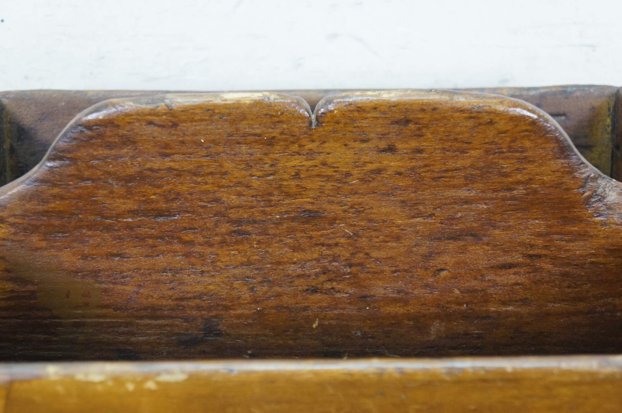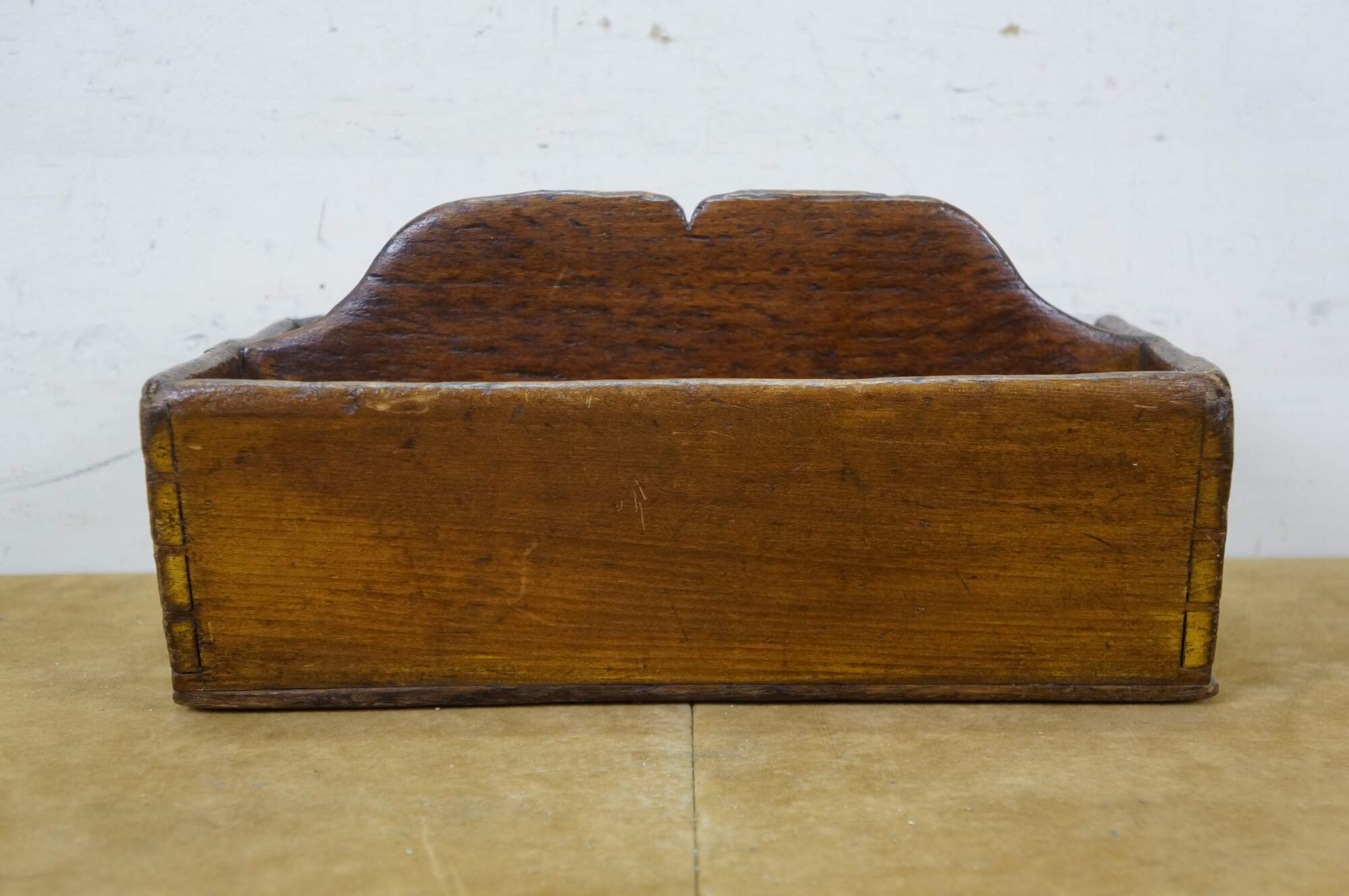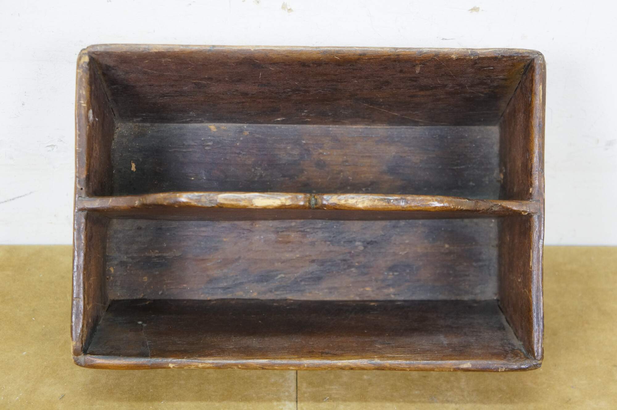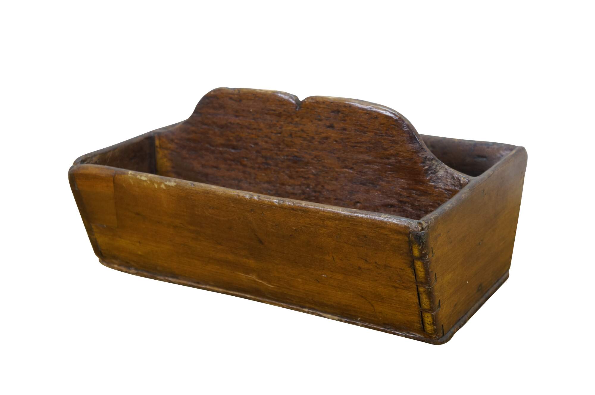 Primitive antique oak divided cutlery / knife tray / box / trug with raised carved center divider and hand cut dovetailed corners.
