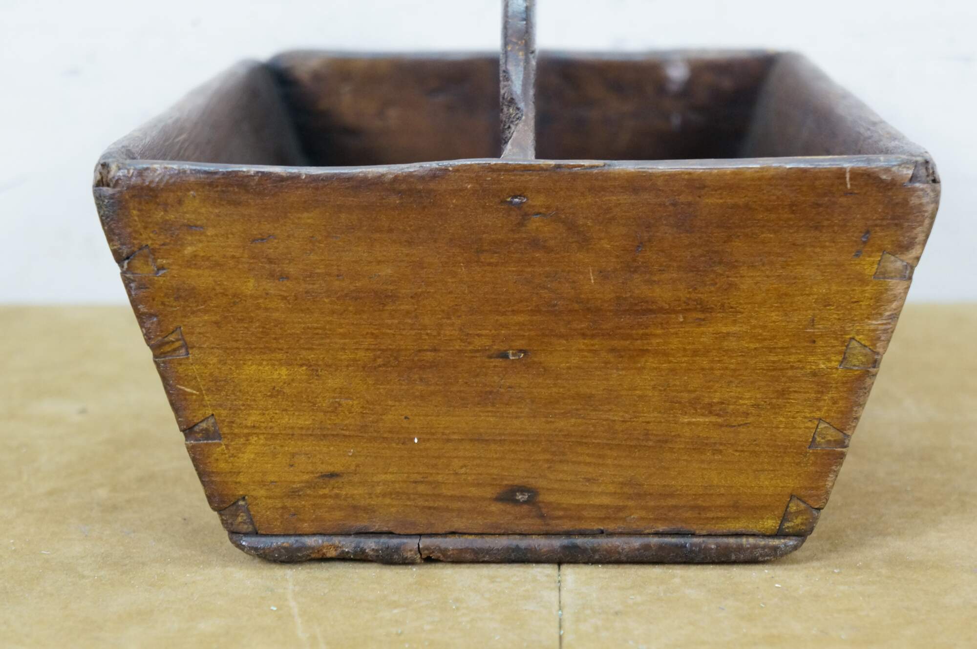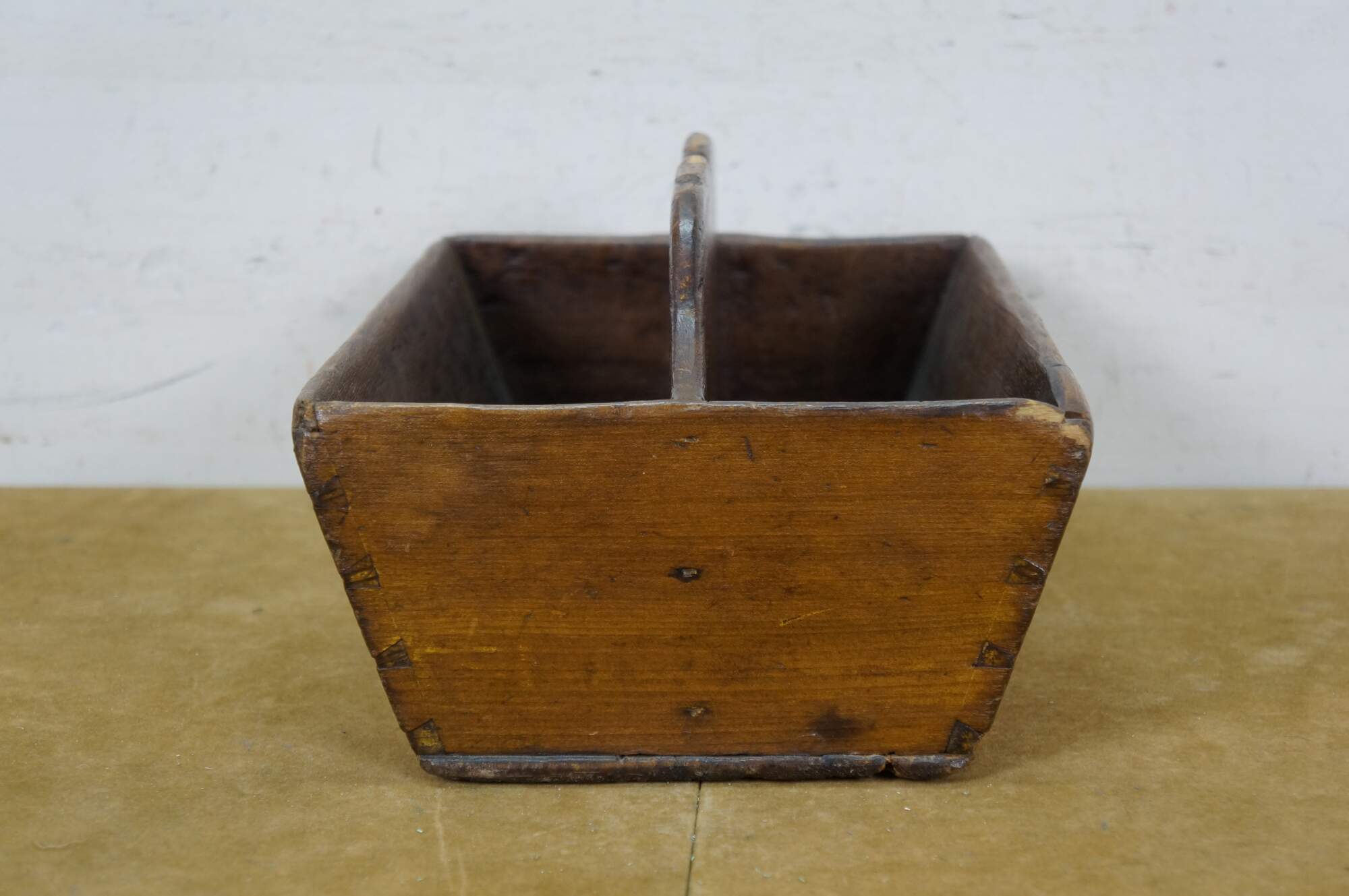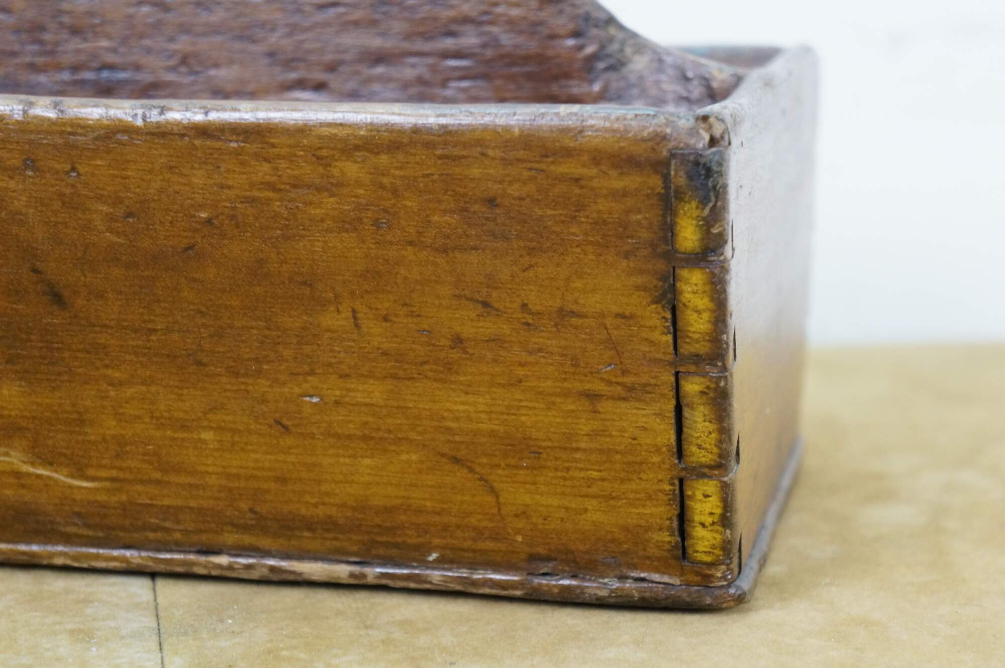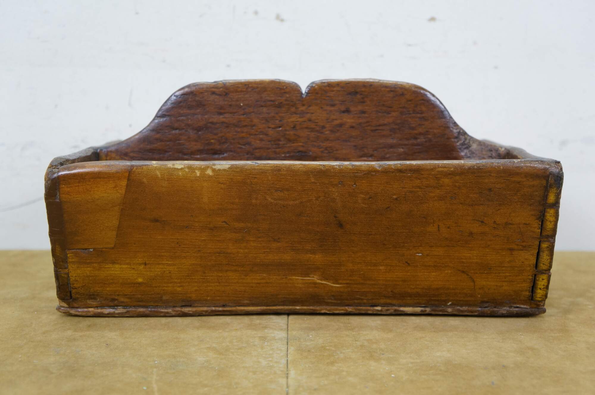 Primitive antique oak divided cutlery / knife tray / box / trug with raised carved center divider and hand cut dovetailed corners.
