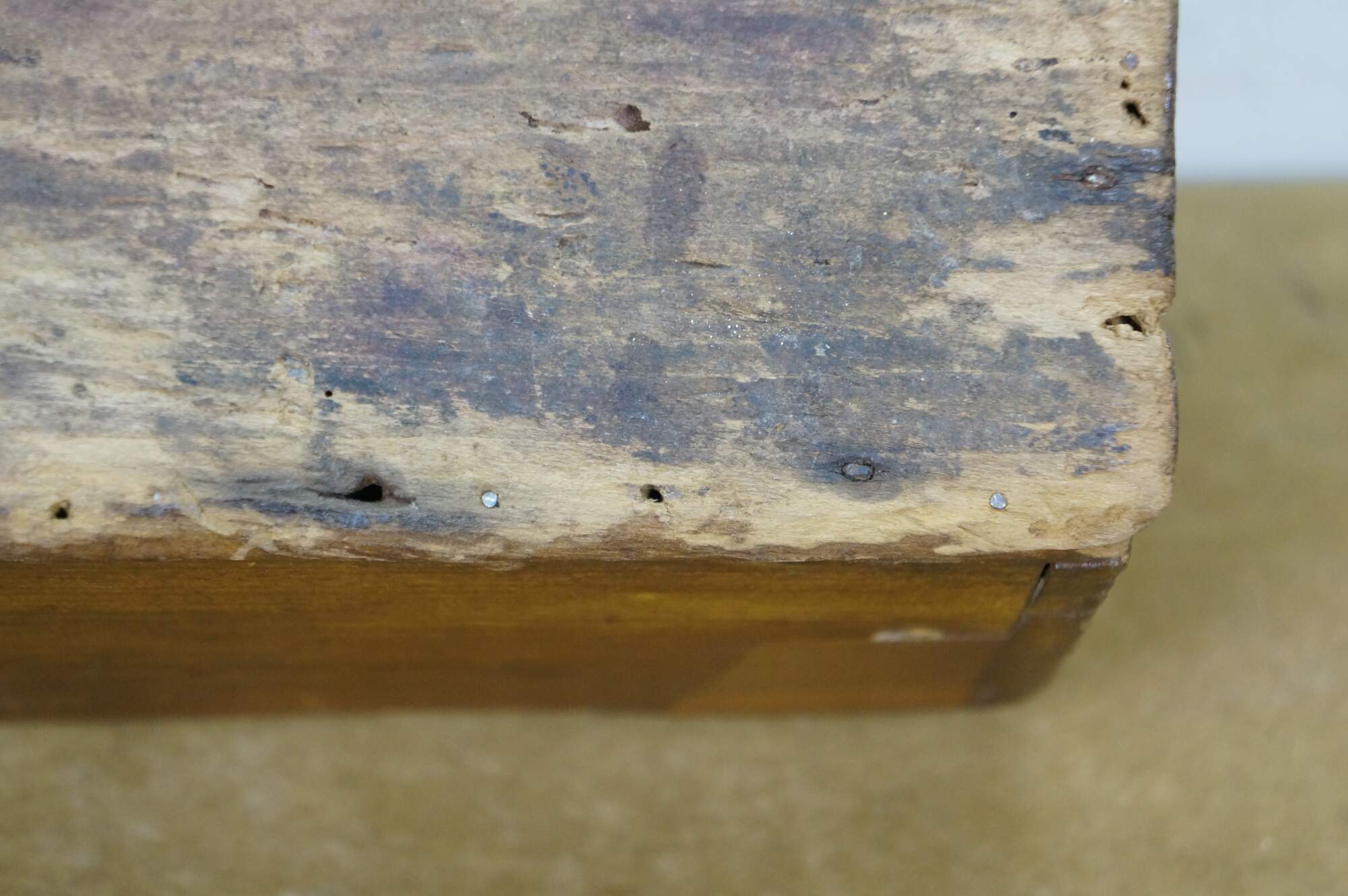 Structurally solid, past repairs, reinforcement, wear from age and use, scuffing, splitting.