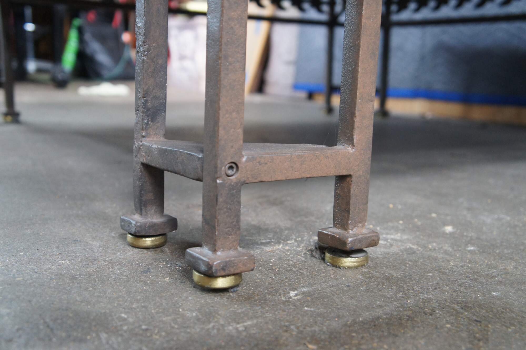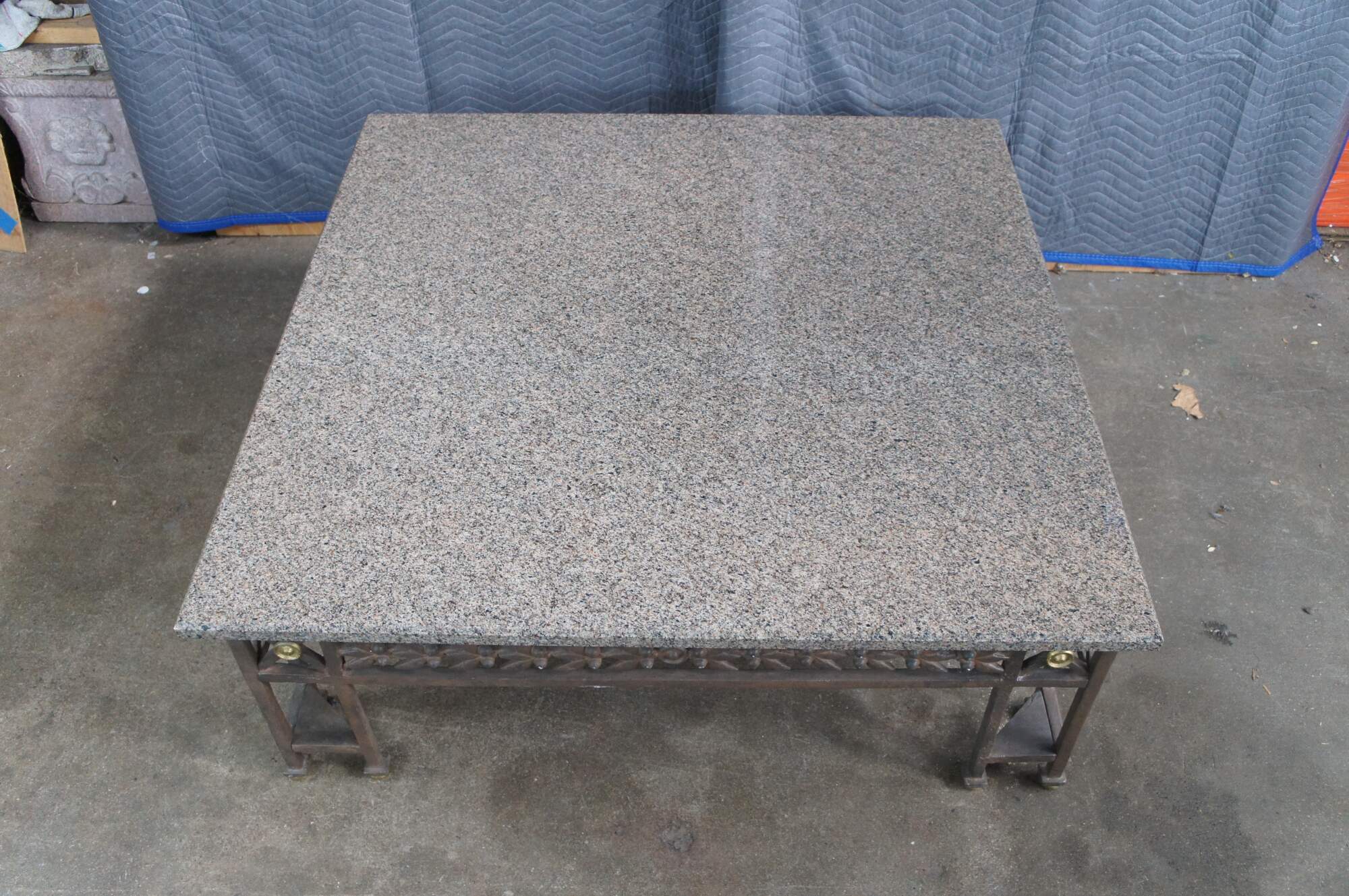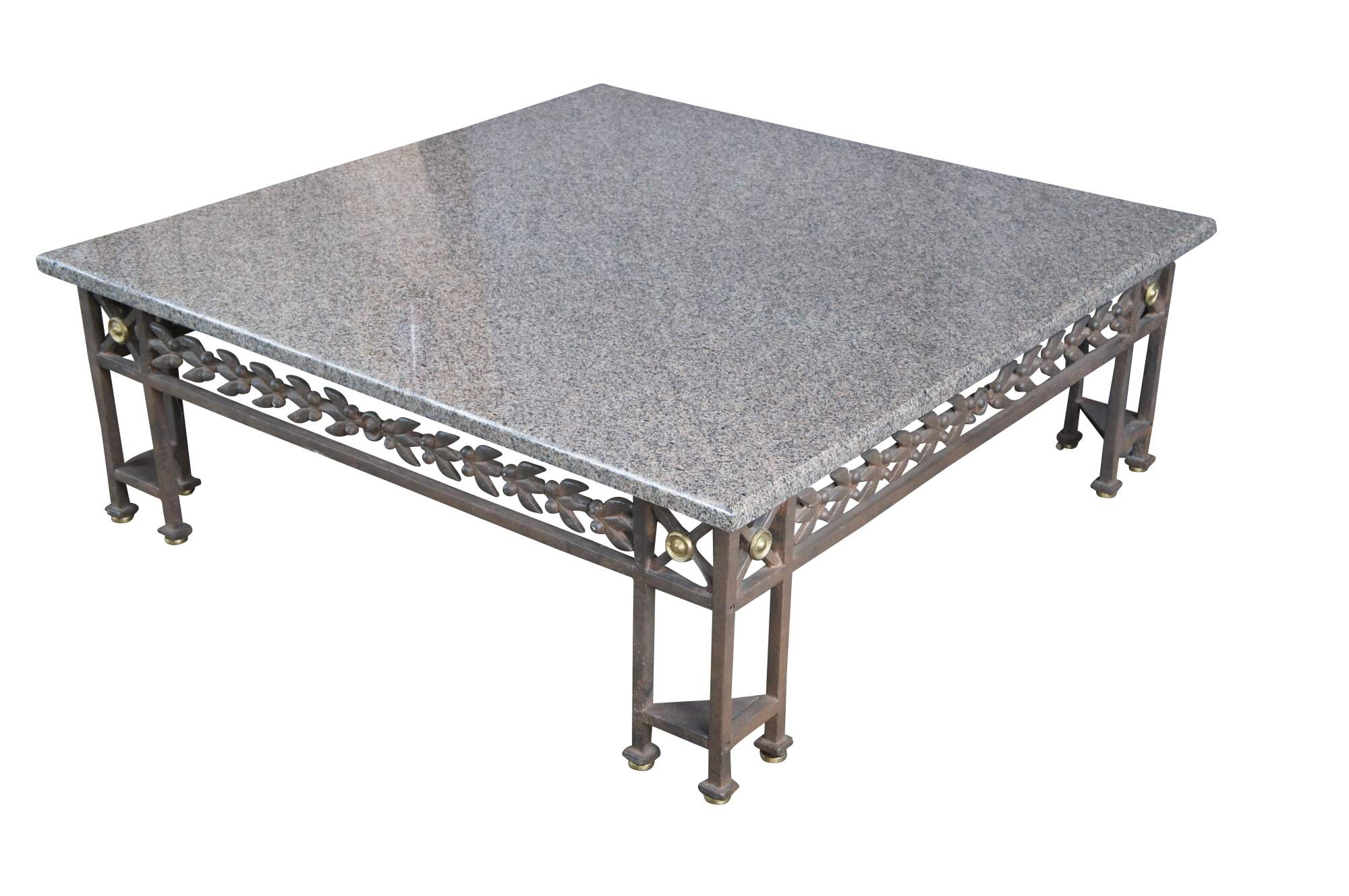 Impressive late 20th century Neoclassical Directoire style coffee / cocktail table featuring a wrought iron base with a foliate leaf design, gold rosette medallions, and a large granite stone top with beveled edge.