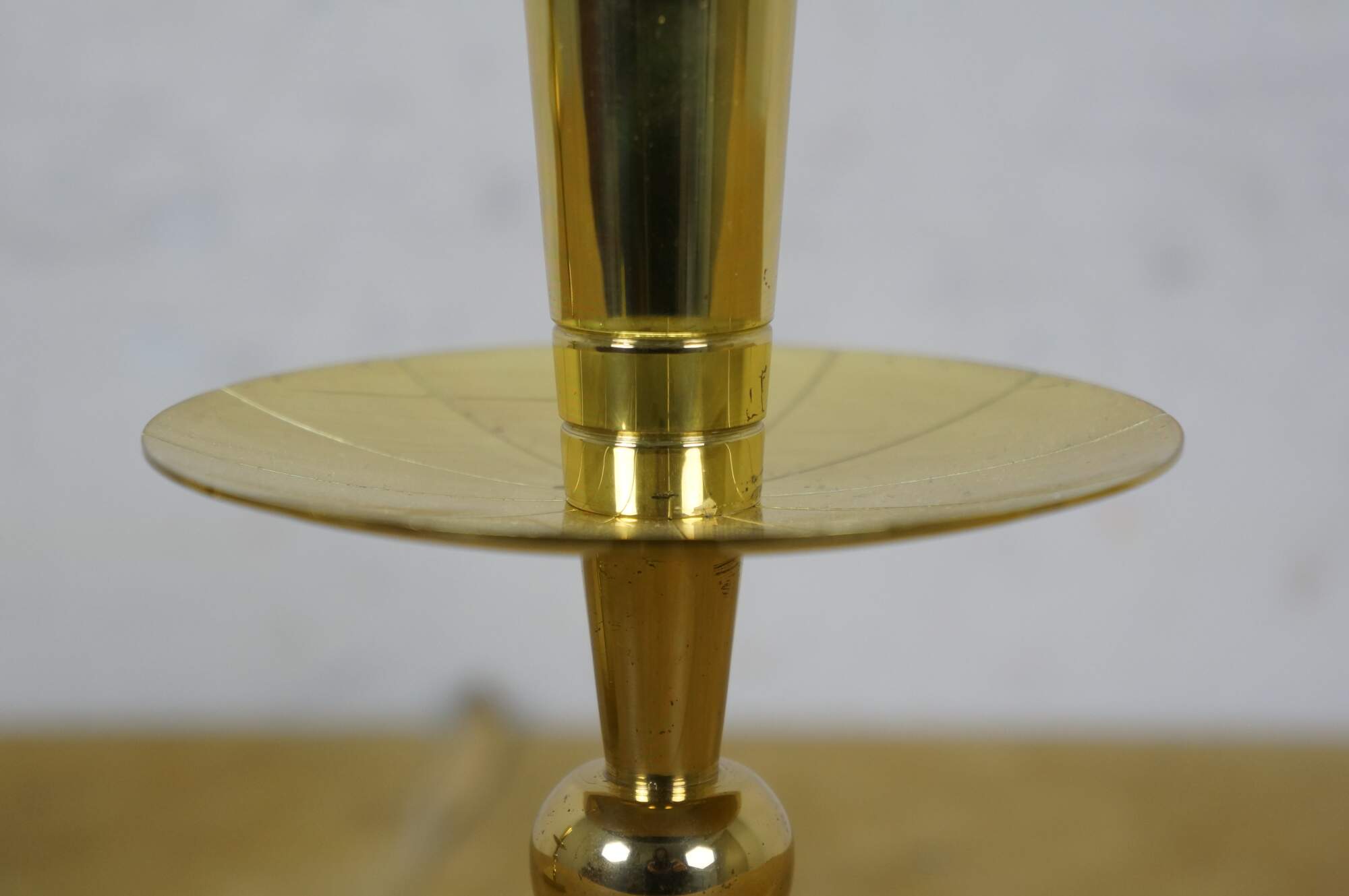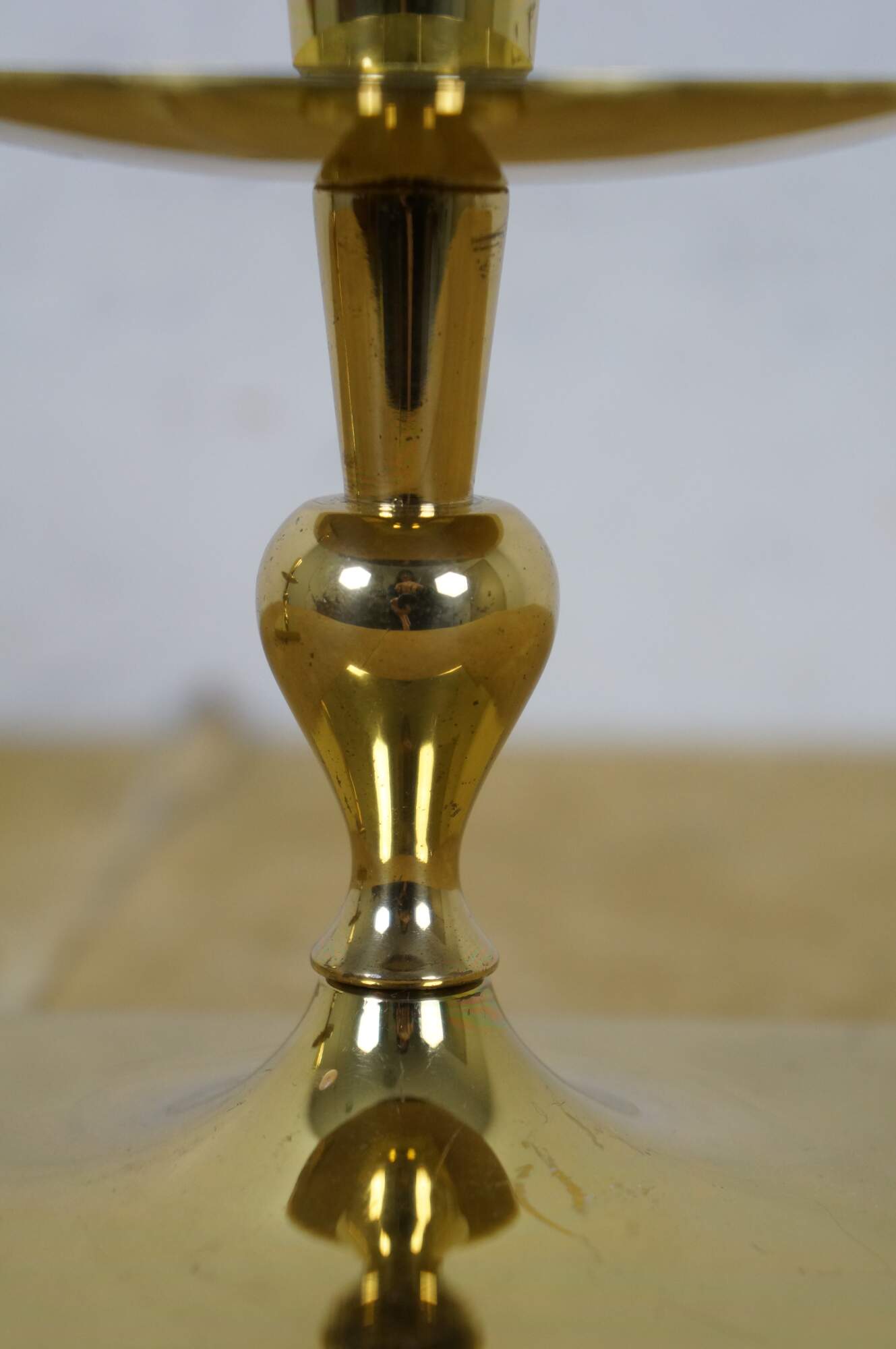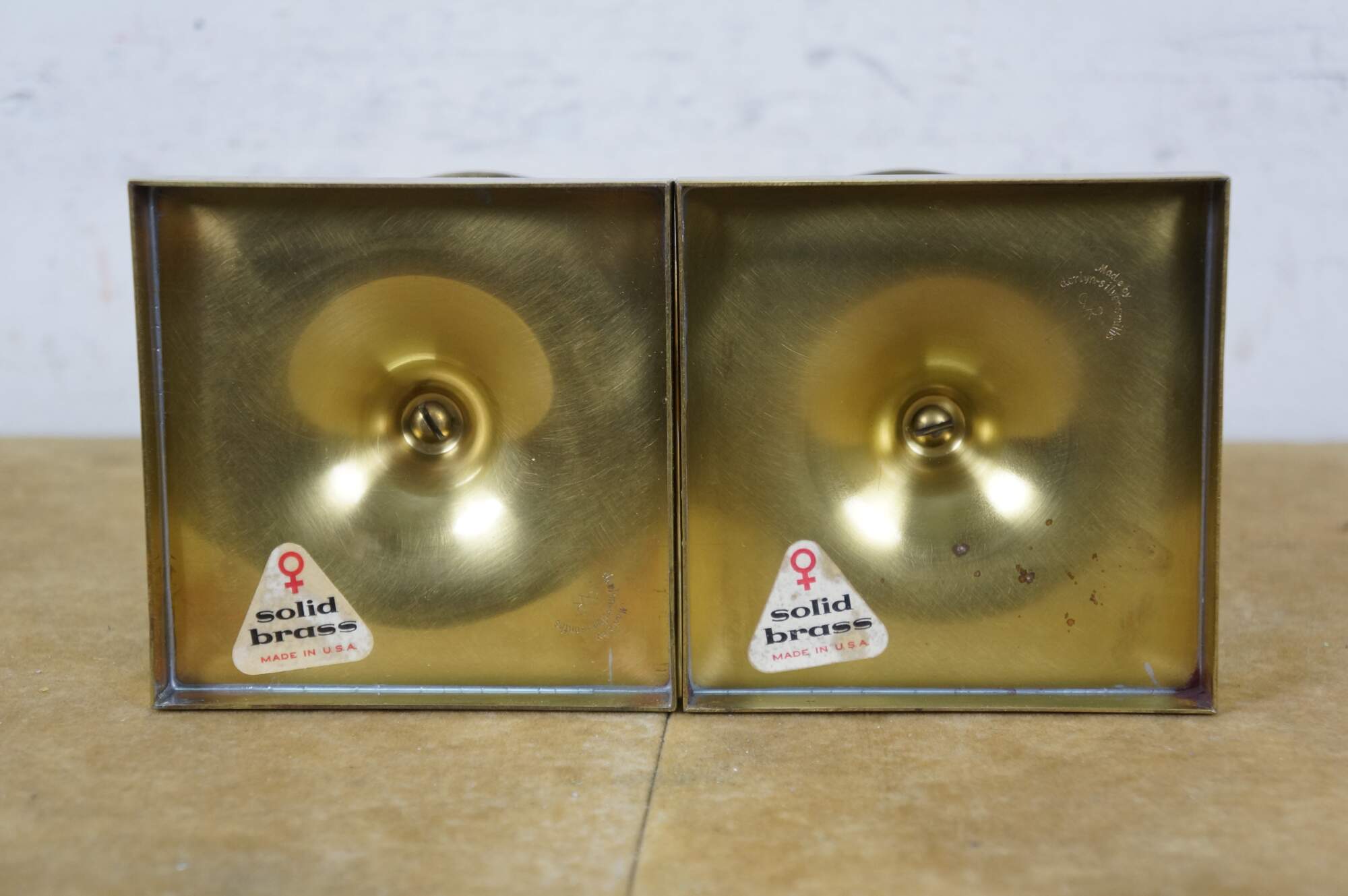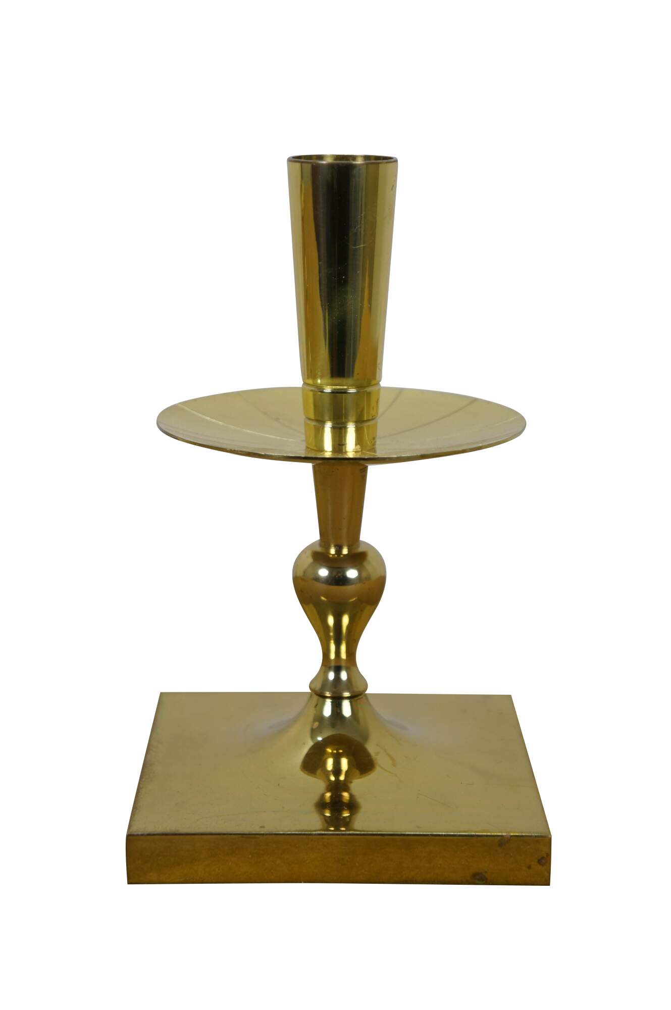 Pair of circa 1950's-1960's solid brass candlesticks / single taper candlestick holders, designed by Tommi Parzinger, made by Dorlyn Silversmiths. Square base with vase shaped body leading to a grooved round drip pan and smoothly tapered candle cups. Made in USA.