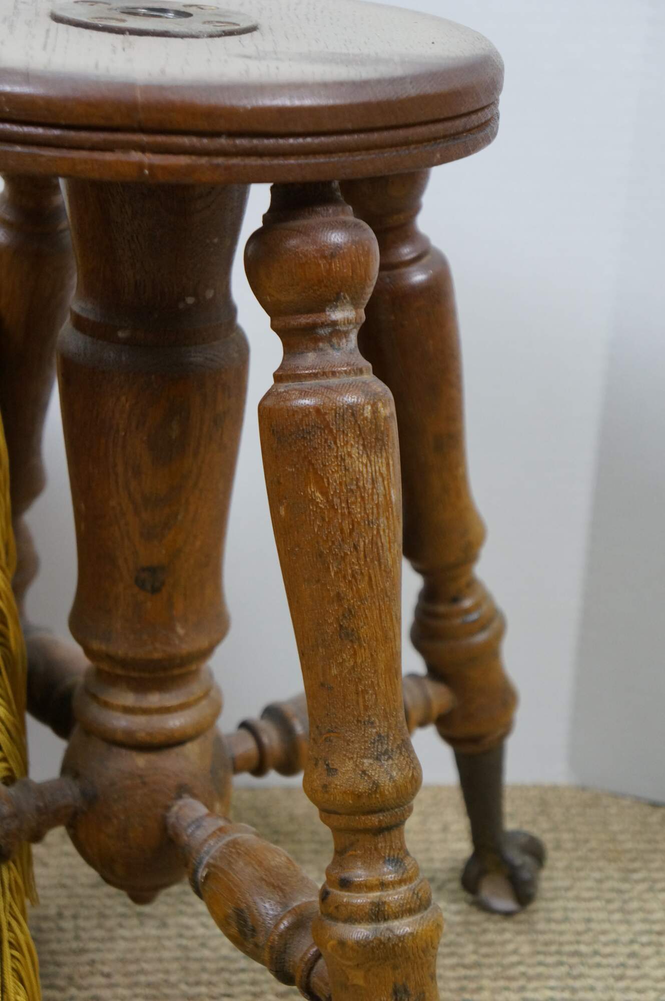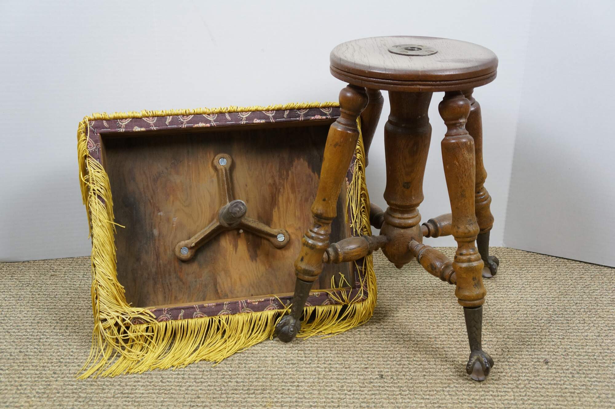 Circa late 19th century piano stool / foot rest / ottoman featuring four turned legs with glass ball and claw feet and rectangular seat upholstered in purple and gold floral brocade with golden fringe and nailhead trim. Seat unscrews from center post to adjust height.