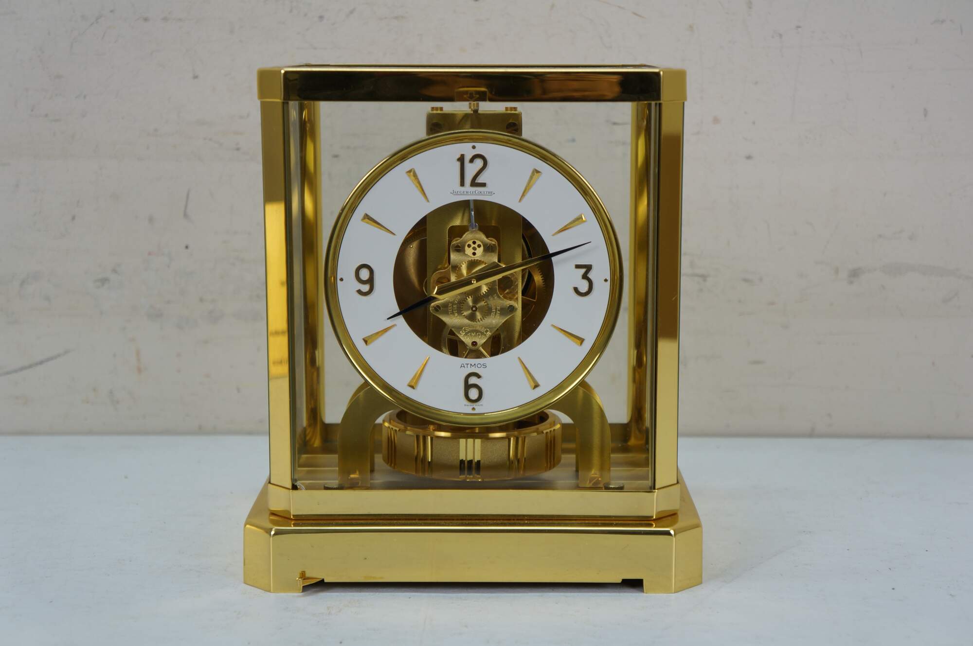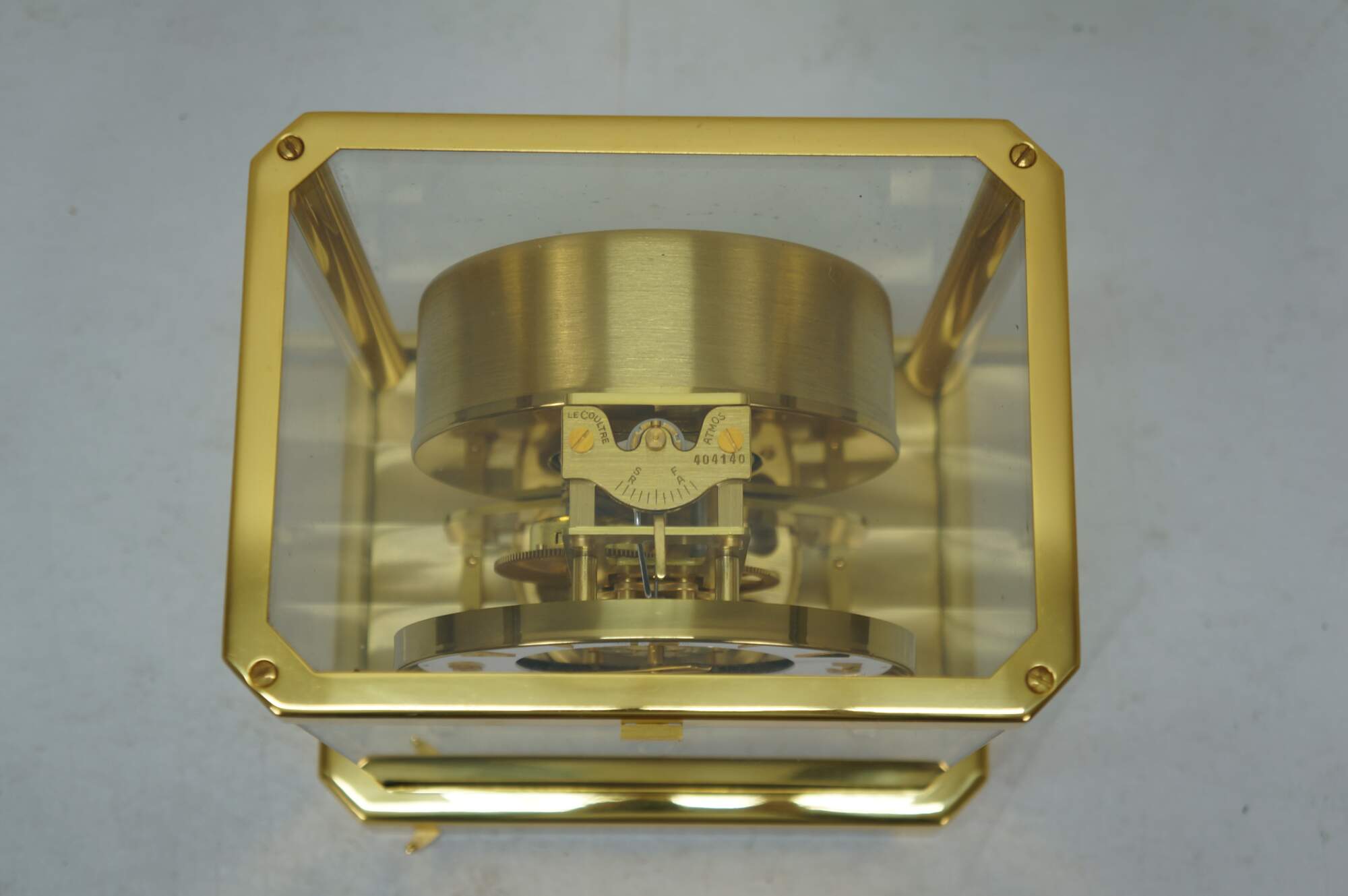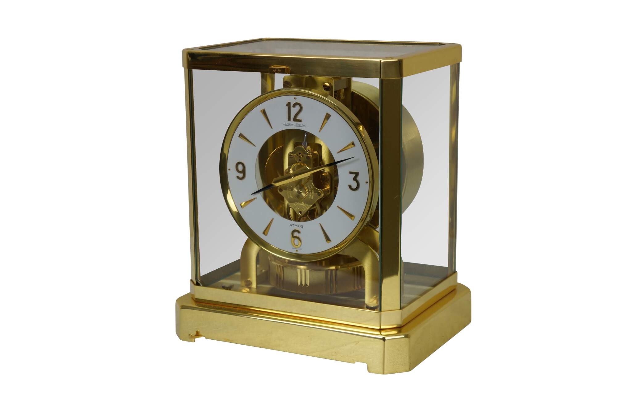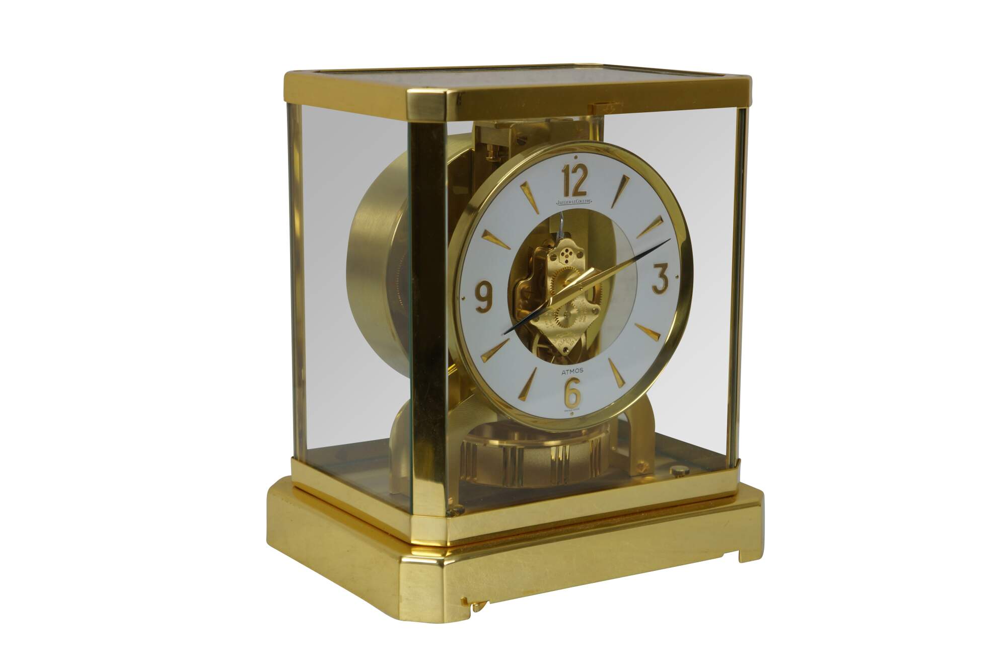Circa 1960s Jaeger-Le Coultre Atmos perpetual motion mantel clock. Bright polished brass frame with glass sides. White face with gold tone Arabic numerals, pips and hands. Le Coultre & Cie - Metal - Caliber 528-8 - Swiss - C. Falt & Co. Serial Number: 404140. Fifteen 15 Jewels VXN - Switzerland Unadjusted - 528/1. Includes brass shop display plaque.