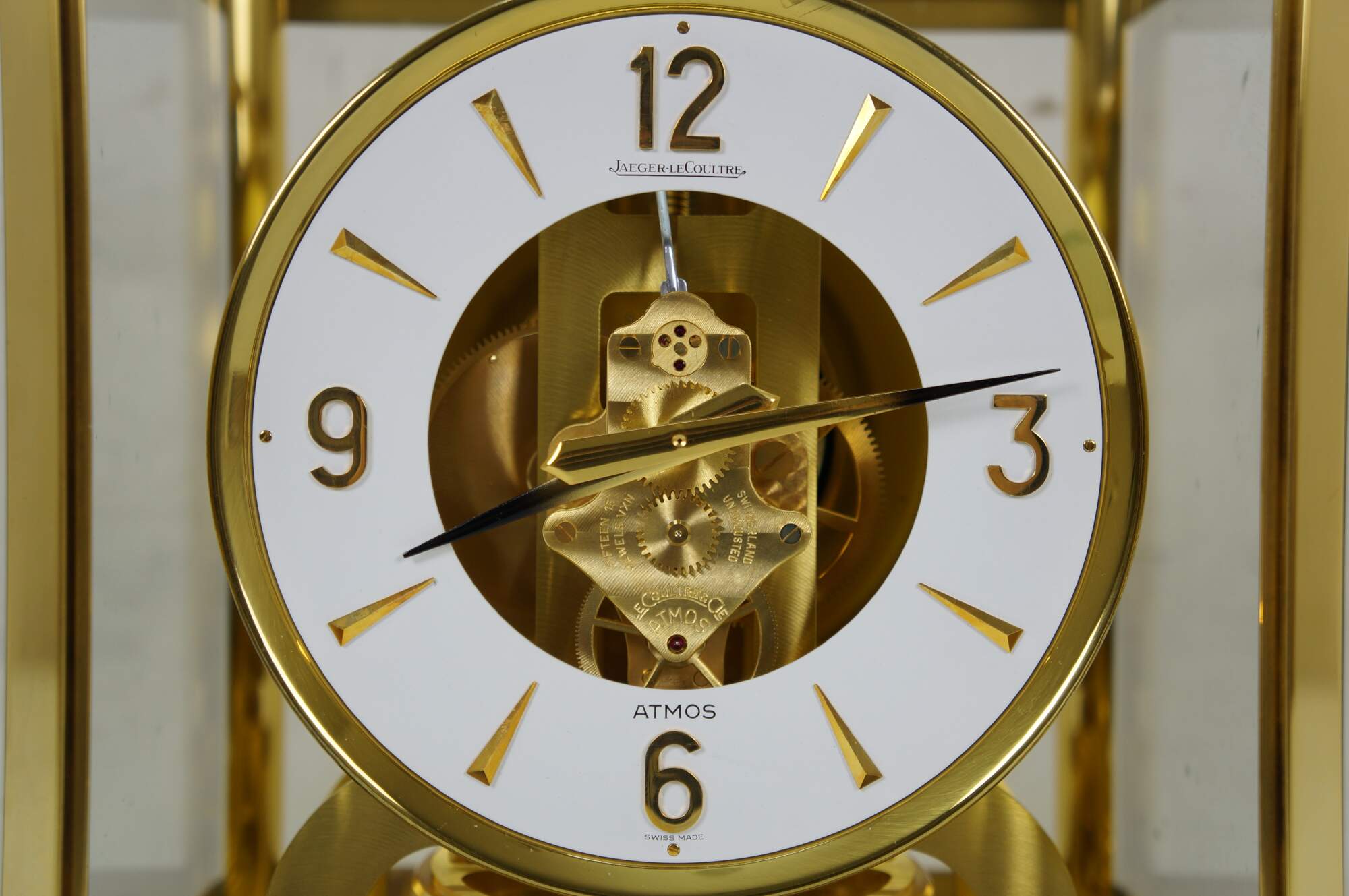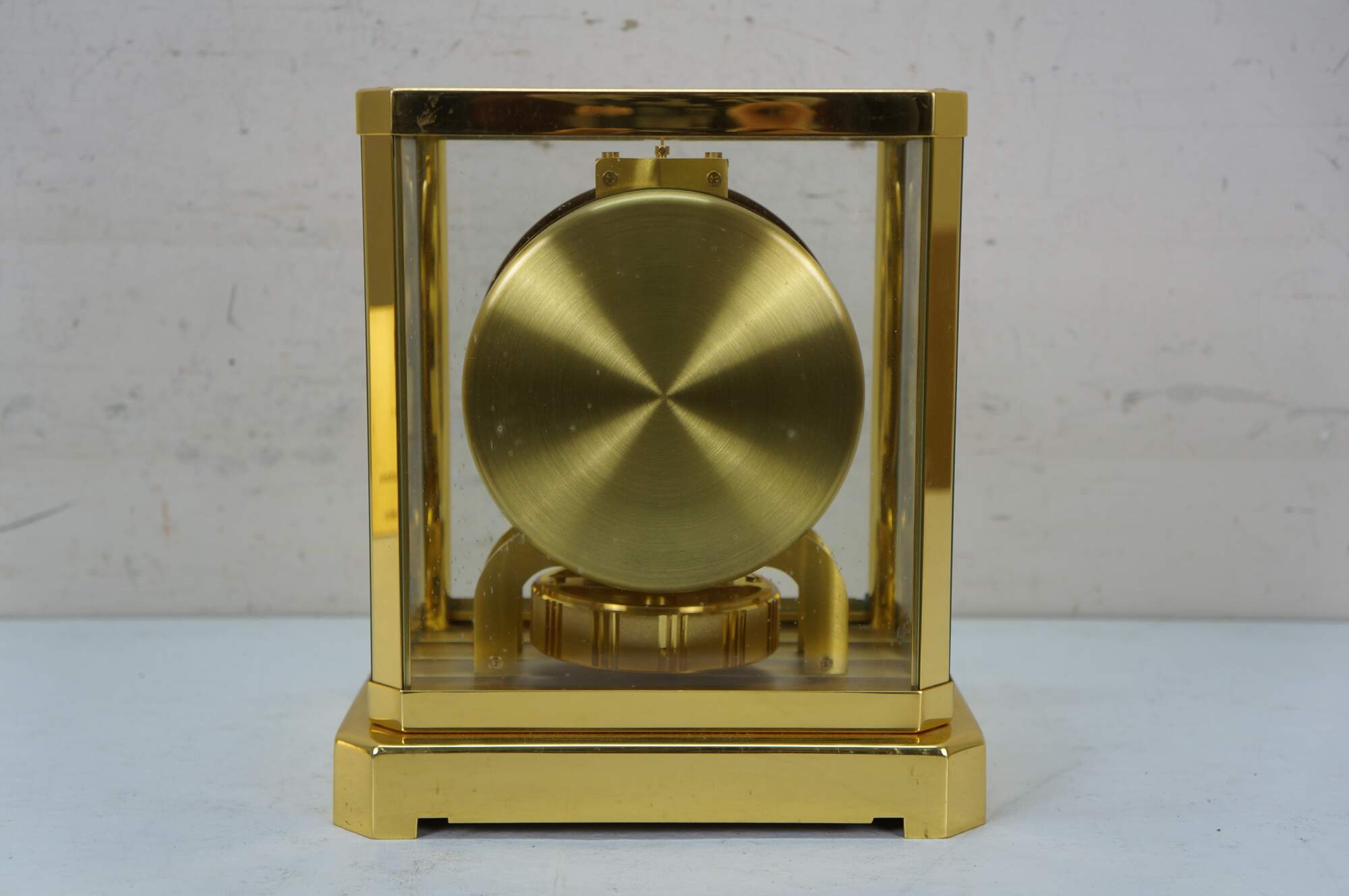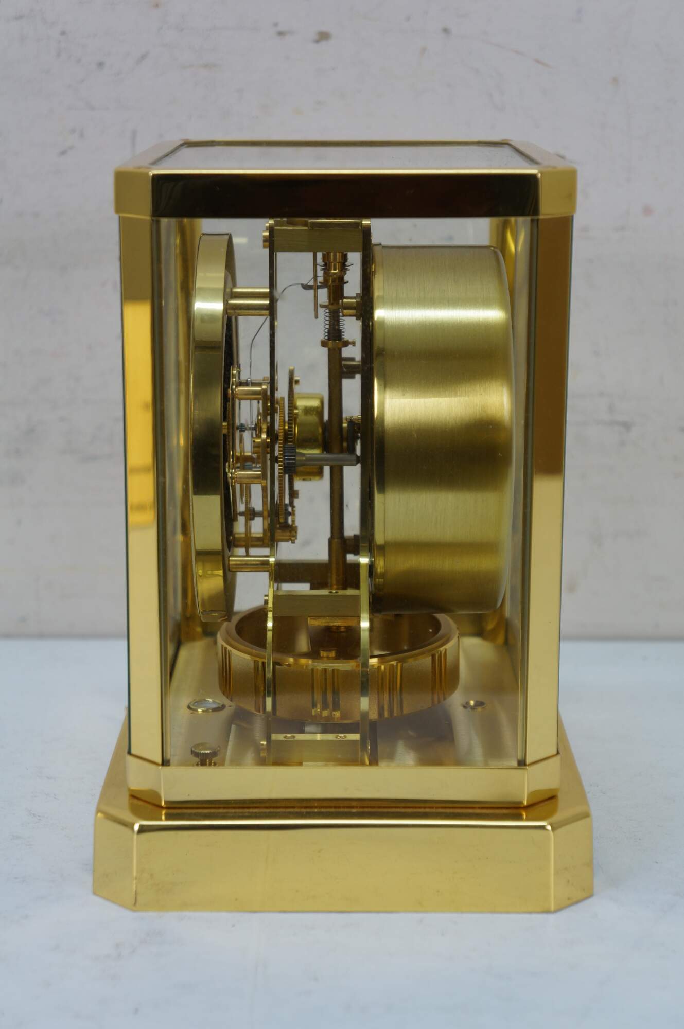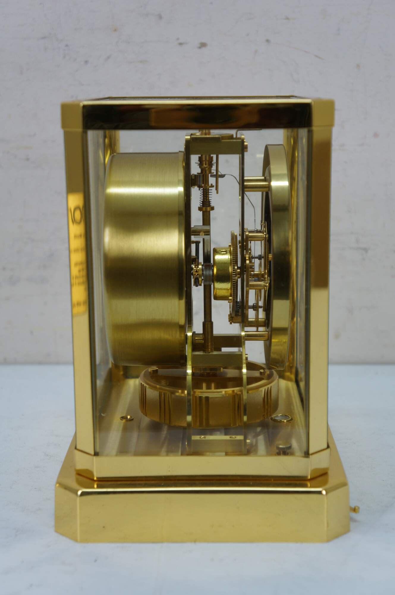 Circa 1960s Jaeger-Le Coultre Atmos perpetual motion mantel clock. Bright polished brass frame with glass sides. White face with gold tone Arabic numerals, pips and hands. Le Coultre & Cie - Metal - Caliber 528-8 - Swiss - C. Falt & Co. Serial Number: 404140. Fifteen 15 Jewels VXN - Switzerland Unadjusted - 528/1. Includes brass shop display plaque.