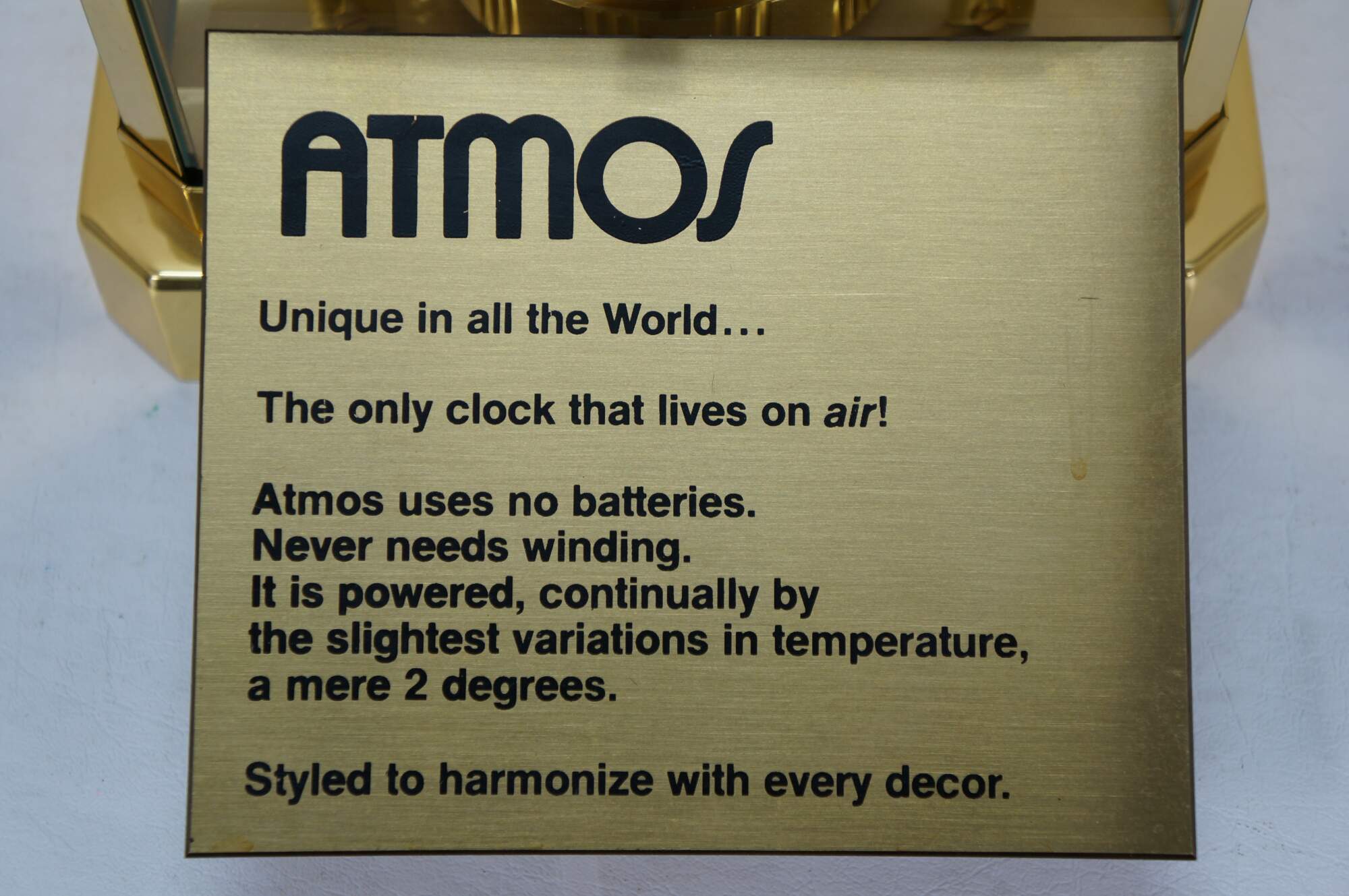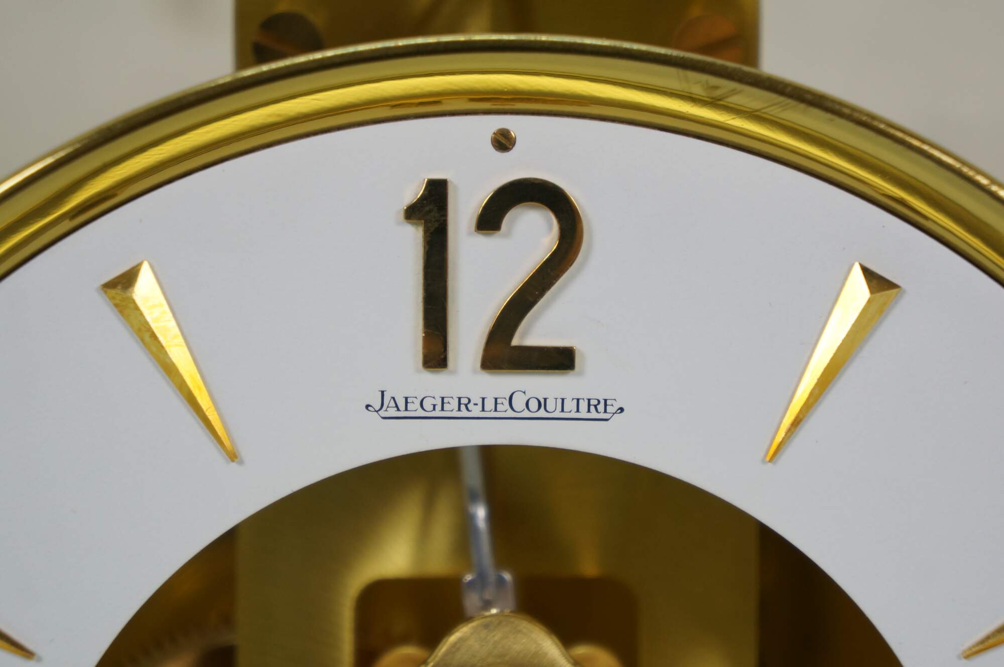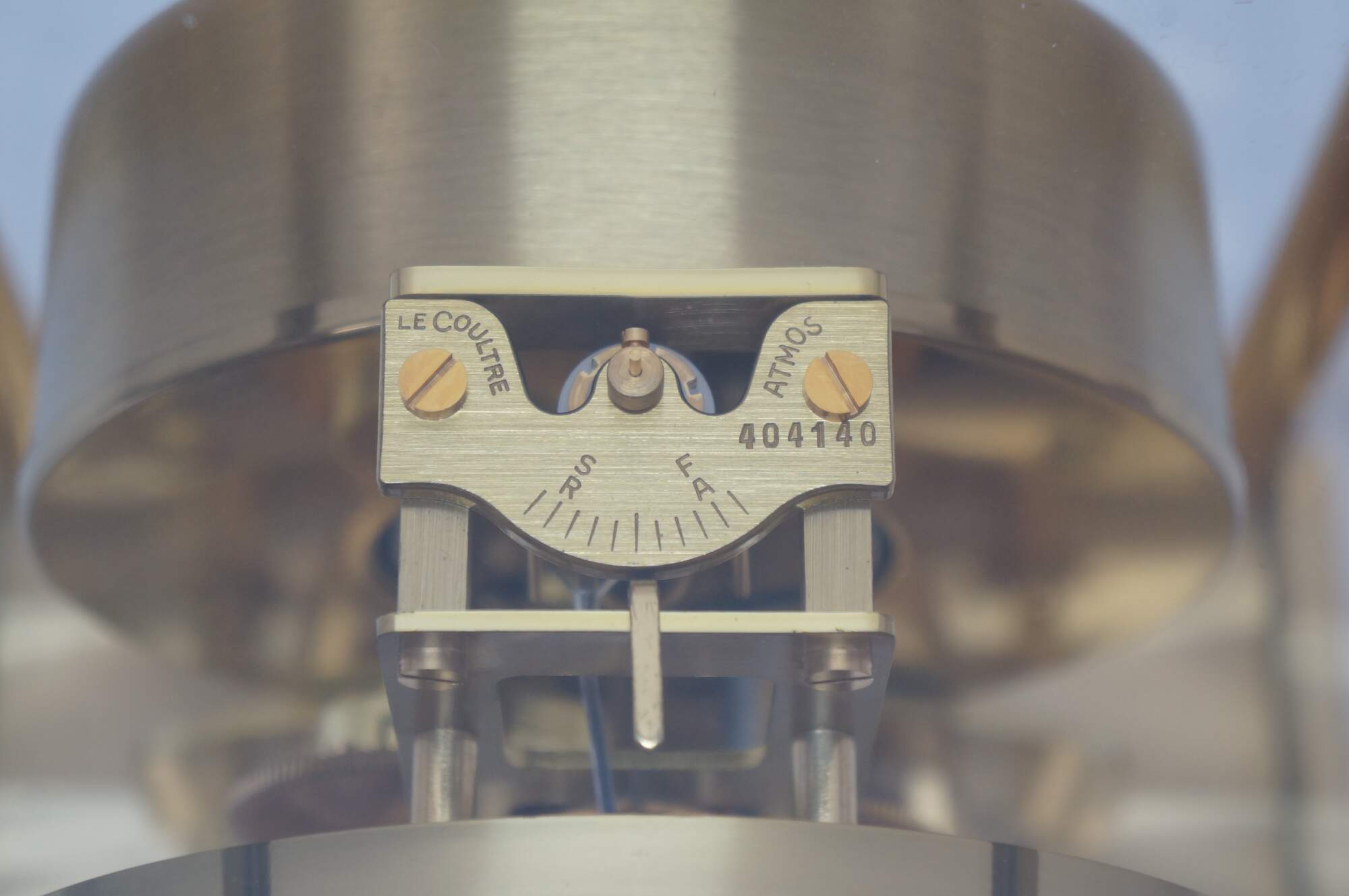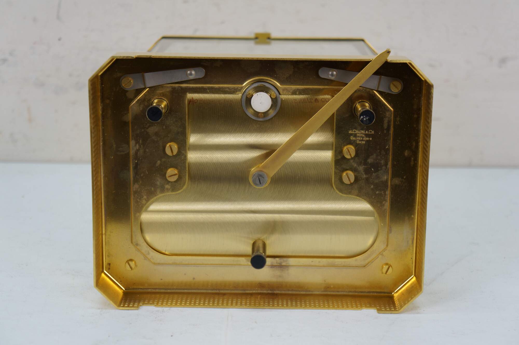 Circa 1960s Jaeger-Le Coultre Atmos perpetual motion mantel clock. Bright polished brass frame with glass sides. White face with gold tone Arabic numerals, pips and hands. Le Coultre & Cie - Metal - Caliber 528-8 - Swiss - C. Falt & Co. Serial Number: 404140. Fifteen 15 Jewels VXN - Switzerland Unadjusted - 528/1. Includes brass shop display plaque.