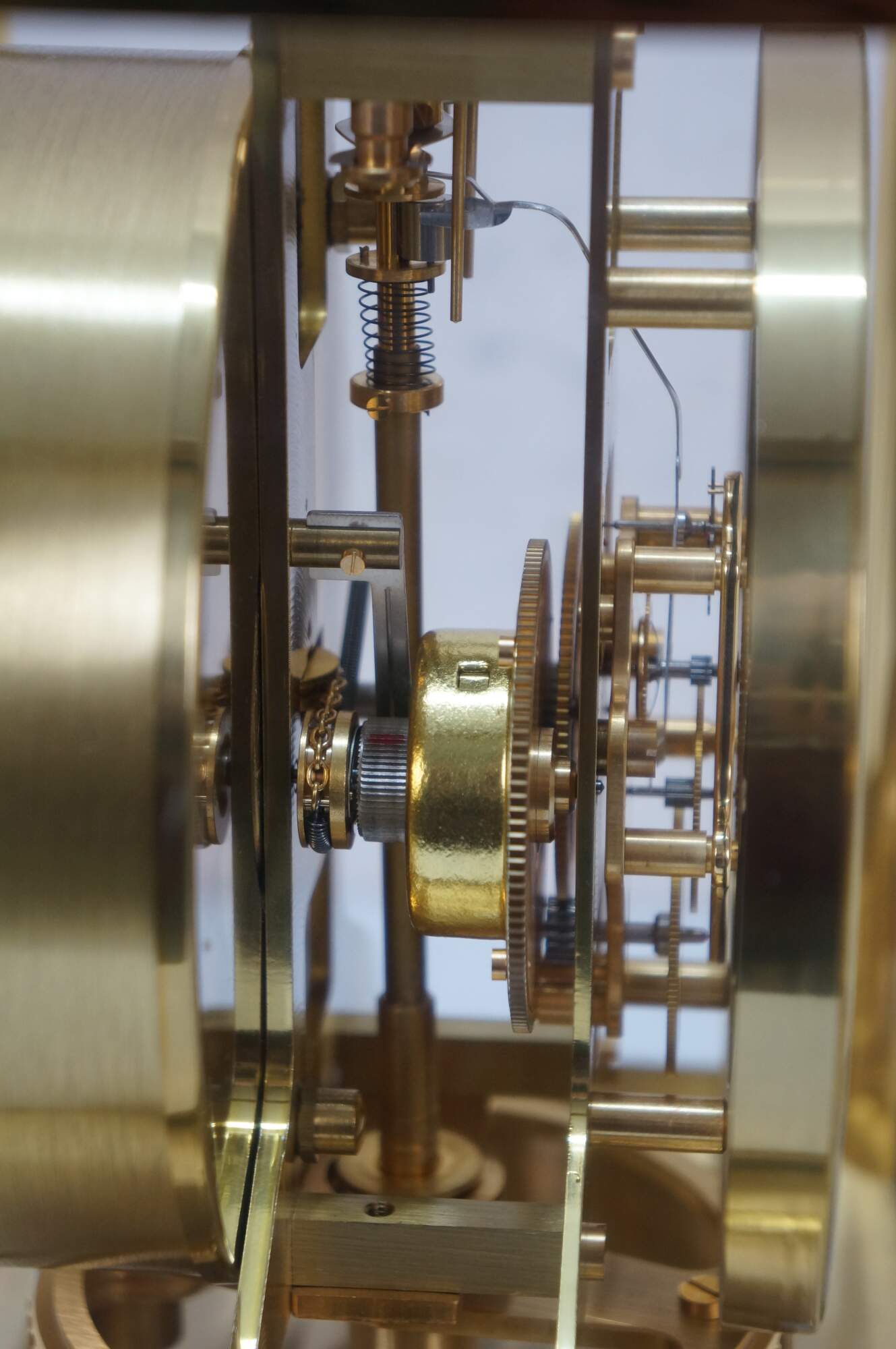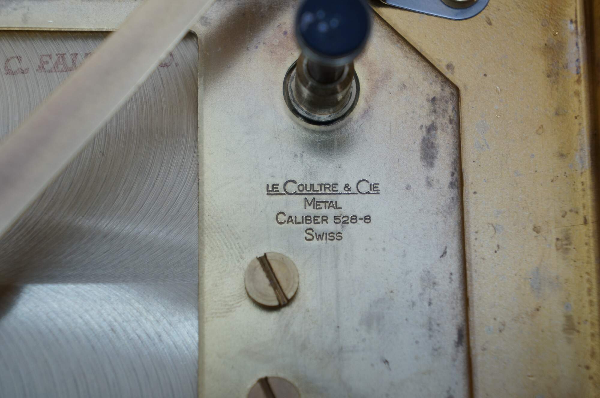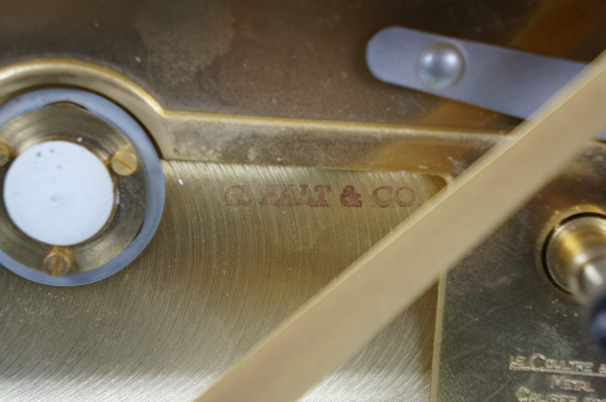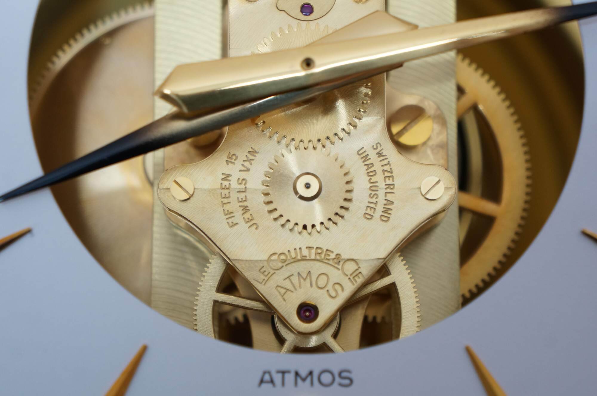 Circa 1960s Jaeger-Le Coultre Atmos perpetual motion mantel clock. Bright polished brass frame with glass sides. White face with gold tone Arabic numerals, pips and hands. Le Coultre & Cie - Metal - Caliber 528-8 - Swiss - C. Falt & Co. Serial Number: 404140. Fifteen 15 Jewels VXN - Switzerland Unadjusted - 528/1. Includes brass shop display plaque.