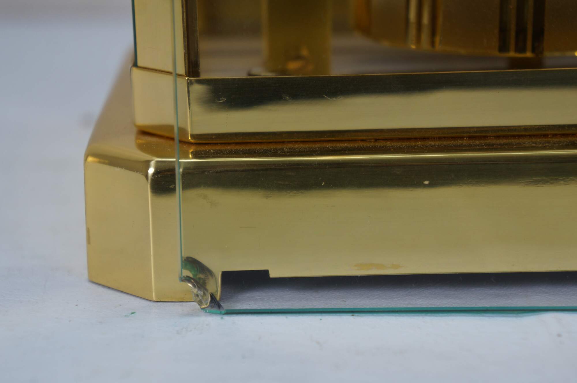 Working, wear and distressing from age and use, bottom corner of glass front chipped