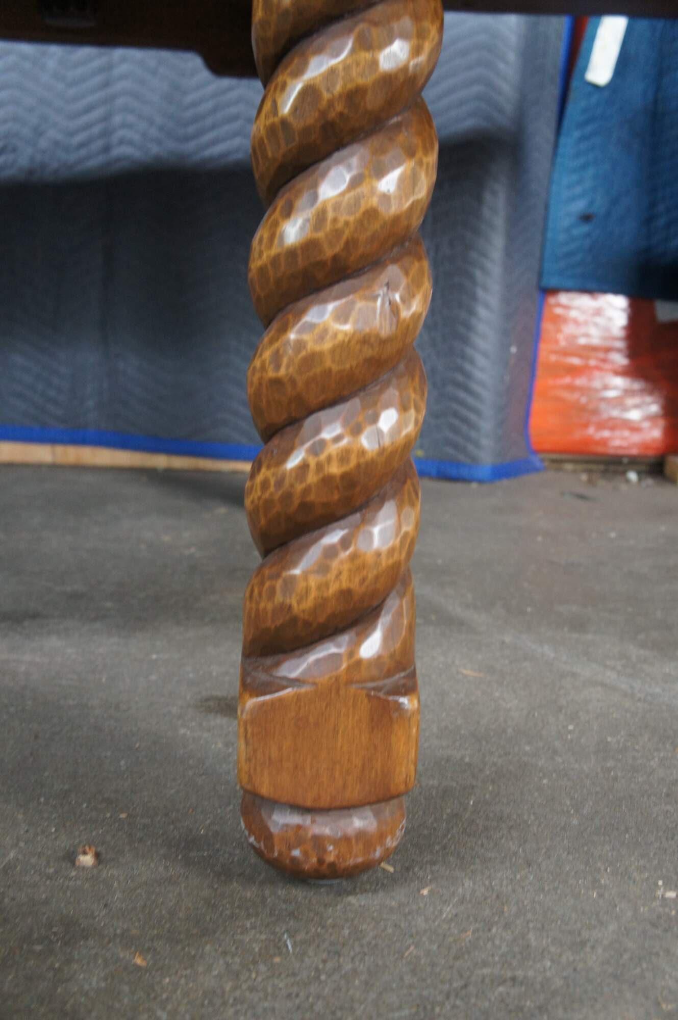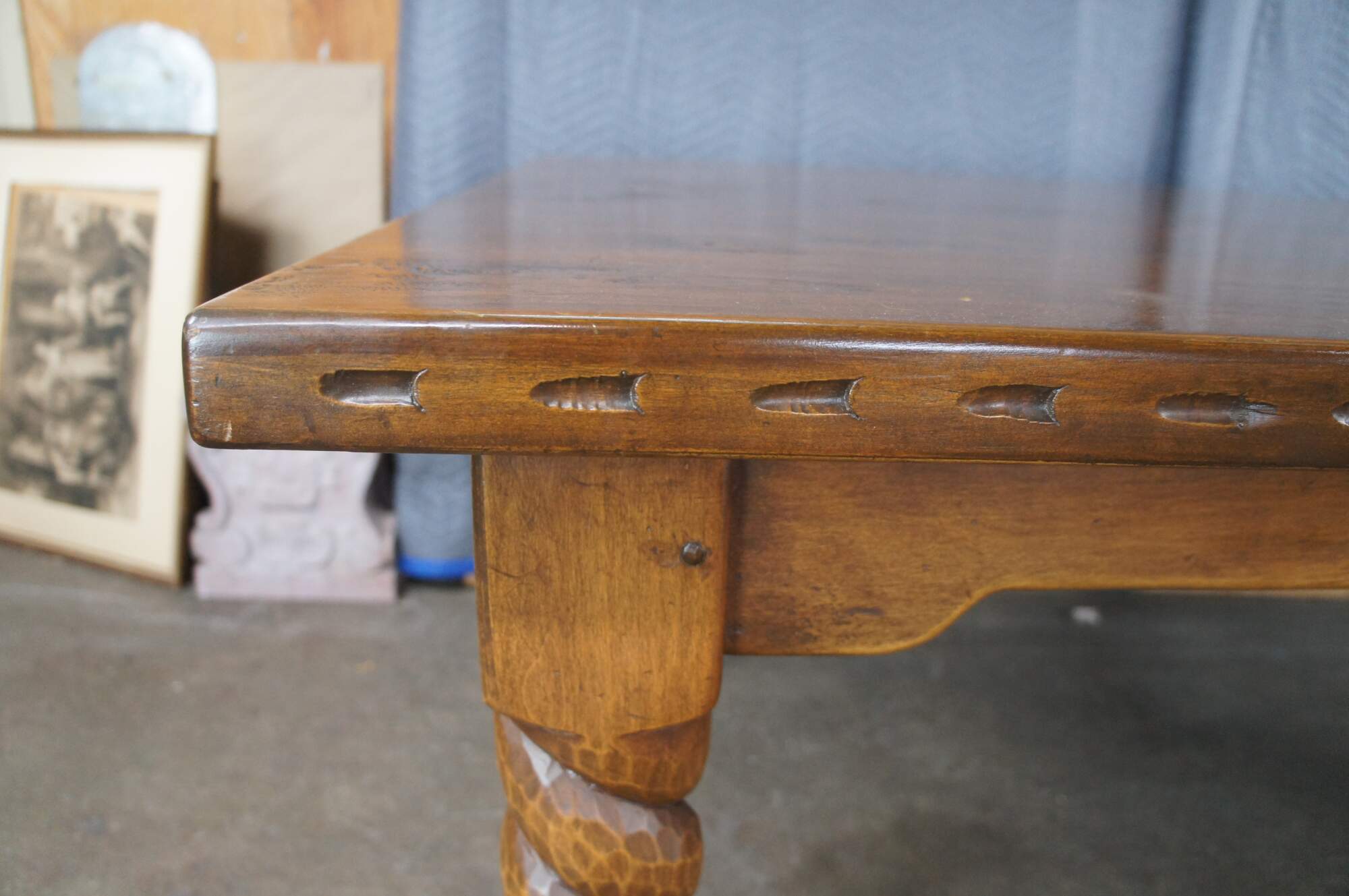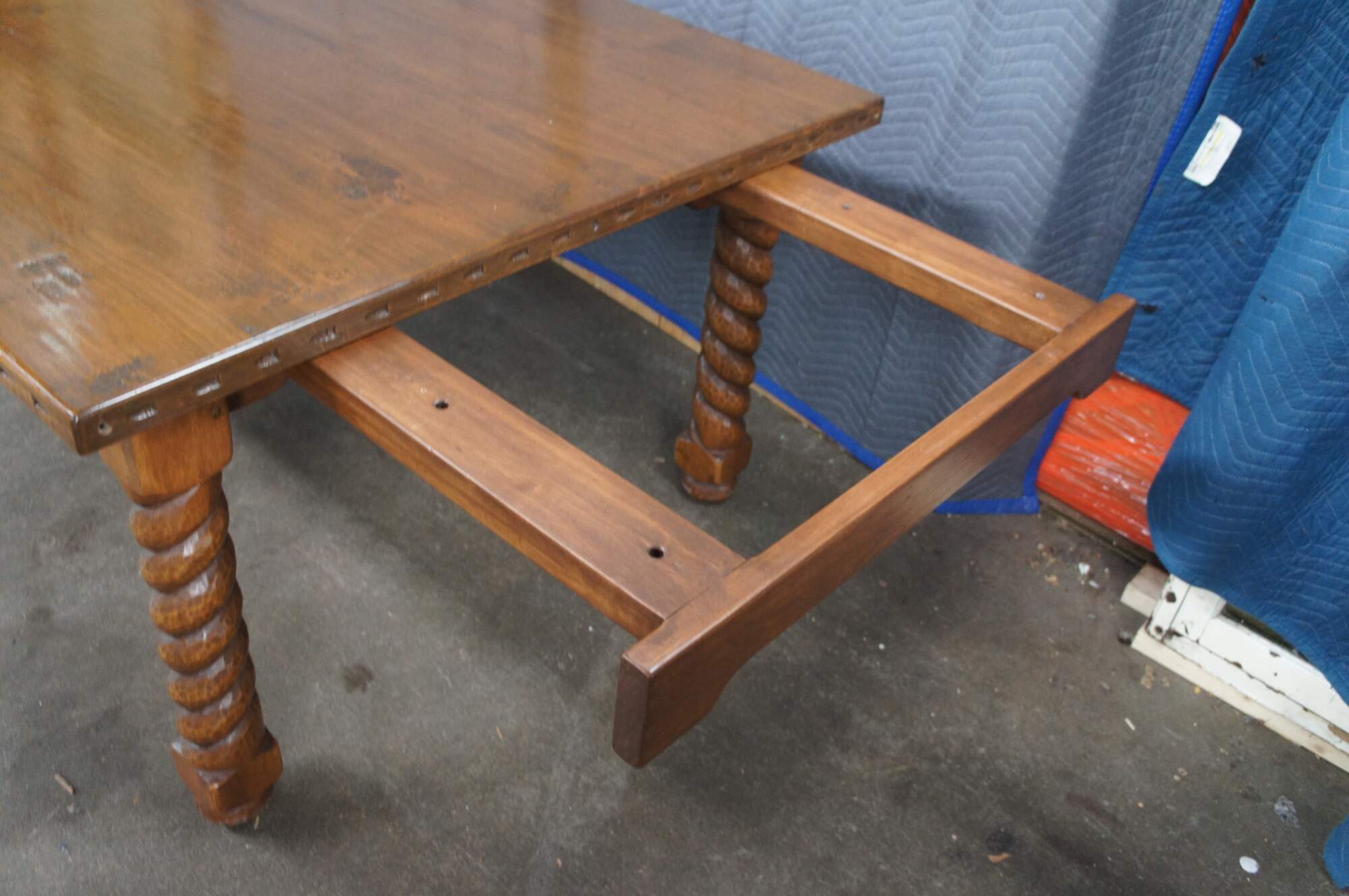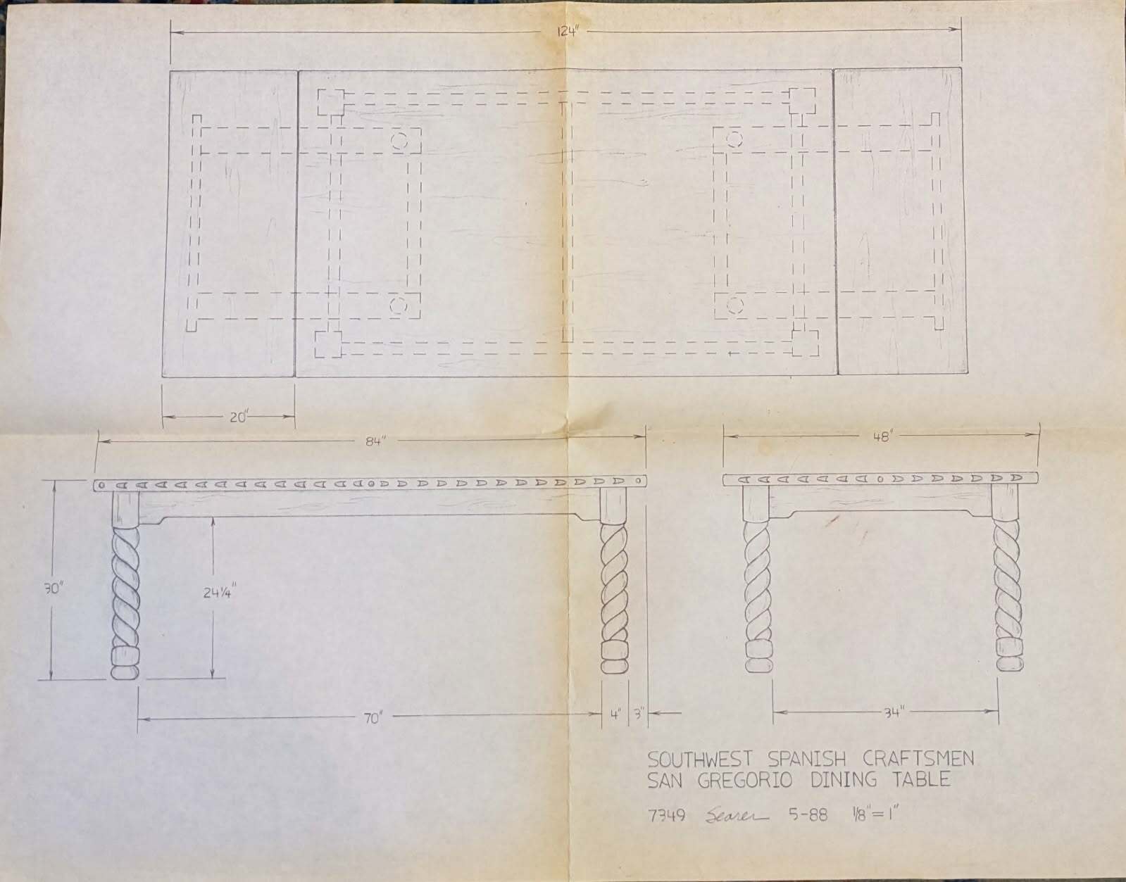 Southwest Spanish Craftsmen San Gregorio Dining Table by Ernest Thompson, circa 1988. The Southwest Spanish Craftsmen collection dates back to the 1920s. The design traces to 1821 when Mexico gained independence from Spain and opened its borders to trade. This beautiful example was custom made in 1988 and includes original singed blueprints from January and March of 1988. The design draws parallels with Spanish Revival styling and features a large rectangular frame made from mahogany with a carved edge over robust barley twisted legs and bun feet. The table has two leaves and opens via a draw leaf style mechanism that pull out from each end. The table is made from solid mahogany using mortise and tenon joinery. A remarkable piece of craftsmanship that will draw attention to any space