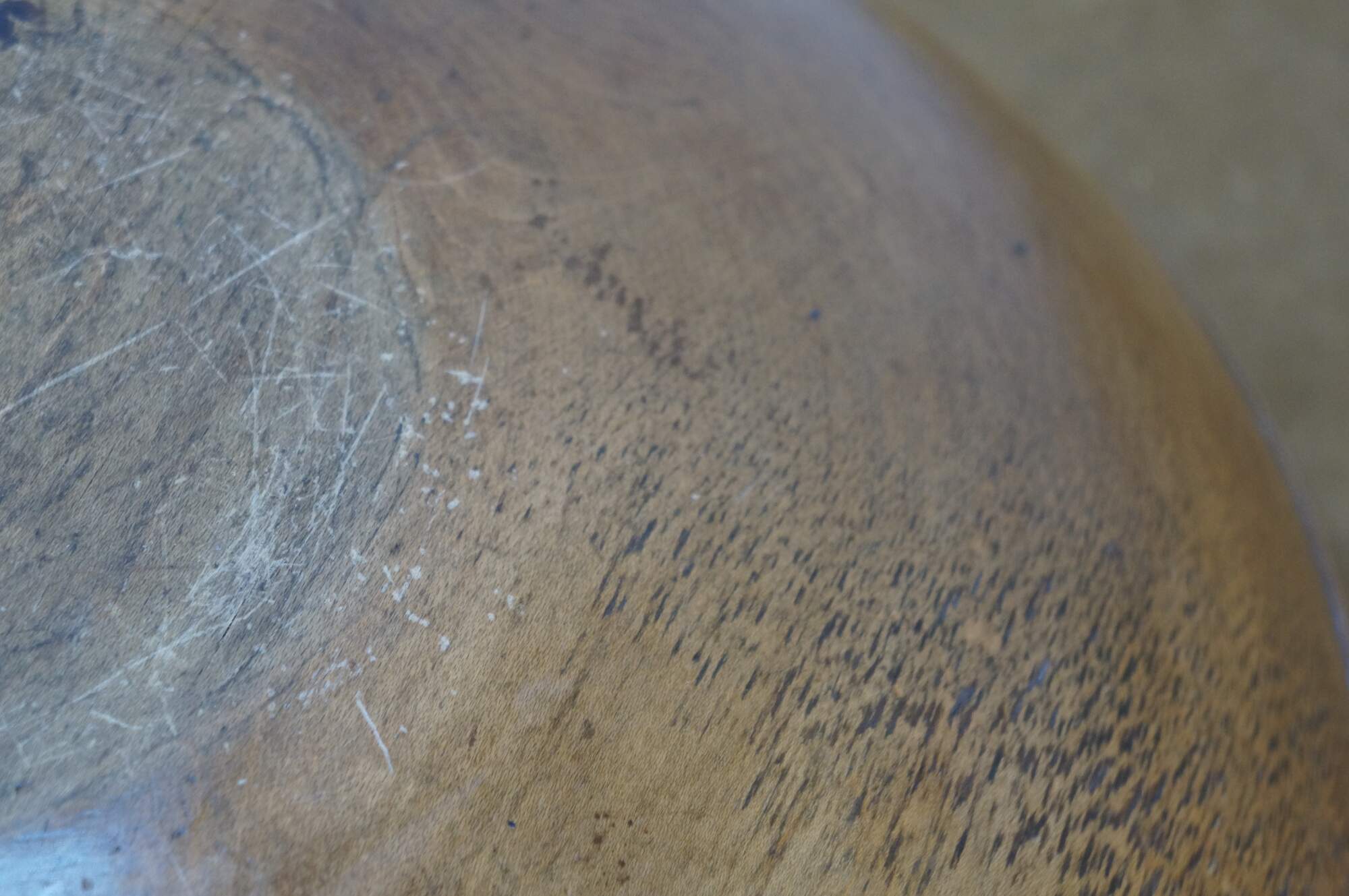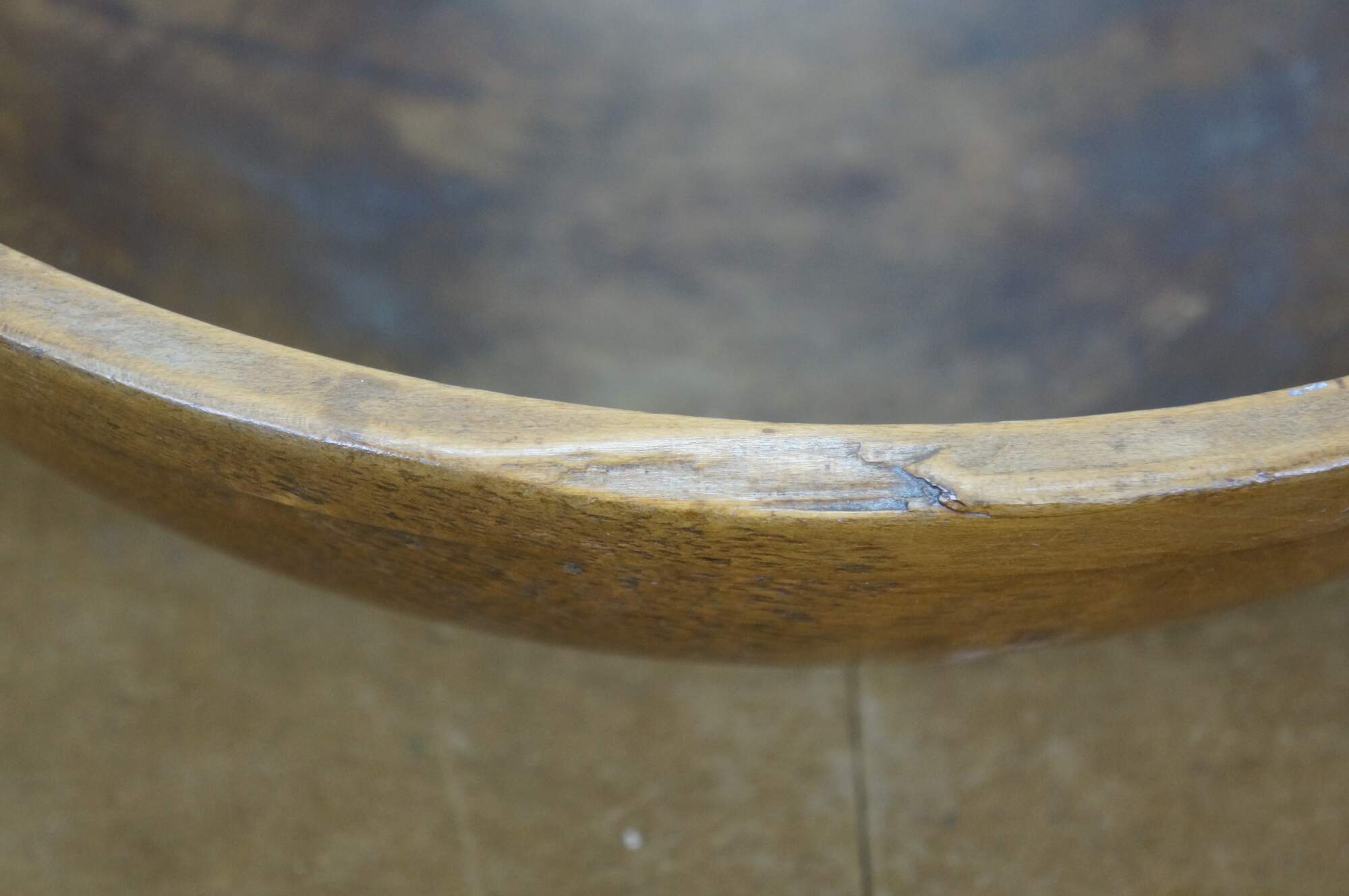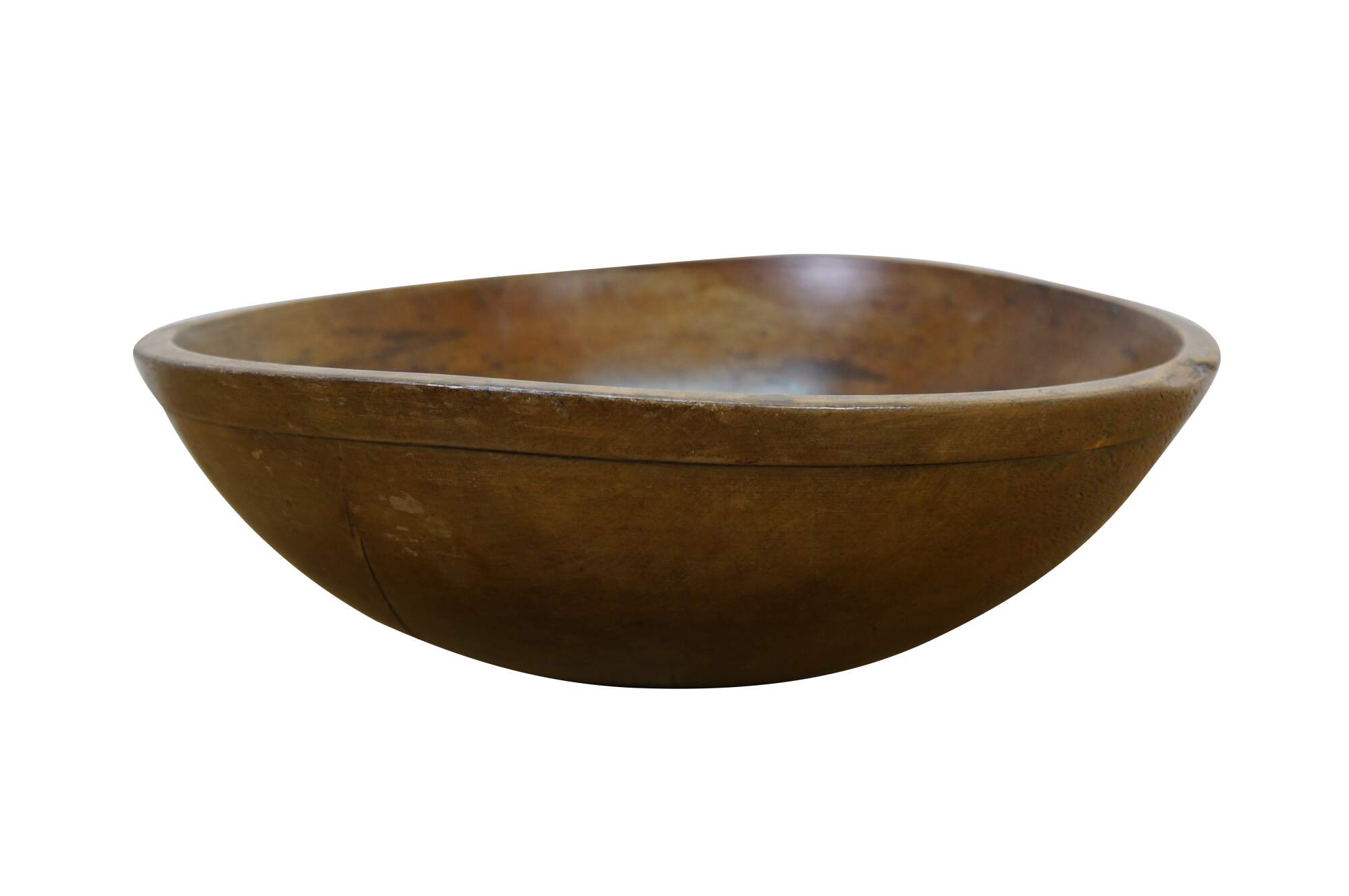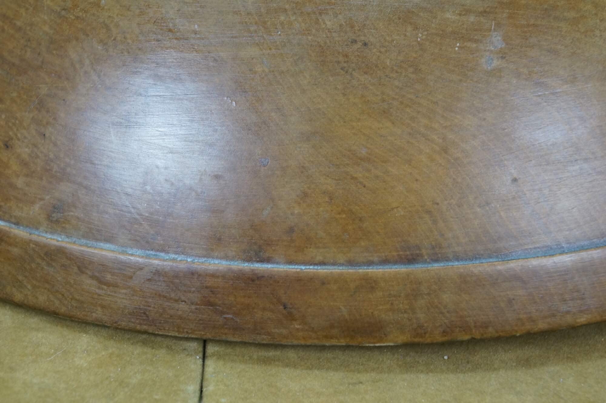 Large antique folk art country farmhouse dough mixing or centerpiece fruit bowl. Made of turned maple wood featuring a round form with banded lip and a nice, glossy finish.