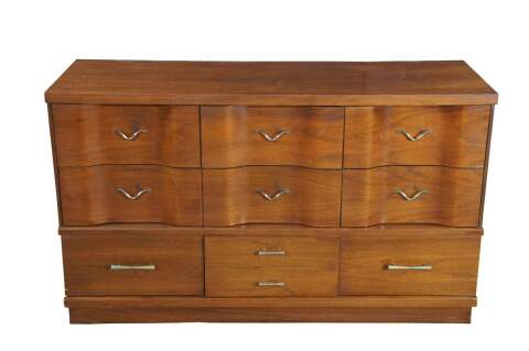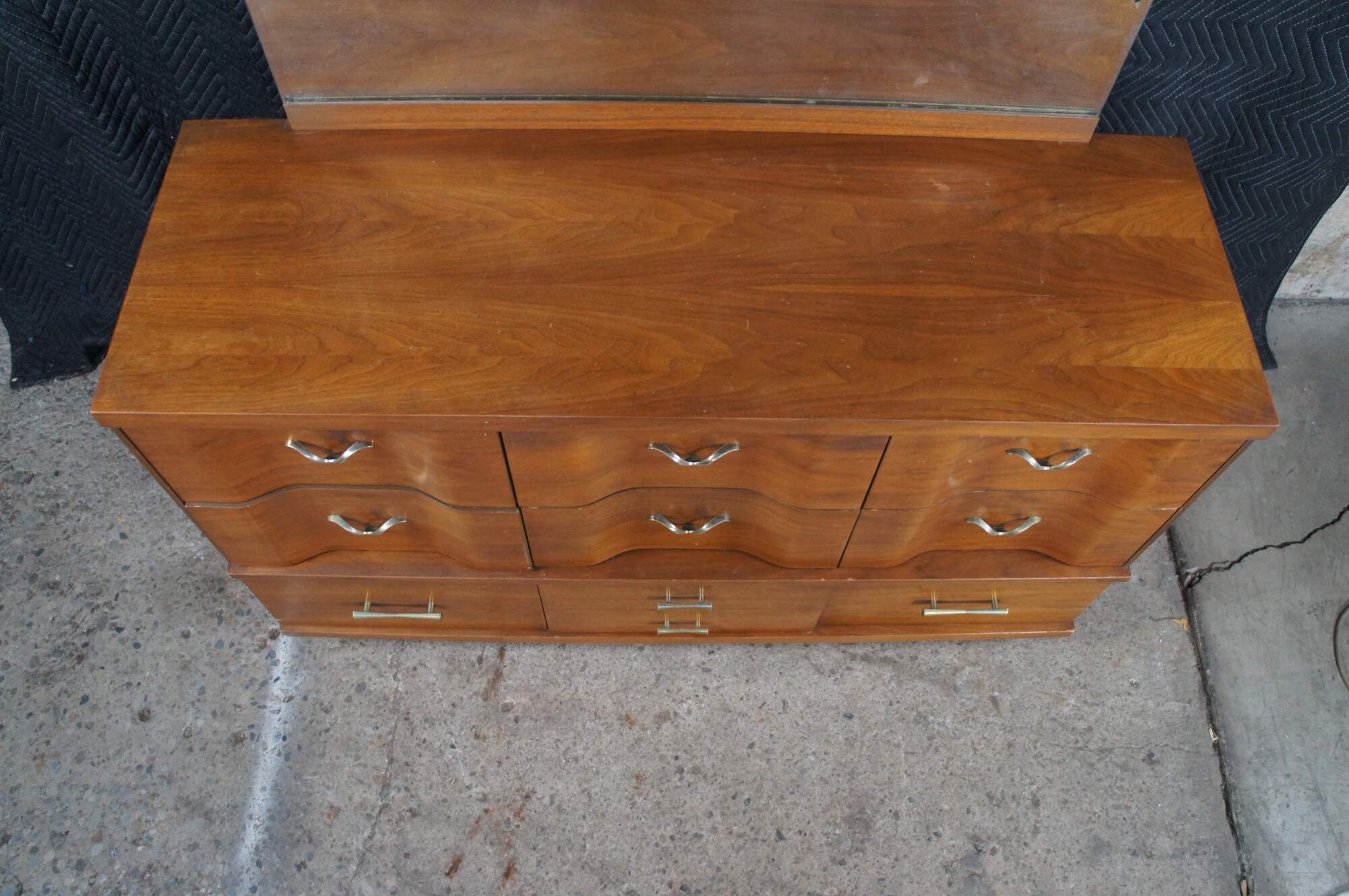 Mid century modern vanity dresser. Made of walnut featuring 9 serpentine drawers and a rectangular mirror.