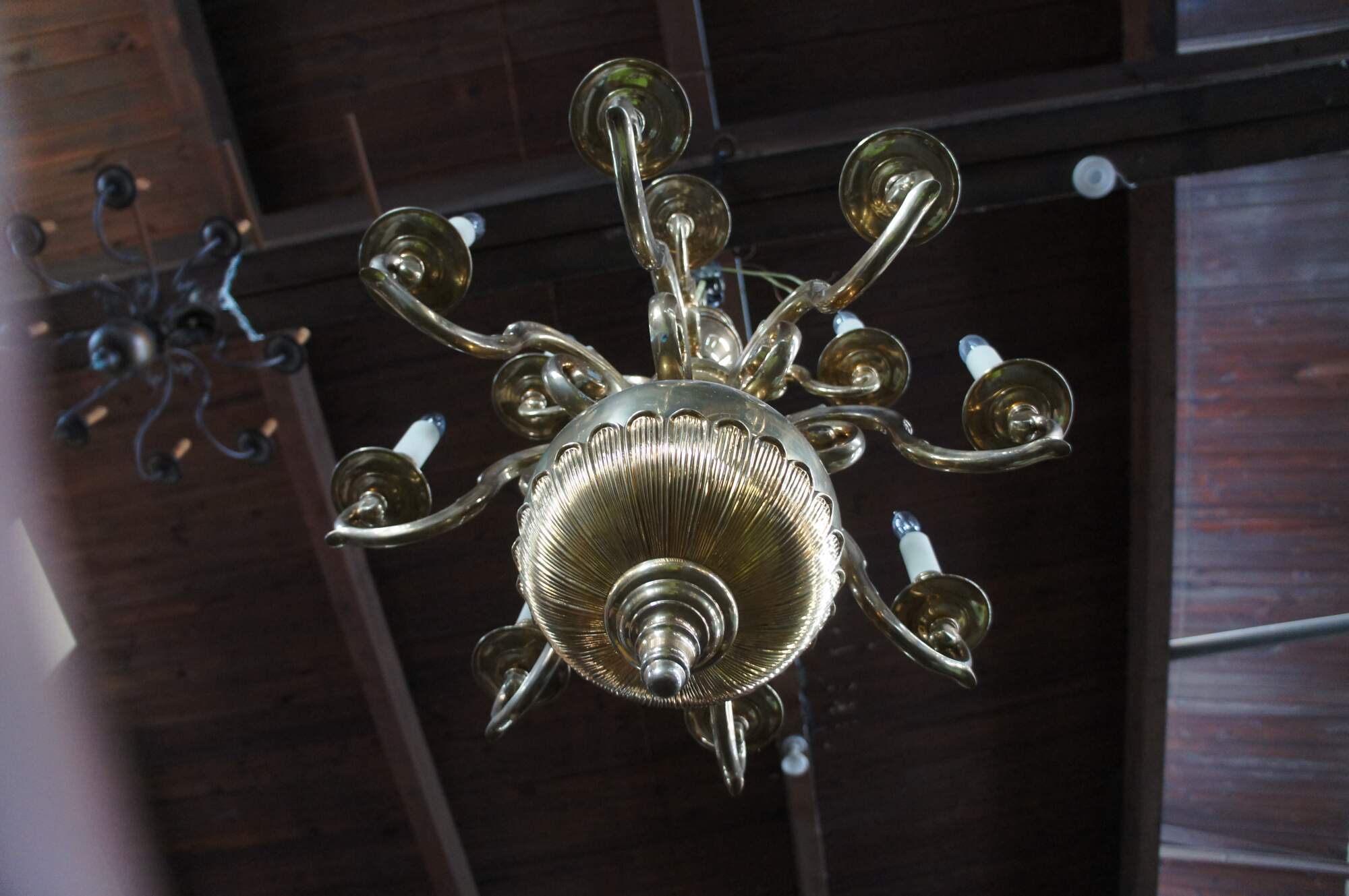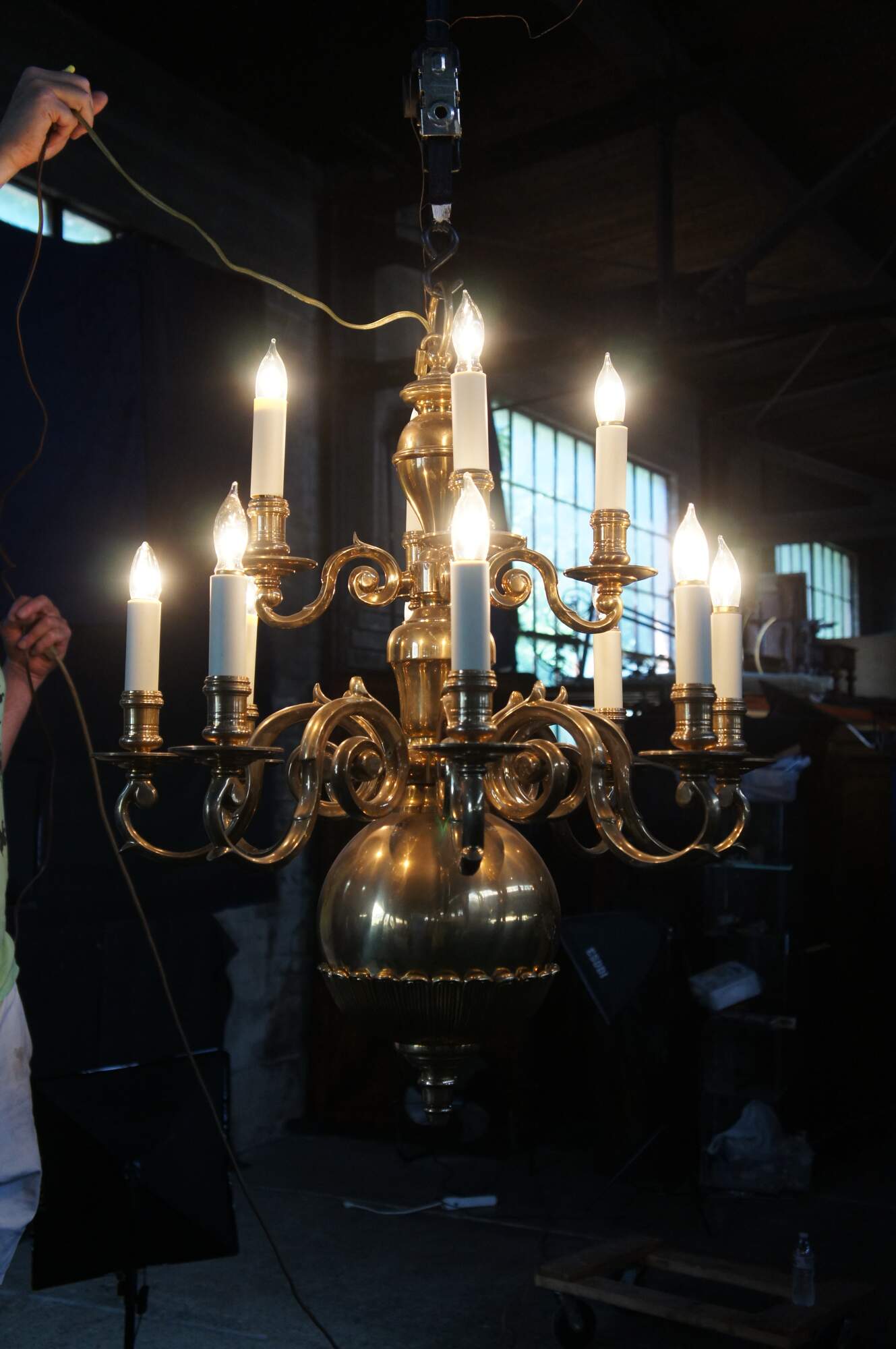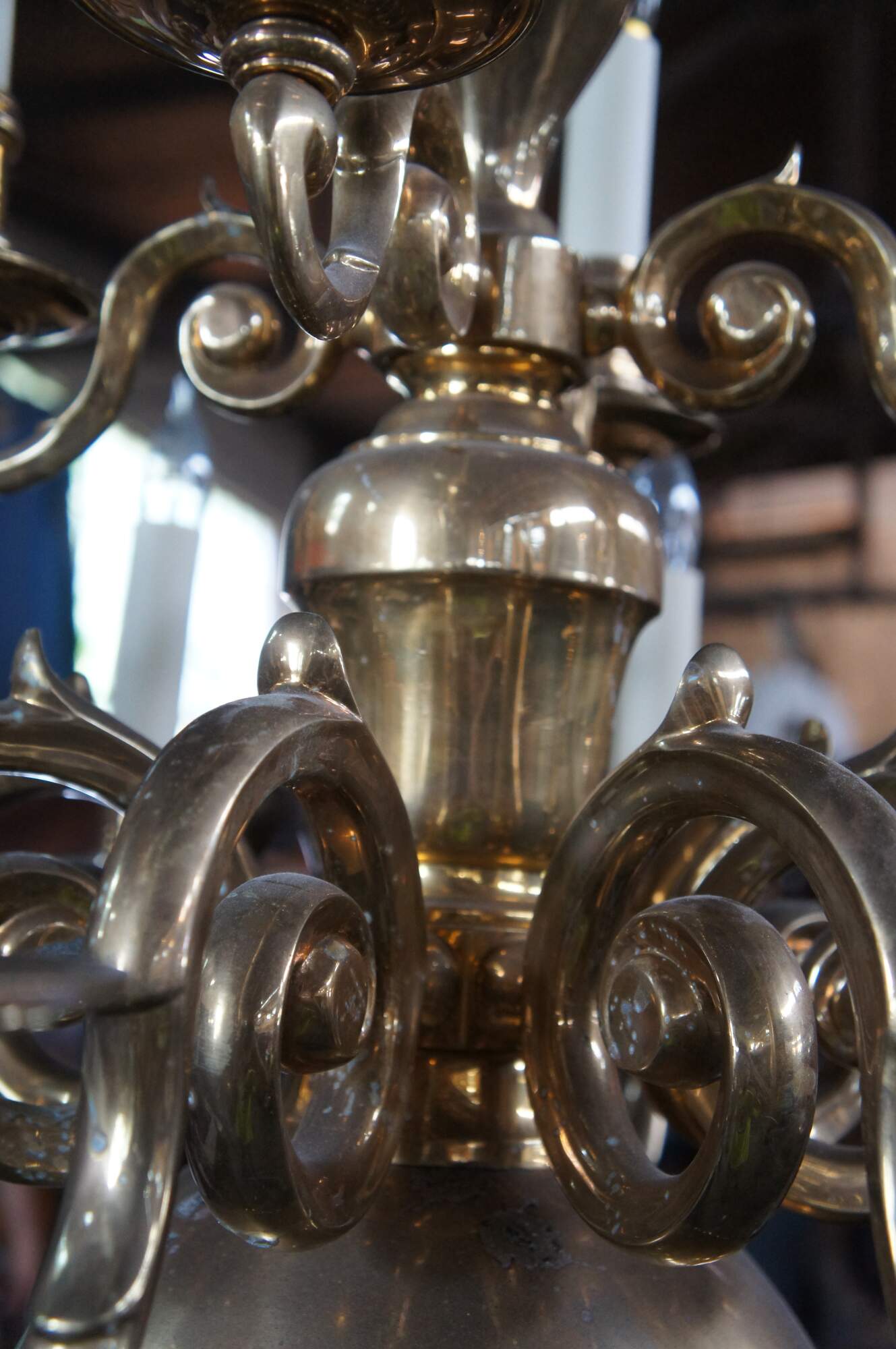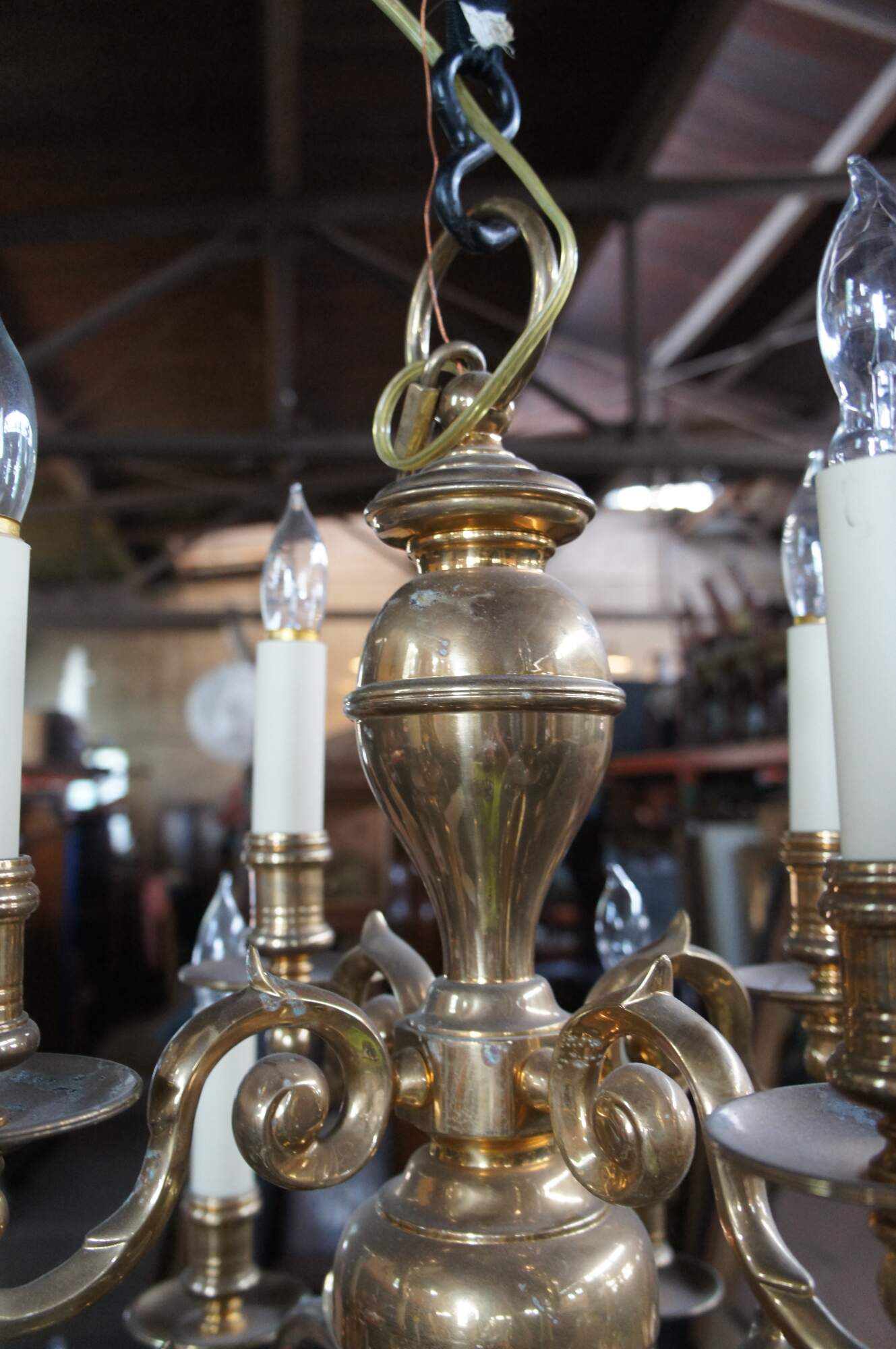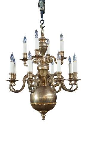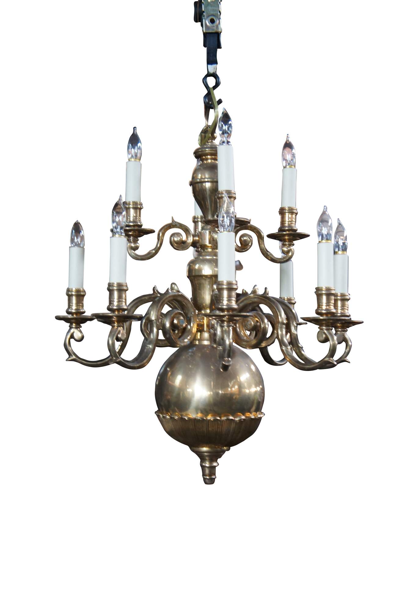 Vintage Chapman Georgian / Colonial Williamsburg / Dutch style chandelier. Made of solid brass featuring a double two tiered design with S scrolled arms supporting twelve candlesticks. Circa 1974. 808AE.