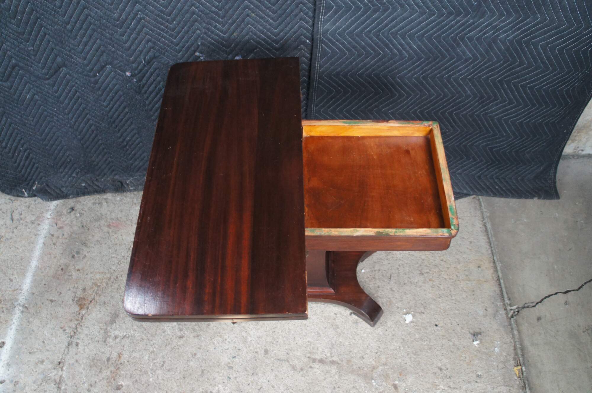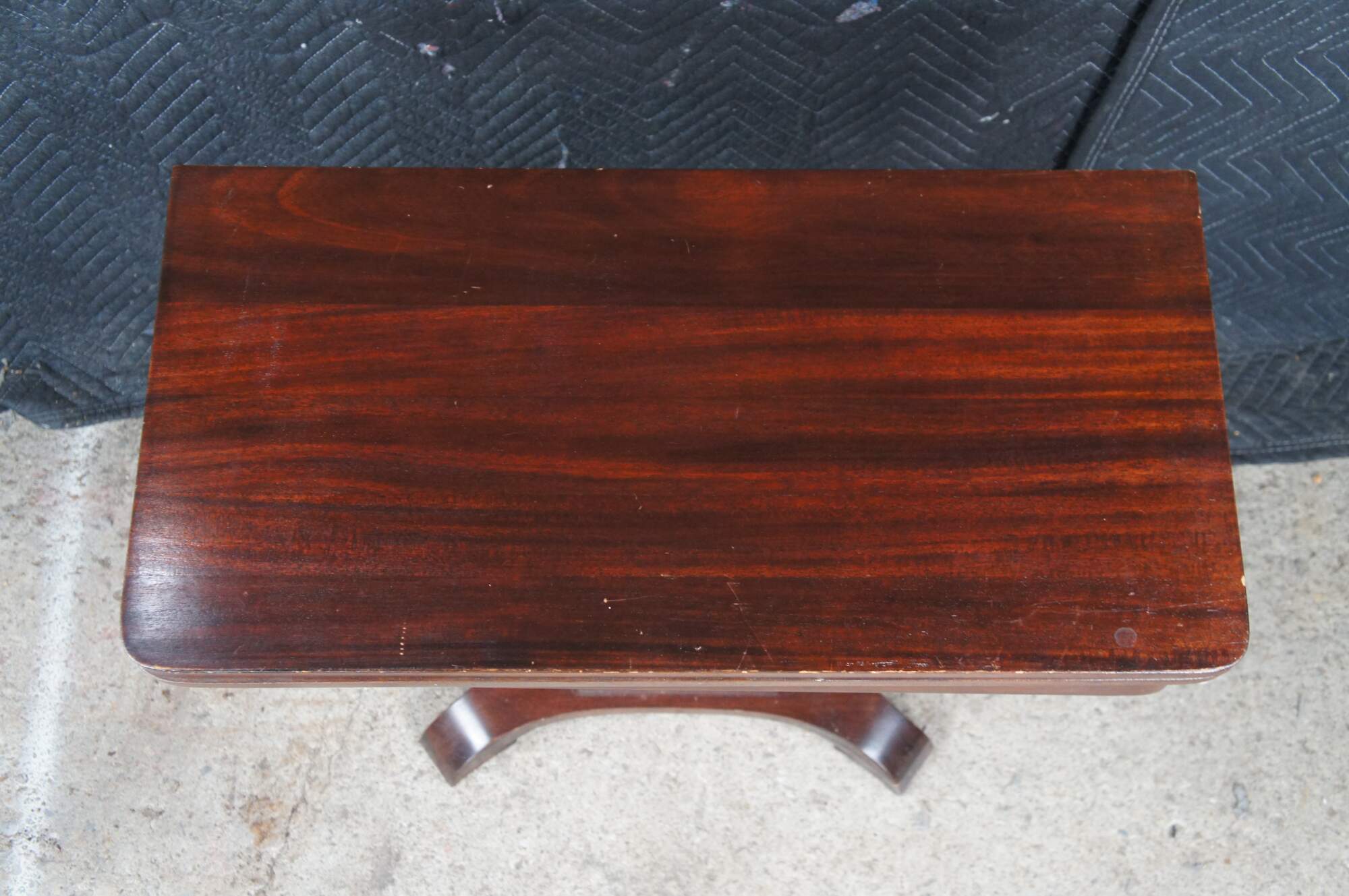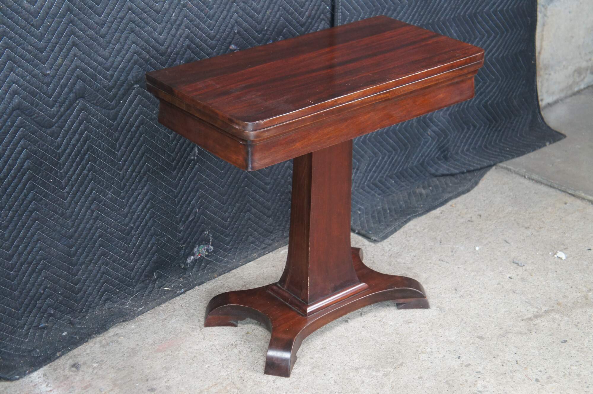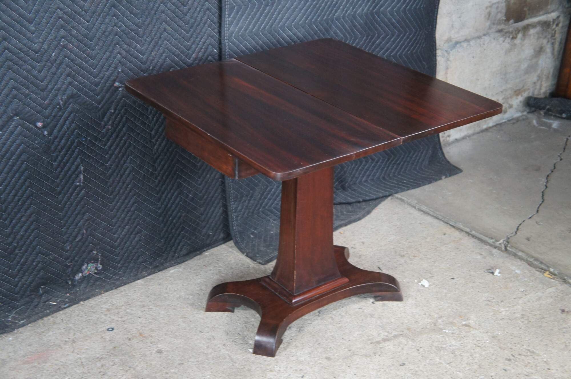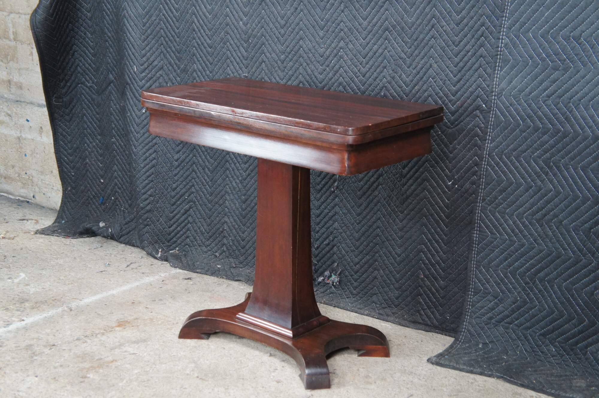 Antique 19th Century Victorian Era American Empire flip top game table or console. Made of mahogany featuring American Empire styling with rectangular form, tapered pedestal over a splayed base with curved feet.