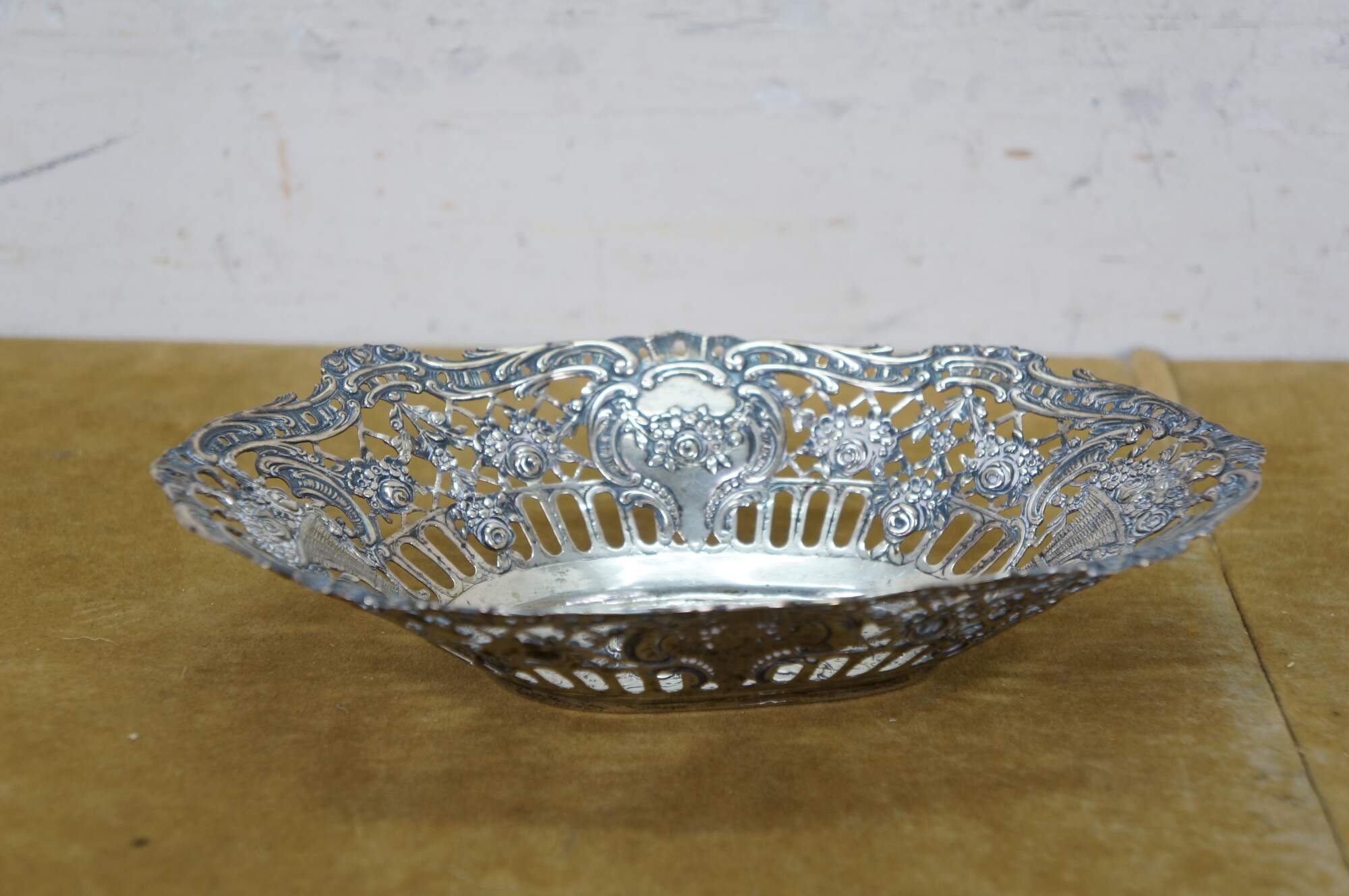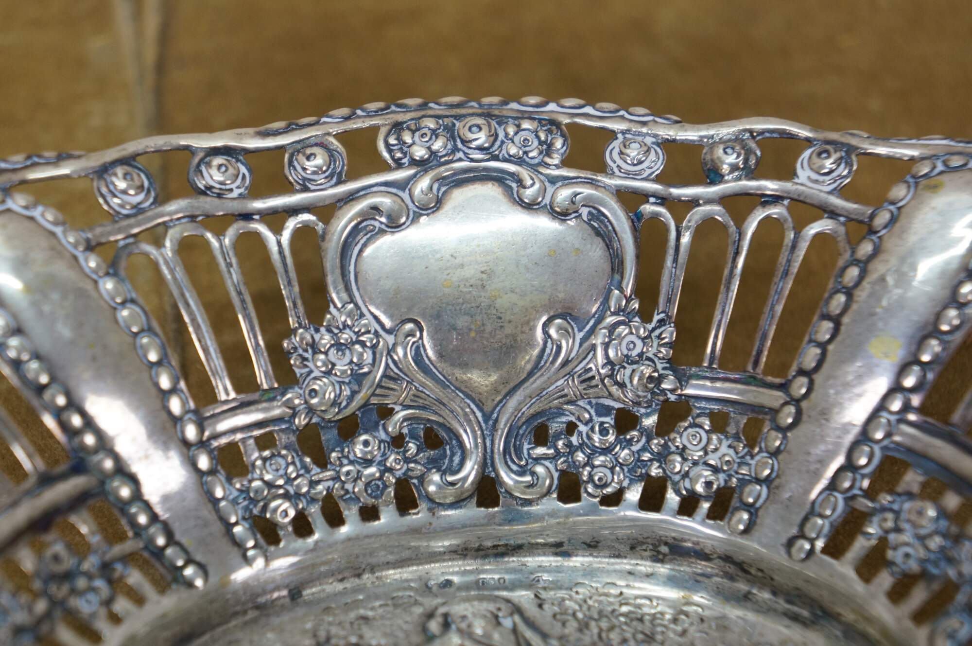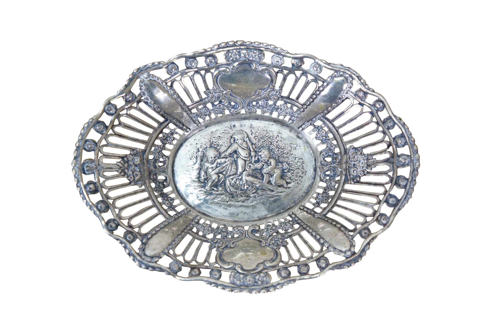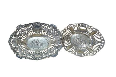 Pair of antique 800 German silver repousse reticulated dishes / baskets. Oval form with scalloped edge, pierced sides with foliate designs, surrounding central motifs of cherubs / putti angels.