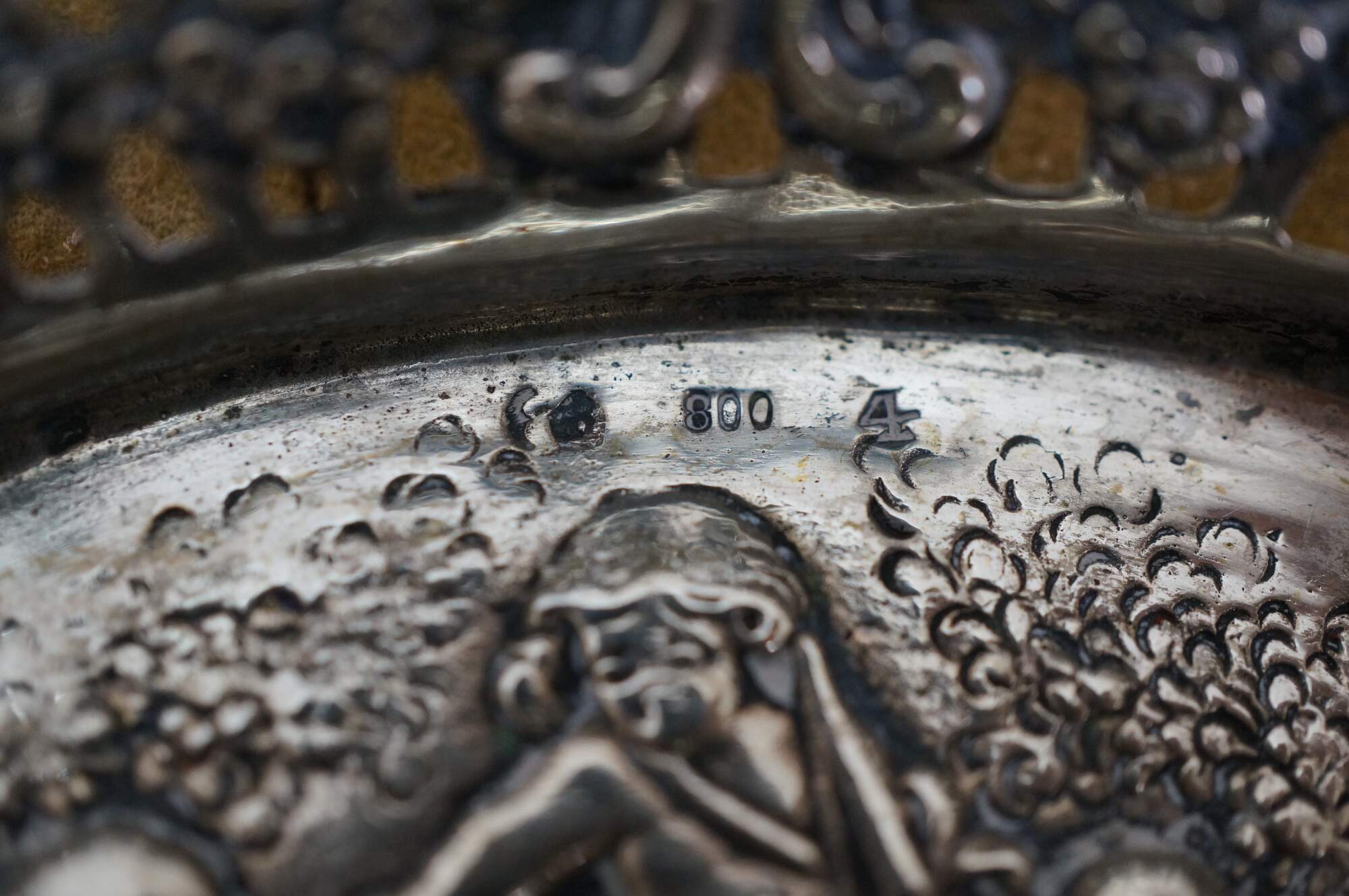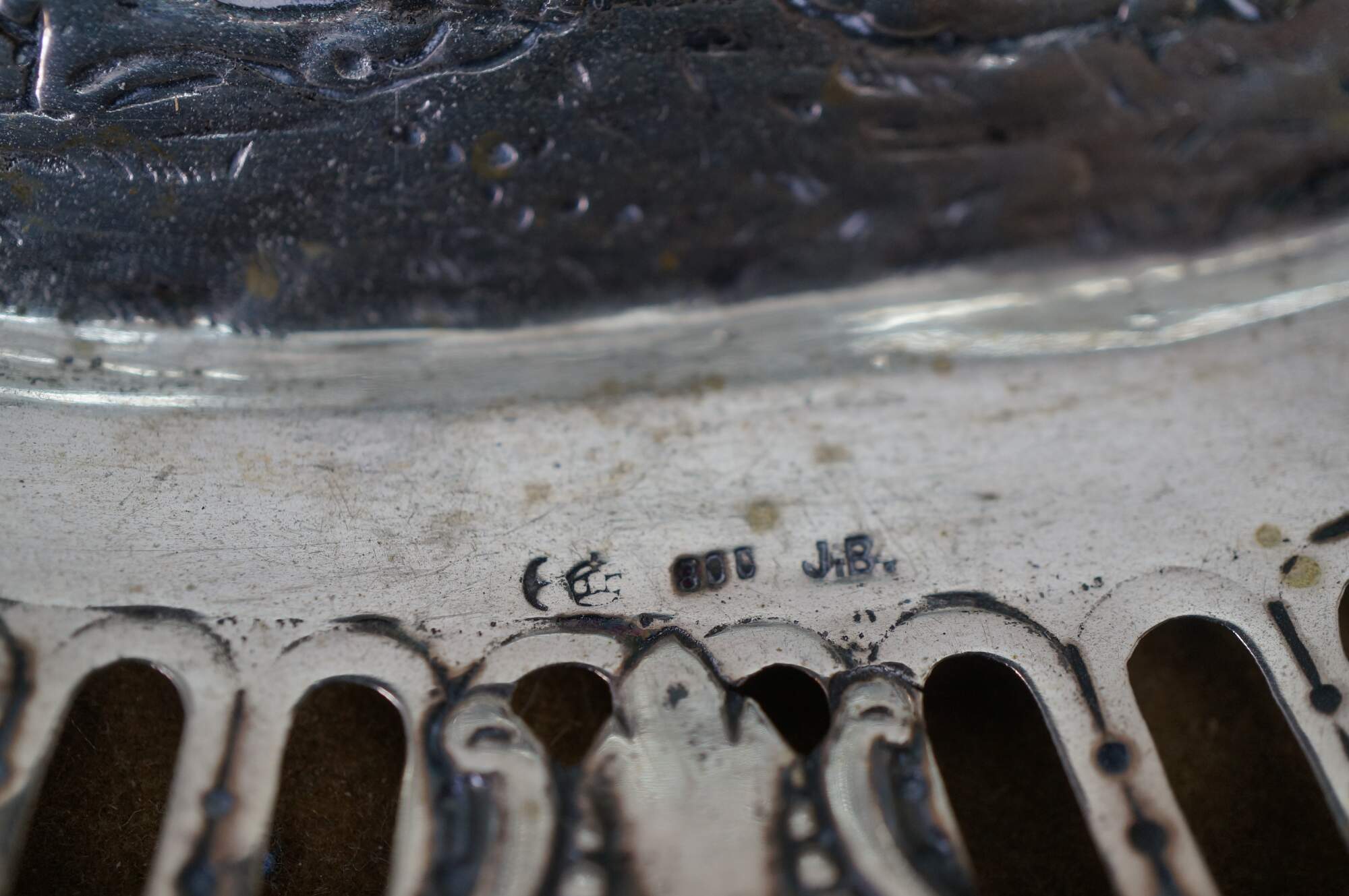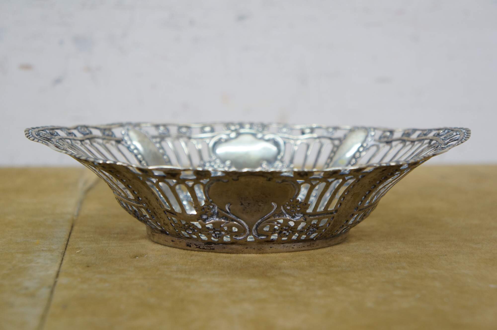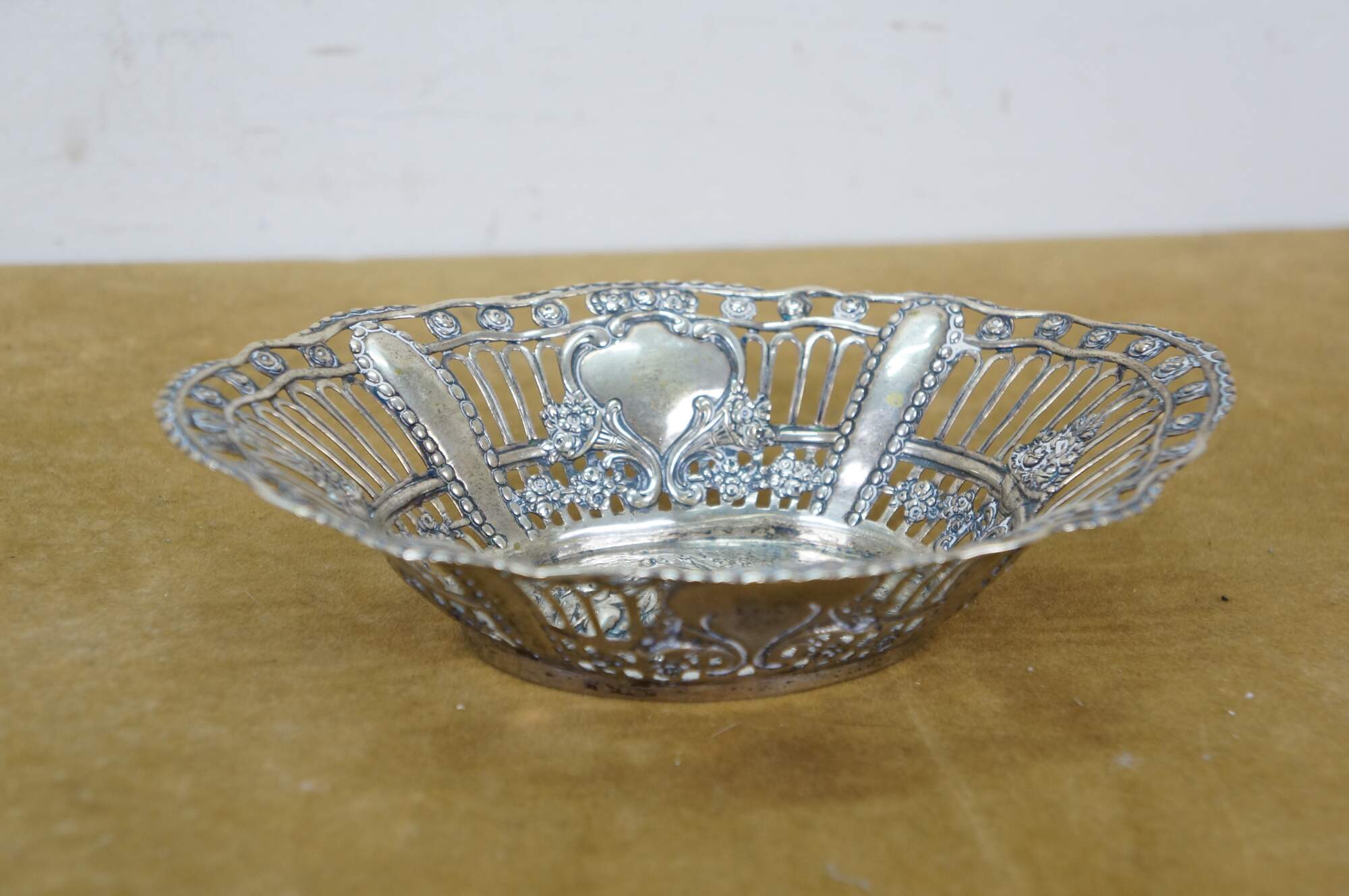 Pair of antique 800 German silver repousse reticulated dishes / baskets. Oval form with scalloped edge, pierced sides with foliate designs, surrounding central motifs of cherubs / putti angels.