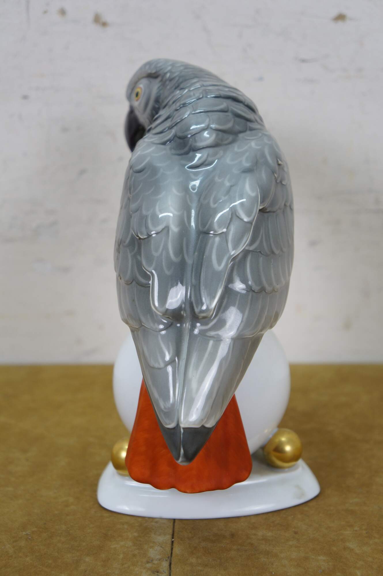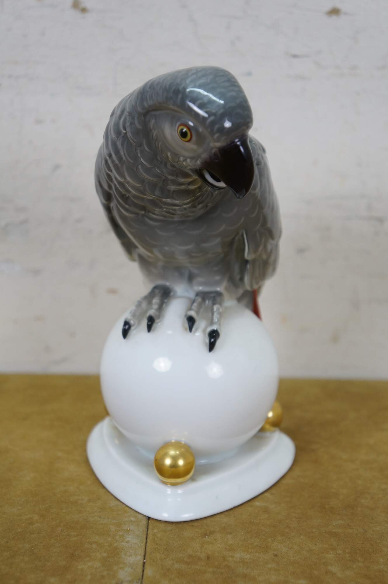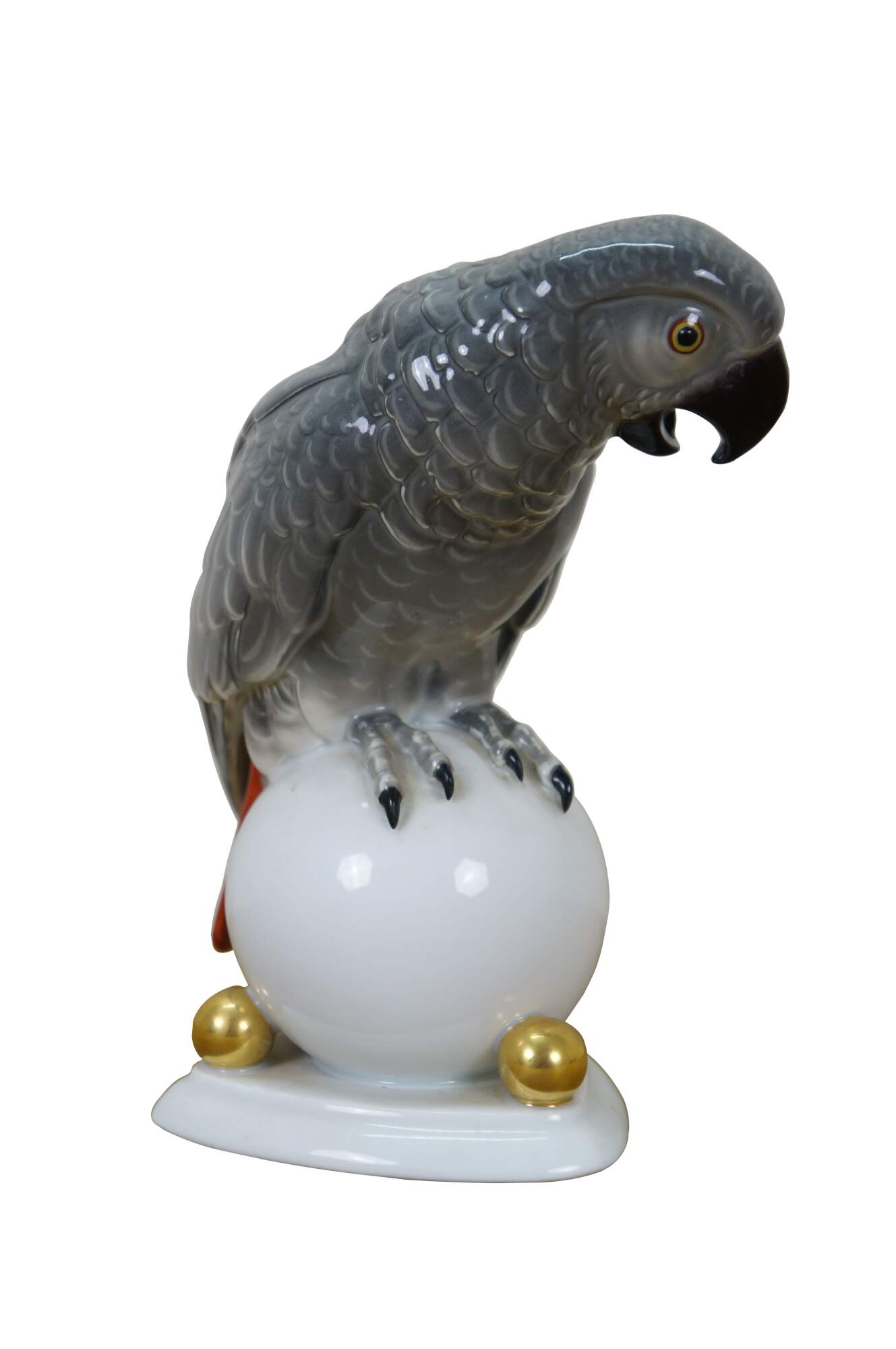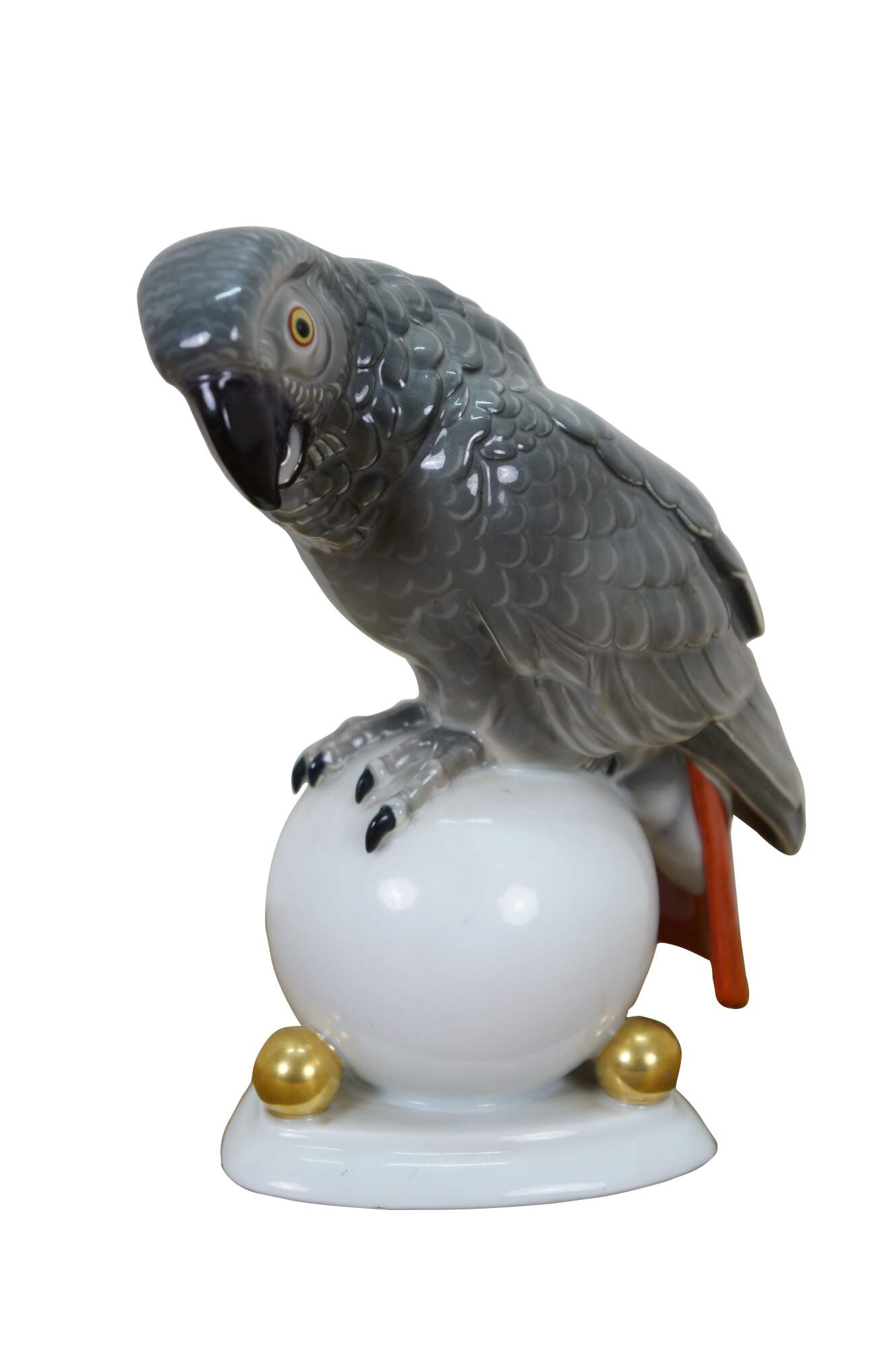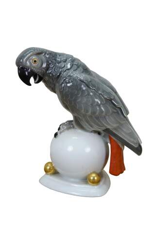 Antique Art Deco 1925 Hutschenreuther porcelain figurine in the shape of an African Gray Parrot perched on a white orb with gilt orb accents. Designed by Fritz Klee.