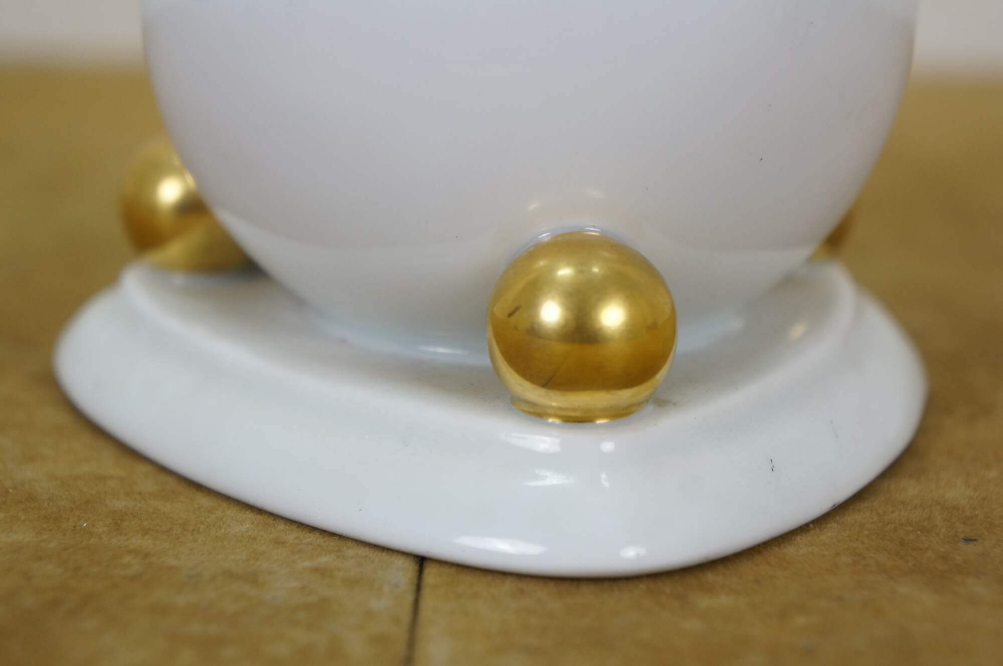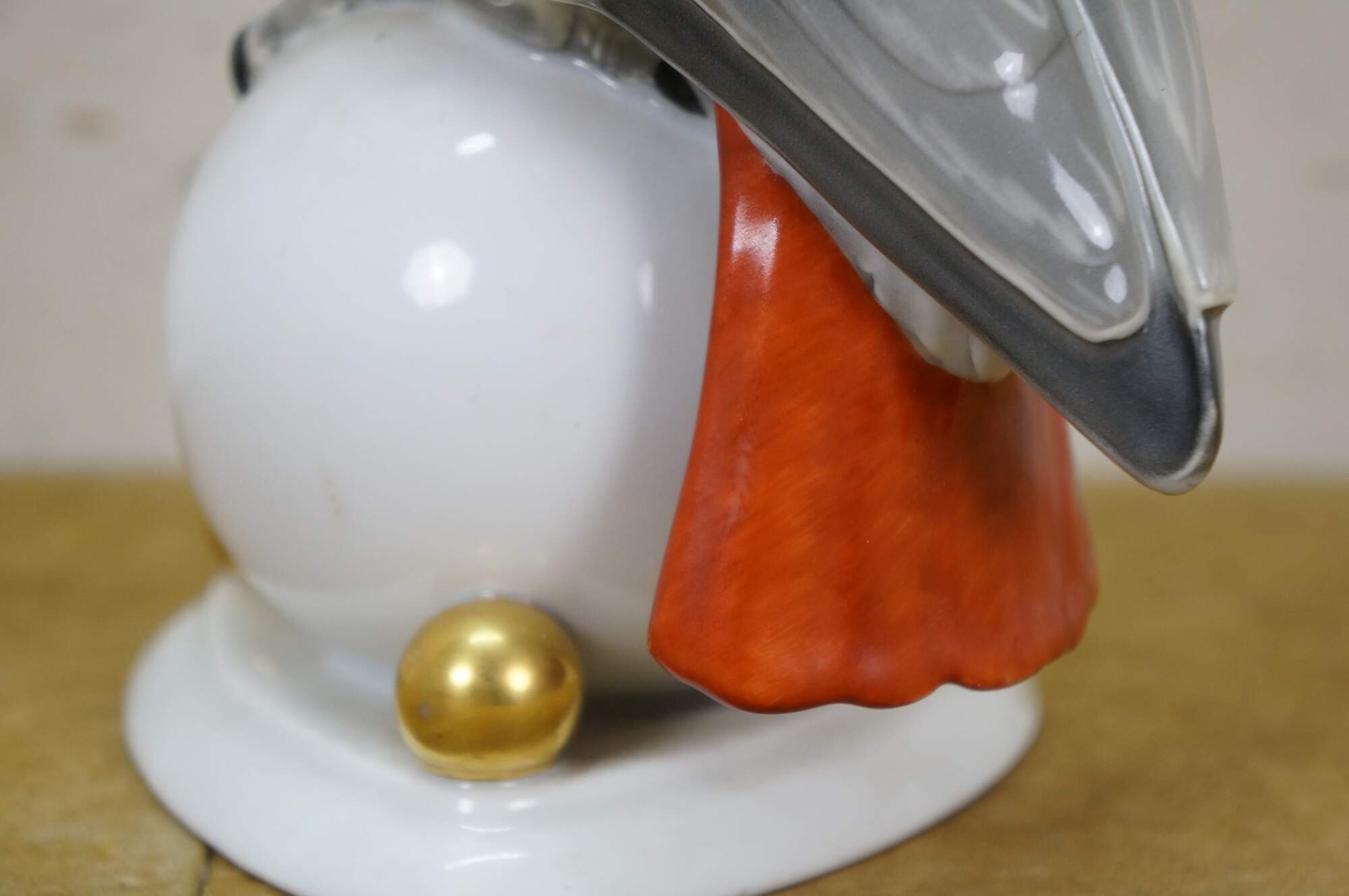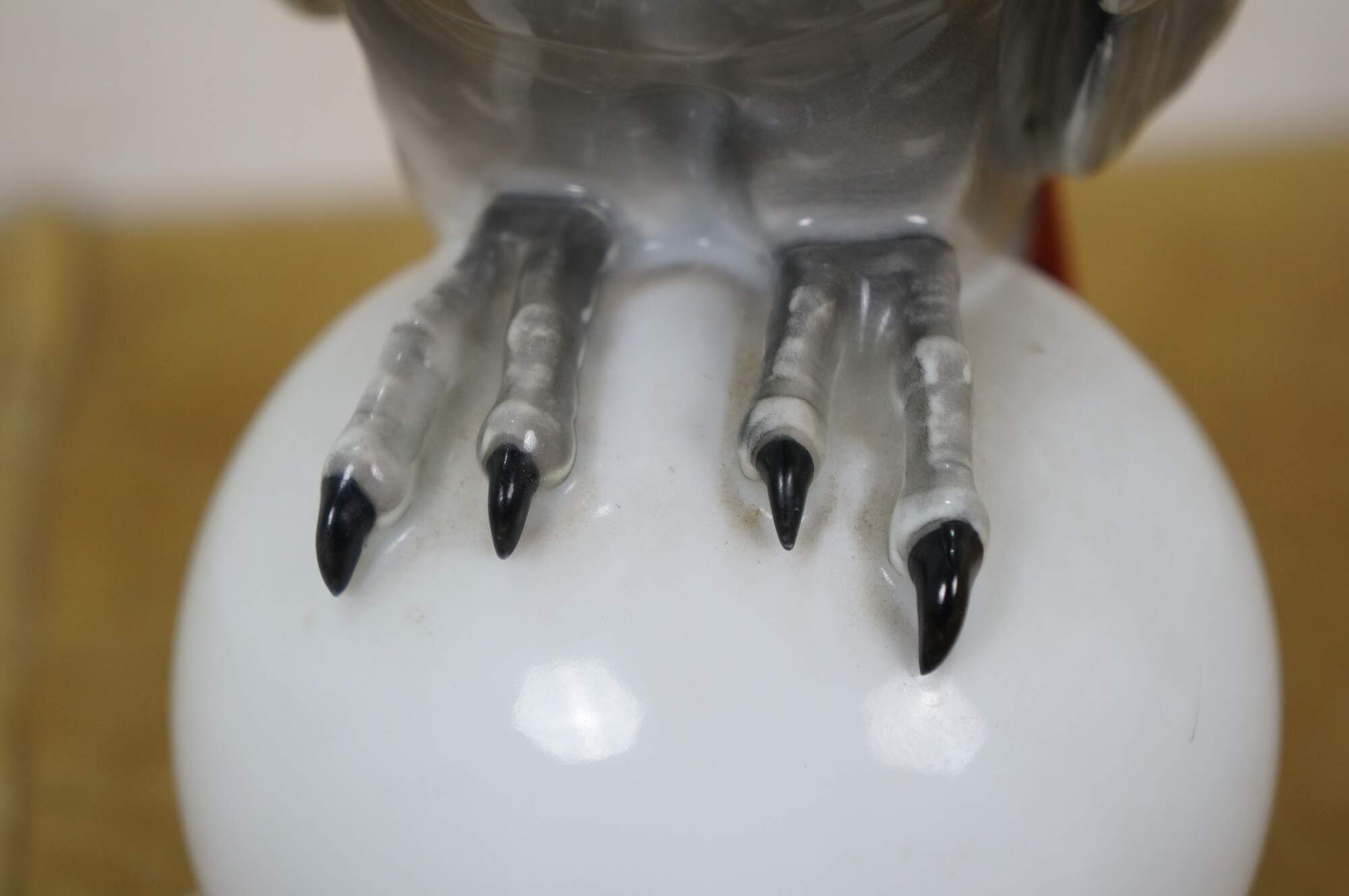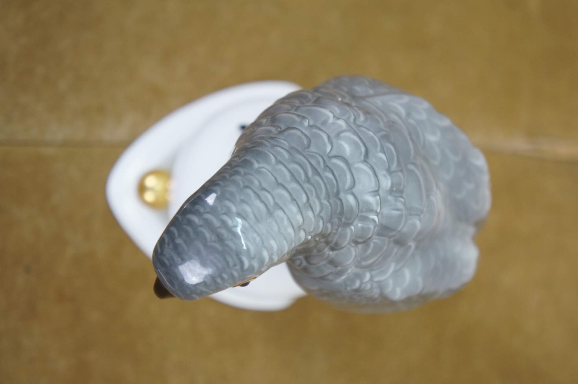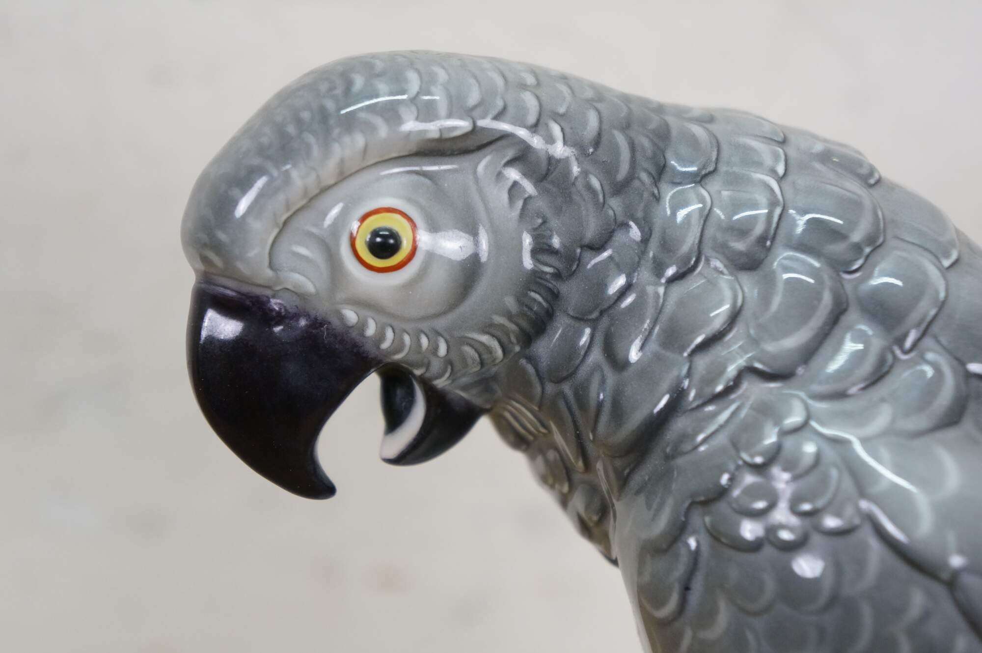 Antique Art Deco 1925 Hutschenreuther porcelain figurine in the shape of an African Gray Parrot perched on a white orb with gilt orb accents. Designed by Fritz Klee.