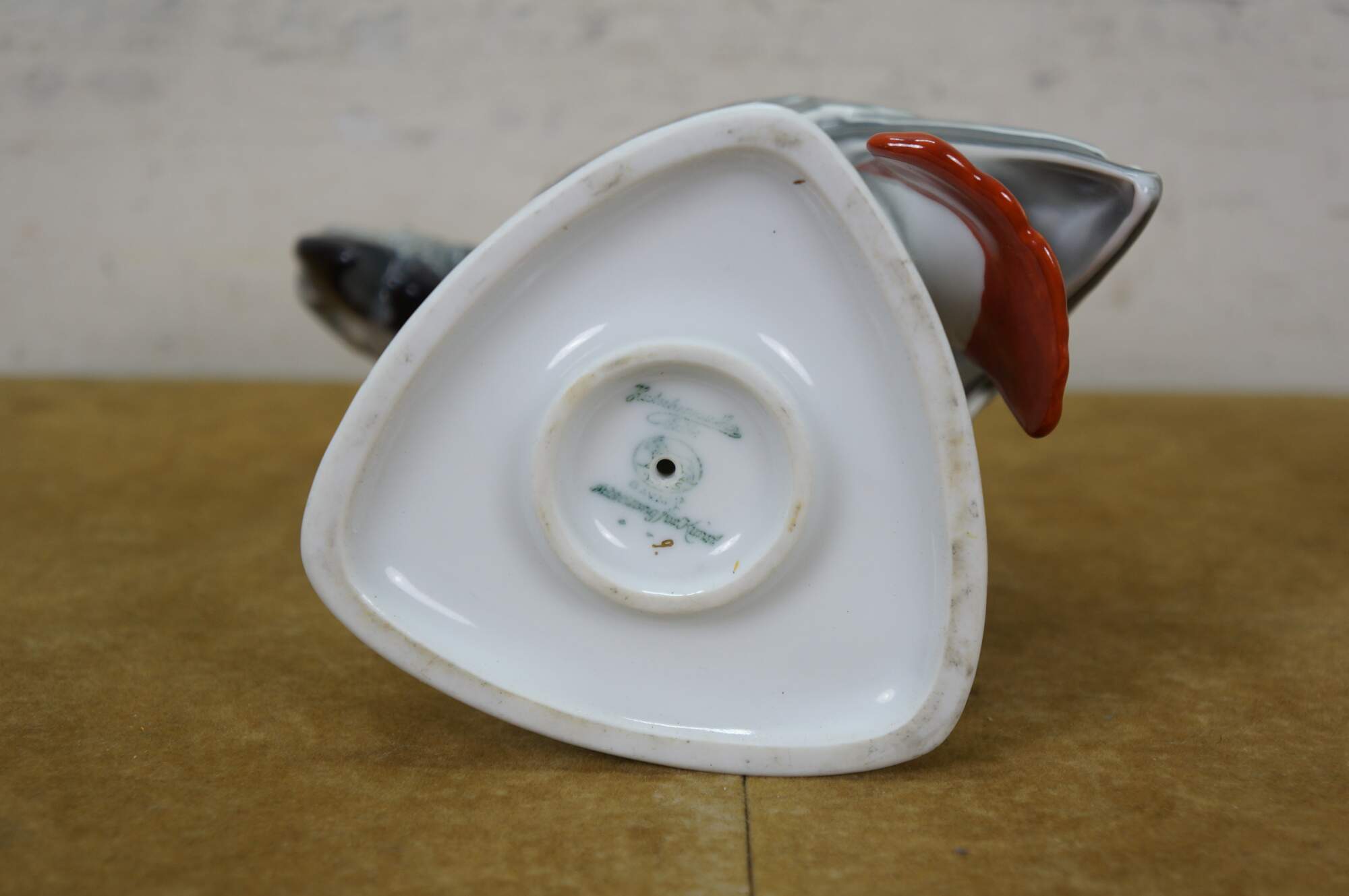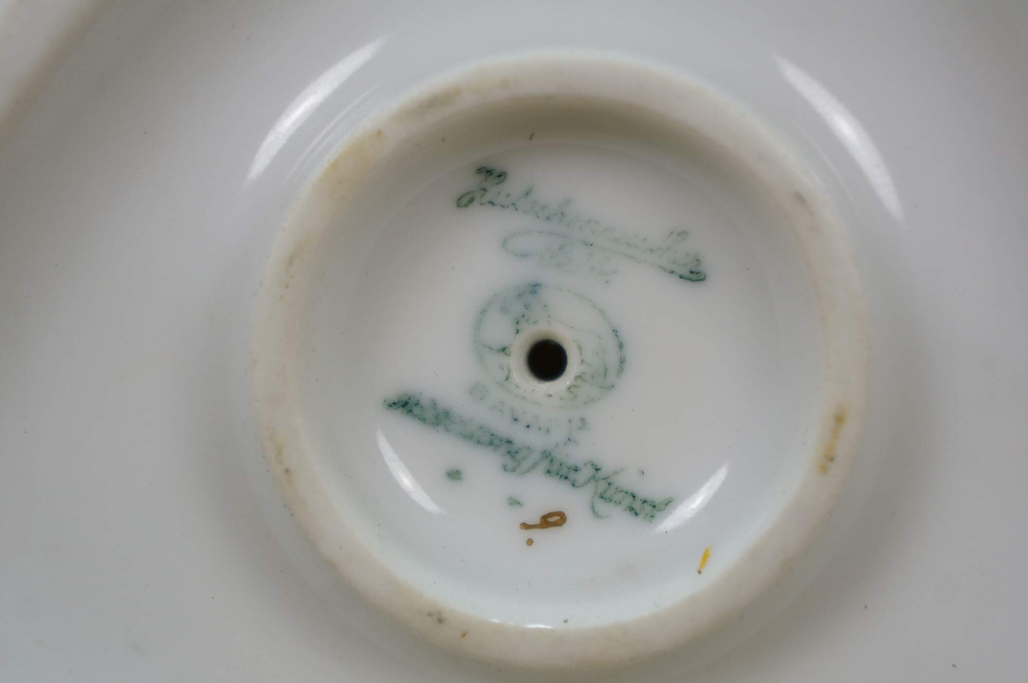 "The Hutschenreuther porcelain business was founded in 1814 by Carolus Magnus Hutschenreuther (1794–1845) in Hohenberg an der Eger, Bavaria, Germany. He had previously worked at the Wallendorf porcelain manufactory in Lichte (Wallendorf). After his death in 1845, the factory was headed by his widow, Johanna Hutschenreuther, and her two sons. A large part of the factory was destroyed by a fire in 1848, but it was rebuilt. From 1860, they produced hand-painted and gilded porcelain products. In 1857, Lorenz Hutschenreuther, the elder son of Carolus Magnus Hutschenreuther, established a porcelain factory in Selb. The two companies were competitors and didn't cooperate. They expanded from 1902 to 1969 and were named Porzellanfabriken Lorenz Hutschenreuther AG Selb (Lorenz Hutschenreuther Porcelain Factories Company, Selb). C.M. Hutschenreuther purchased the Carl Auvera (G.Bauer) factories (Arzberg) in 1918. Hutschenreuther acquired the following other porcelain manufacturers: Jaeger, Werner & Co., Selb (1906), Paul Mueller, Selb (1917), Bauscher brothers, Weiden (1927), Tirschenreuth porcelain factory (1927), Königszelt porcelain factory, Königszelt (today Jaworzyna Śląska), and Silesia (1928). In 1969, Porzellanfabriken Lorenz Hutschenreuther AG Selb merged with C. M. Hutschenreuther of Hohenberg. Hutschenreuther became part of the Rosenthal division of the Waterford Wedgwood Group in 2000." (Source: Wikipedia / The Old Stuff / Stein Marks)