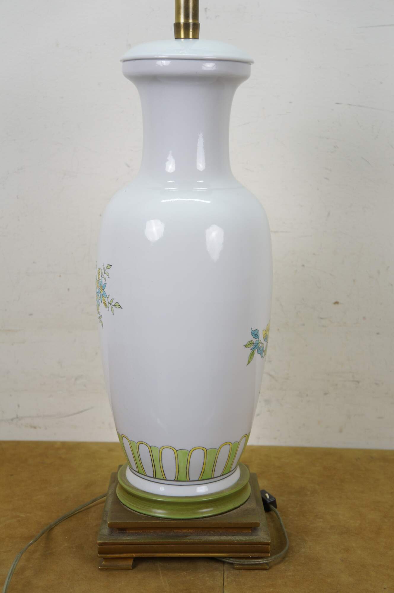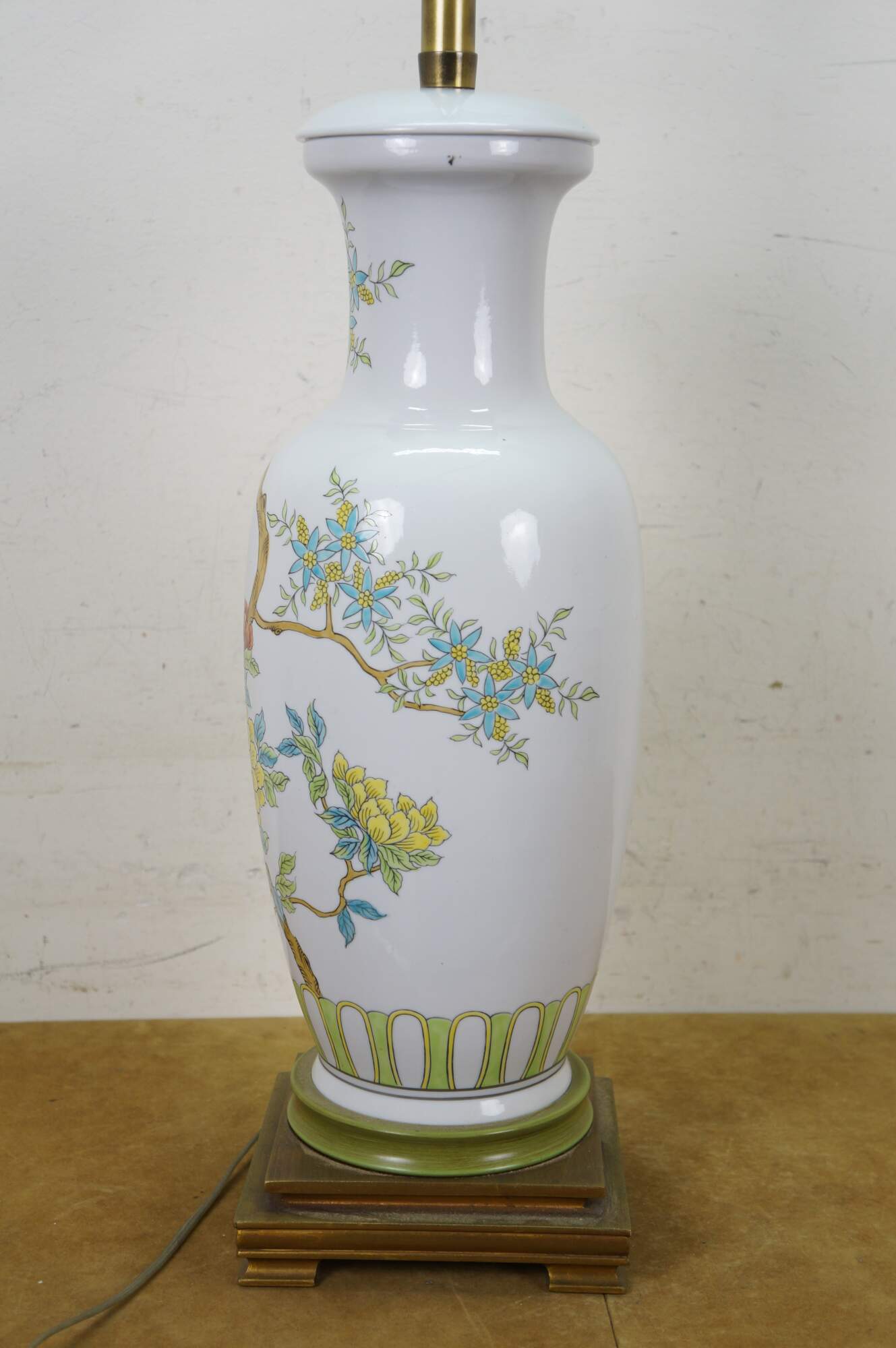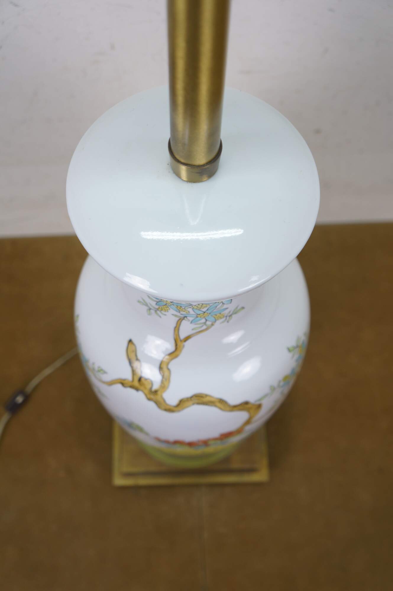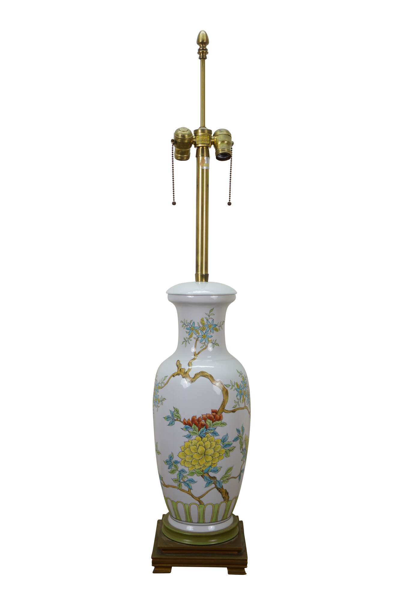 Mid century Chinese chinoiserie two light table lamp by Marbro Lamp Company. White porcelain body in the shape of a tall ginger jar / vase / urn, hand painted with a famille rose inspired design of floral branches / chrysanthemums and green scalloped border, set on a square tired base. Includes brass finial and white velour shade. Pull chains at sockets and switch on cord.