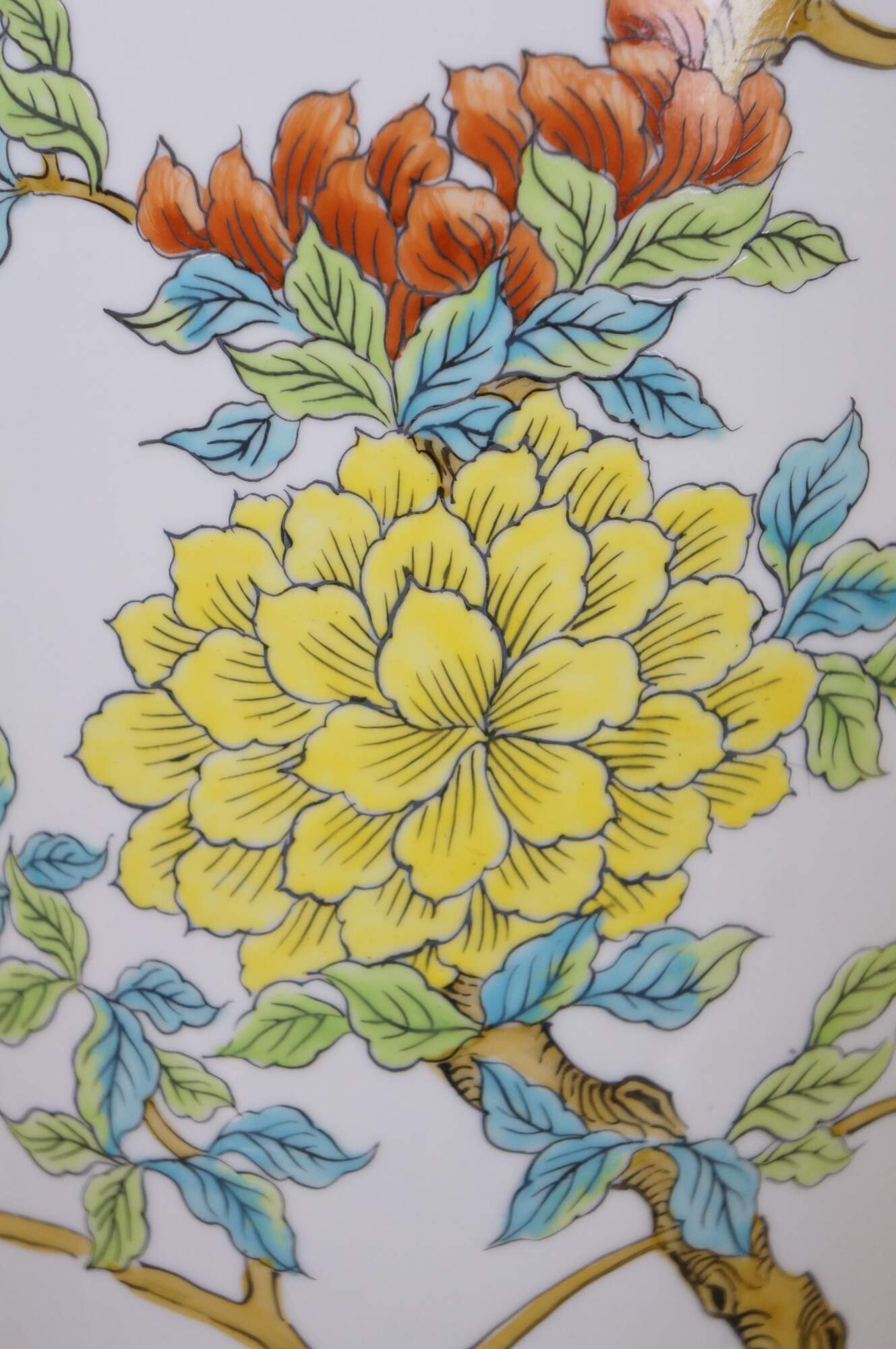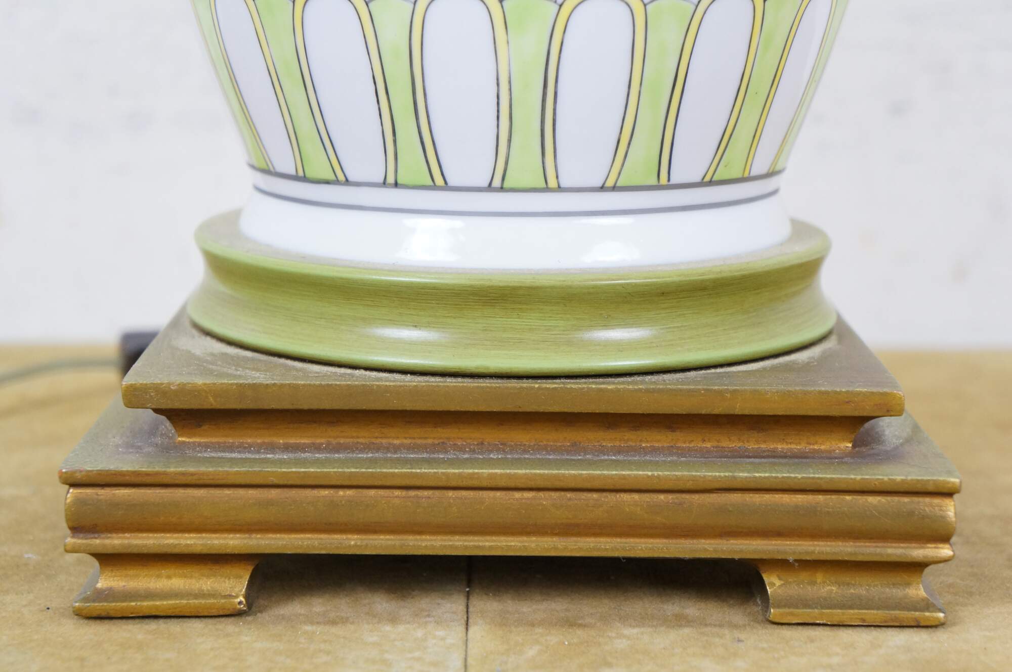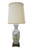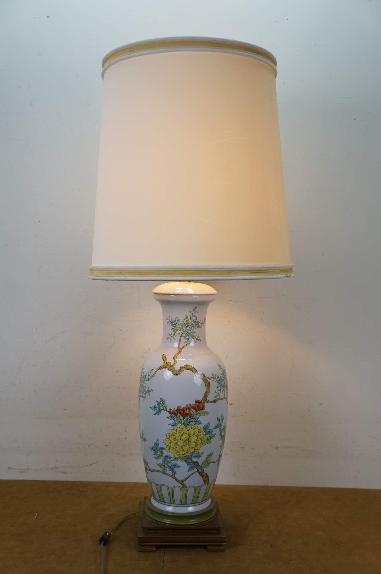 Mid century Chinese chinoiserie two light table lamp by Marbro Lamp Company. White porcelain body in the shape of a tall ginger jar / vase / urn, hand painted with a famille rose inspired design of floral branches / chrysanthemums and green scalloped border, set on a square tired base. Includes brass finial and white velour shade. Pull chains at sockets and switch on cord.