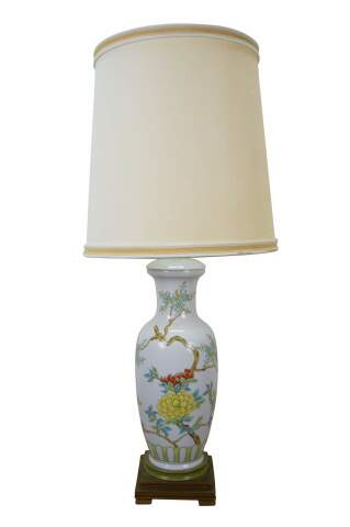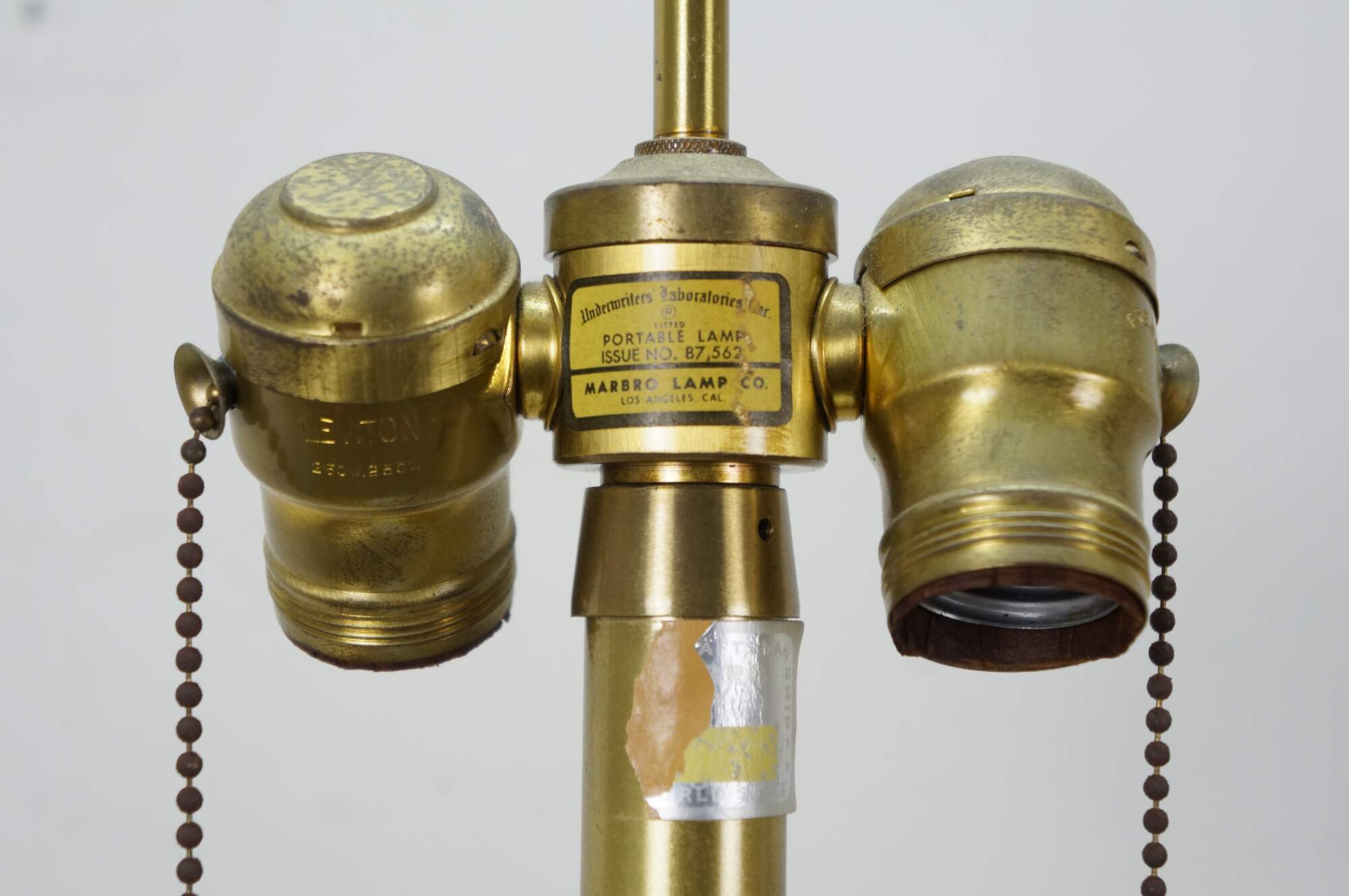 "The history of Marbro lamps dates back to 1934, when brothers Morris and Elliott Markoff founded the Marbro Lamp Company. The brothers relocated from Chicago to southern California after the end of World War II and set up an assembly plant in the garment district of Los Angeles. Vases and objets d'art sourced from all over the world were used as lamp bases. The brass bases came from India, alabaster from Italy, porcelain from Japan and China and crystal from Germany and France. Murano glass and whimsical bronze figurines were two of the more popular base materials. Marbro lamps were one of a kind and took between 75 and 90 days to complete. Occasionally, they were made from sculptures that customers brought into the factory. Highly skilled woodturners and shade-makers crafted lampshades and wooden bases in Marbro's shop. The company's best-known products were these table lamps, but it also produced a wide variety of decorative objects. The Masco Corporation acquired the Marbro Lamp Company in 1987. Its Los Angeles assembly plant shuttered its doors in 1990. Its equipment and remaining inventory were moved to LaBarge Mirrors — a Masco subsidiary — in Michigan. Shortly after, the production of Marbro lamps ended." (1st Dibs)
