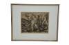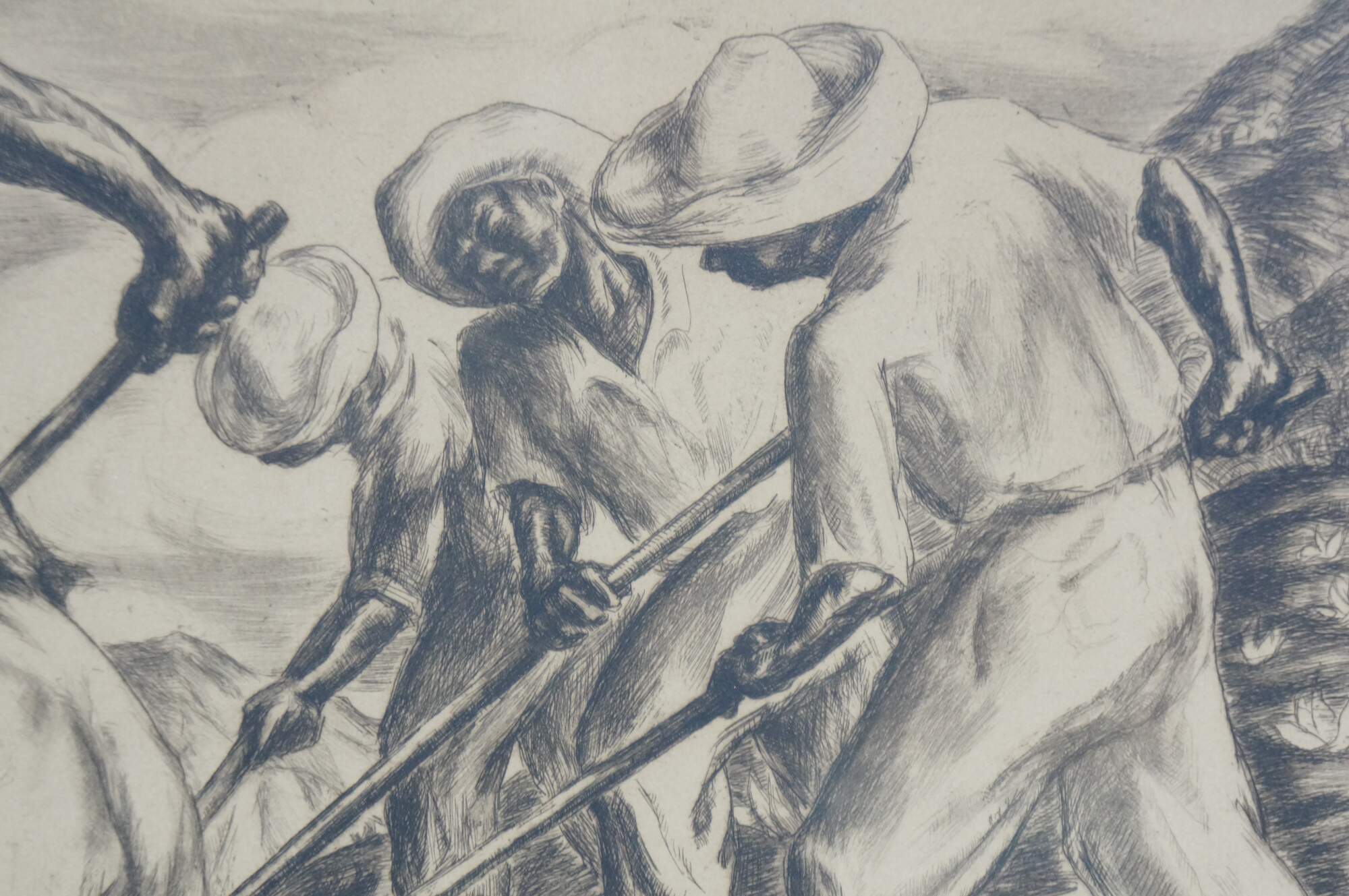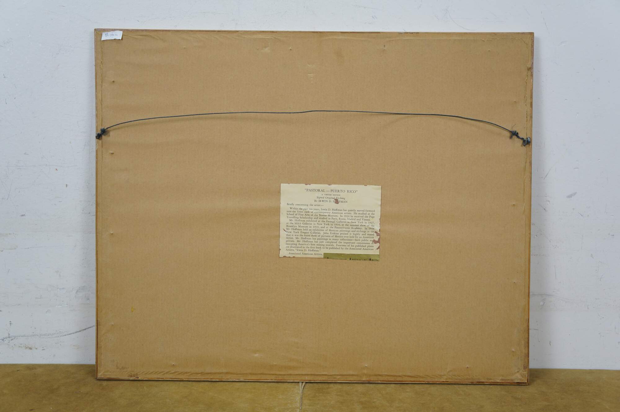 Circa late 1930's signed etching by Irwin D. Hoffman titled Pastoral - Puerto Rico. Depicts a group of four farm laborers working a hillside field. Pencil signed and titled along lower edge. Signed in plate Irwin D. Hoffman 1938, lower left. Hoffman's brothers owned a mining company and prospected in the southwest, Mexico and Puerto Rico. The artist in Hoffman was heavily influenced by the people of the small villages that he visited while with his brothers' mining company. He was a painter, etcher, sculptor and lithographer, b.1901-1989. Published by Associated American Artists. Wood frame with black detail; white mat; original label on back.