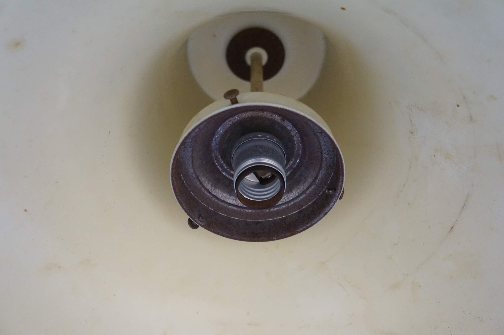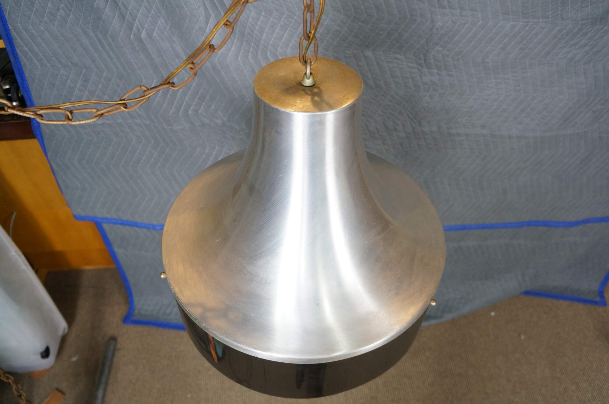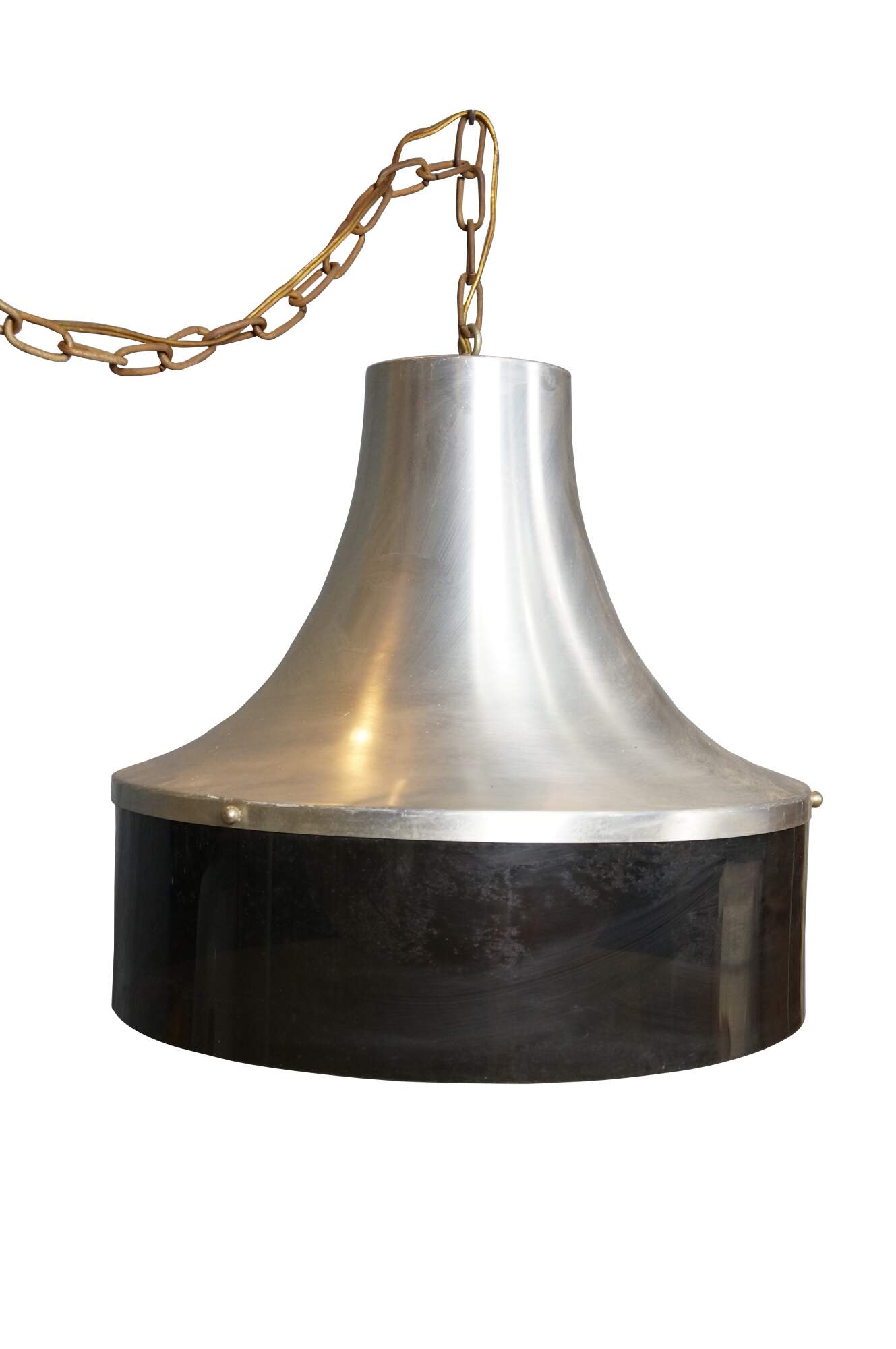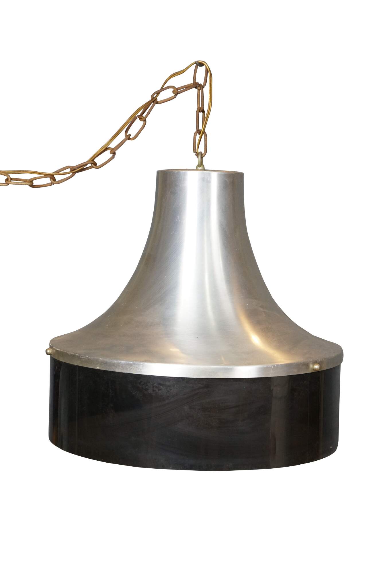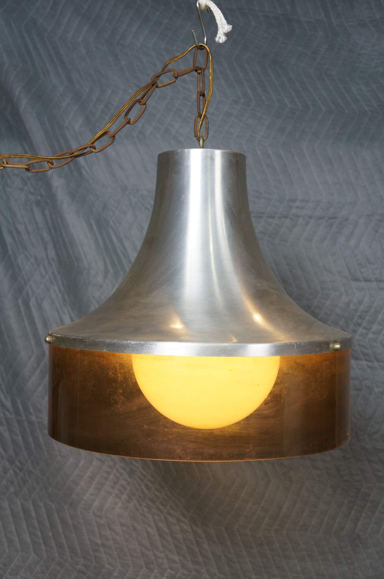 Mid 20th century globe light pendant / swag light. Hat shaped aluminum top with dark brown plastic base, concealing a milk glass shade. Includes chain. Plug.