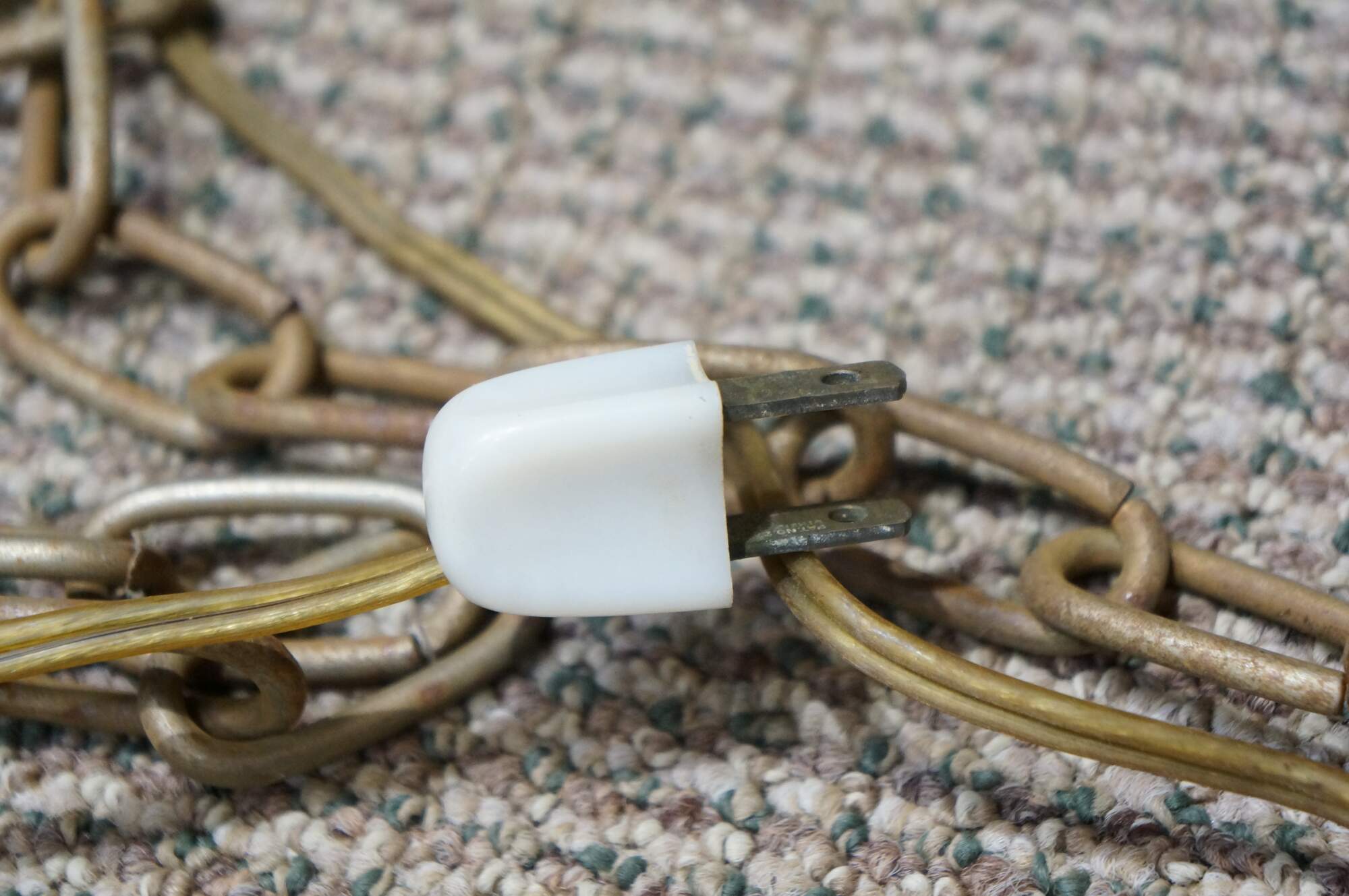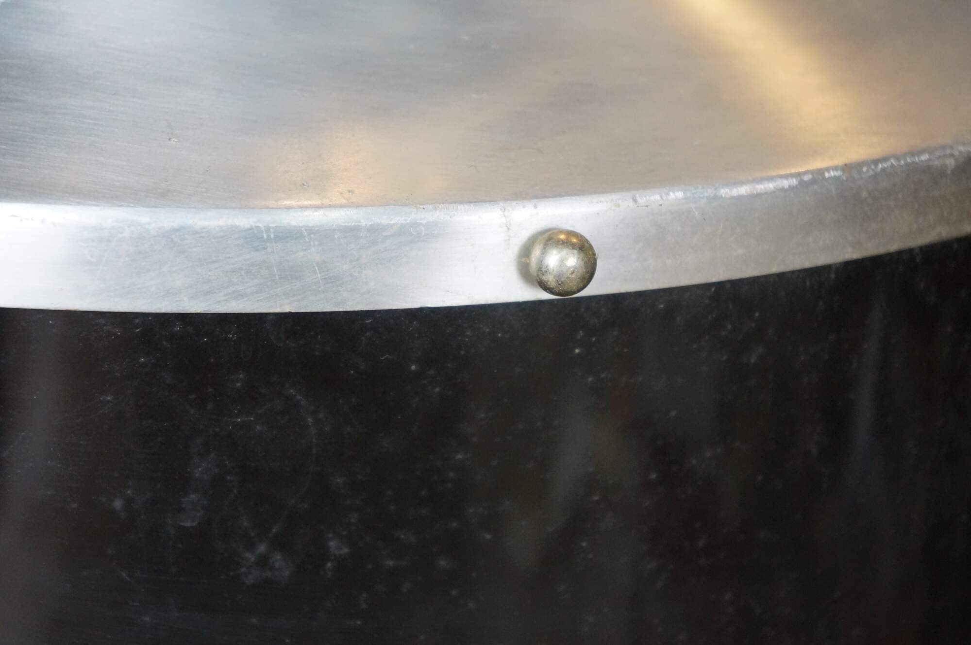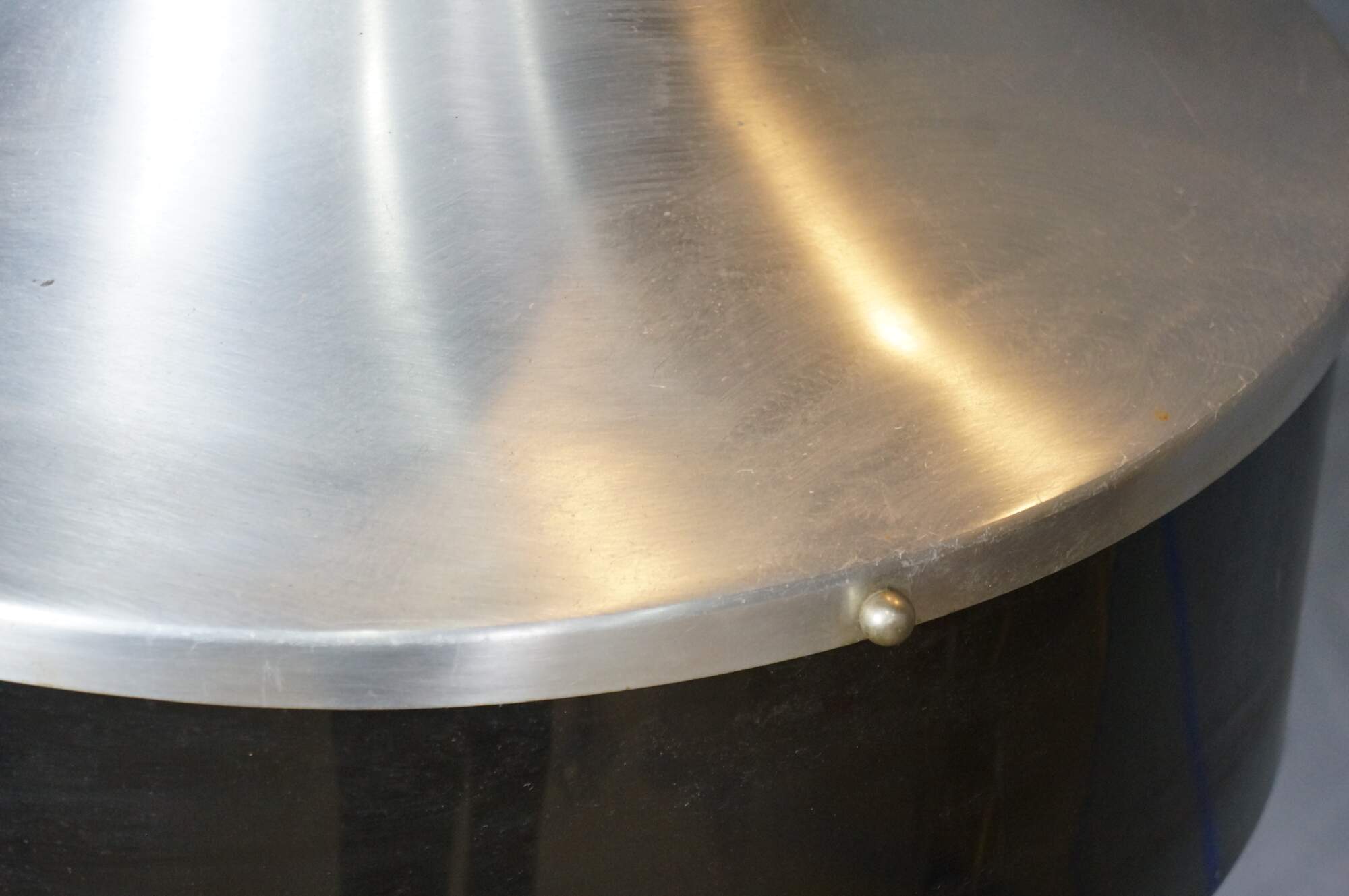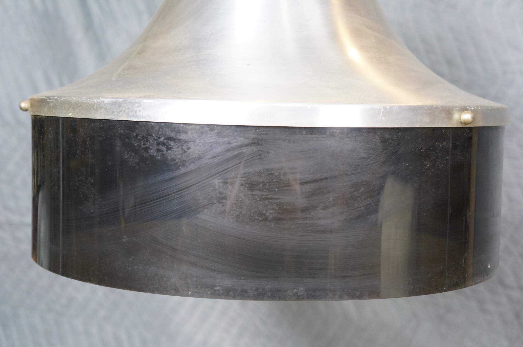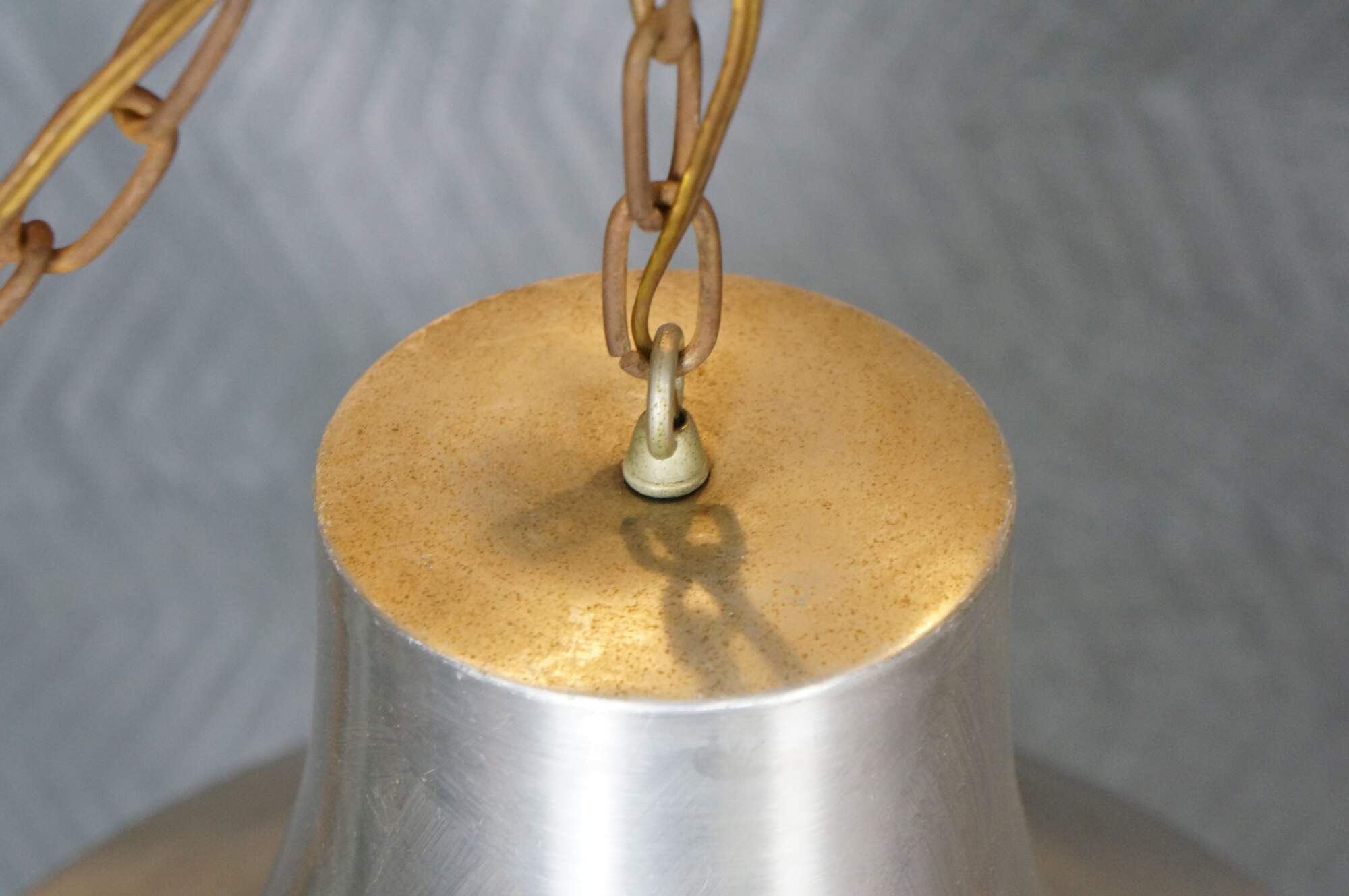 Mid 20th century globe light pendant / swag light. Hat shaped aluminum top with dark brown plastic base, concealing a milk glass shade. Includes chain. Plug.