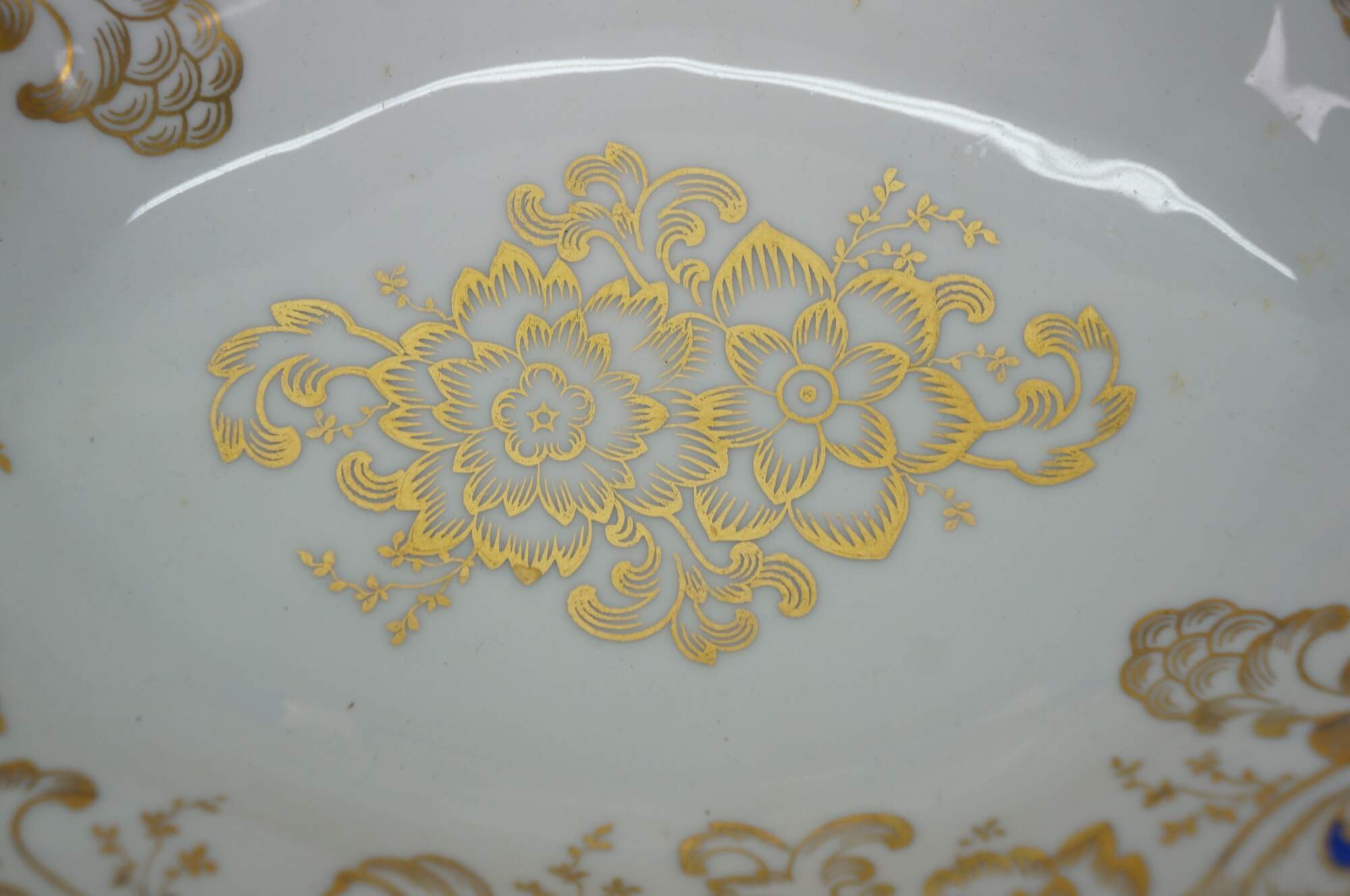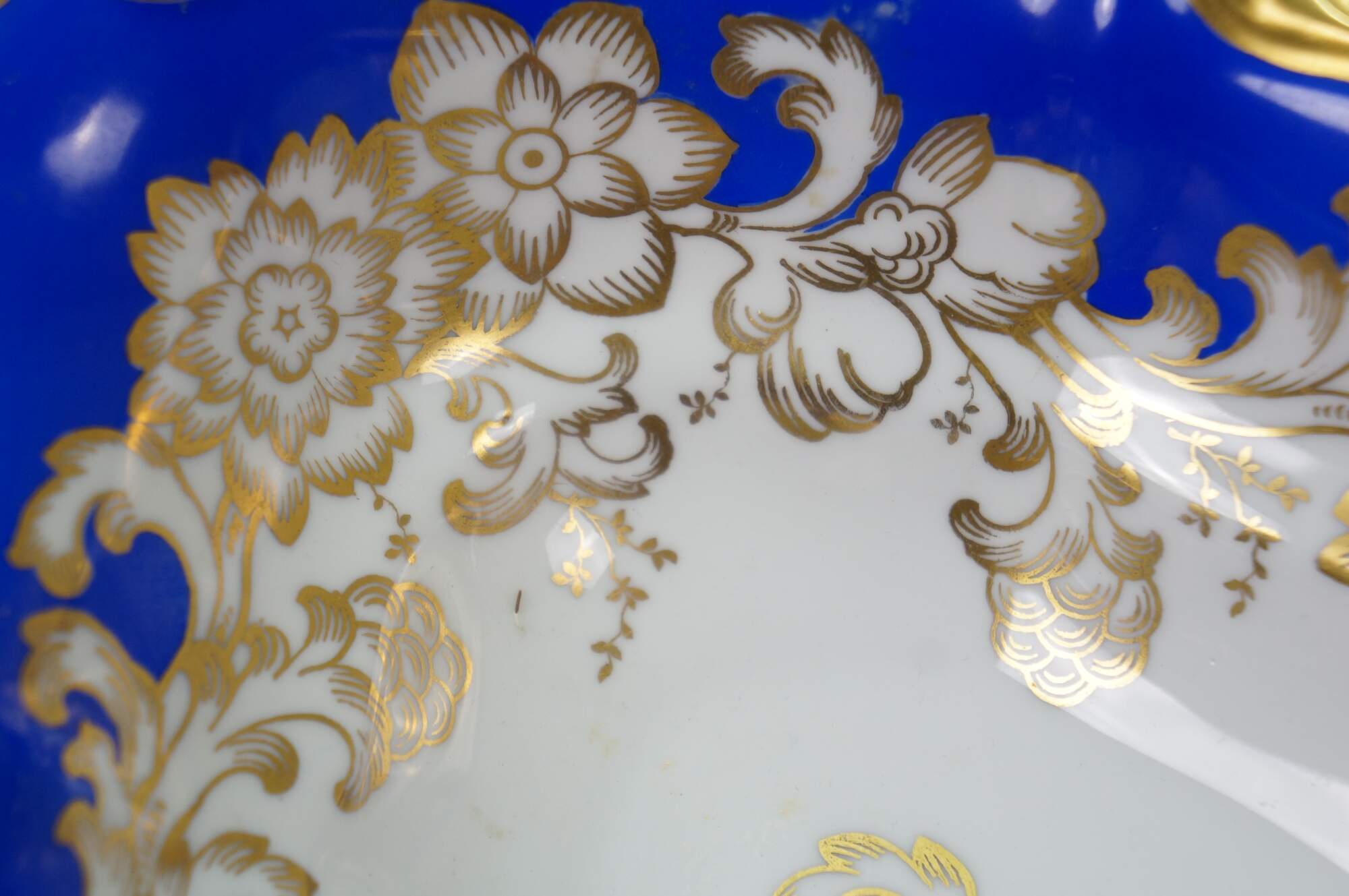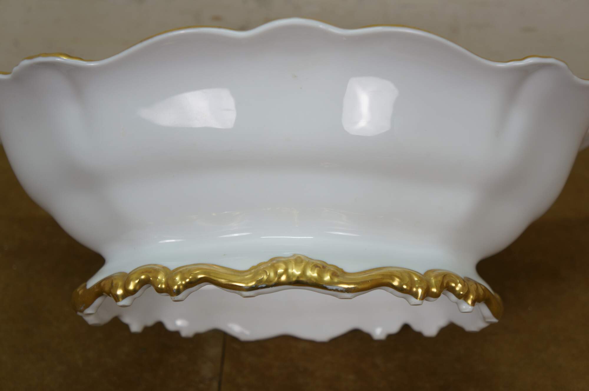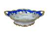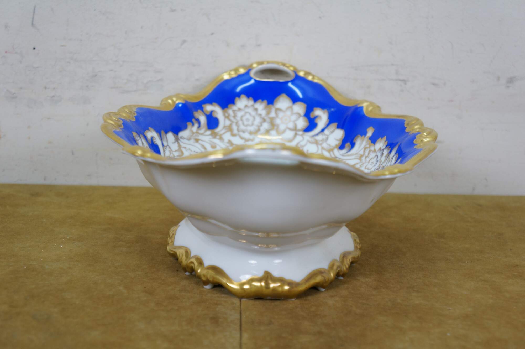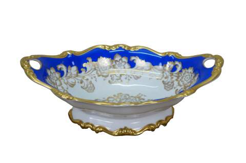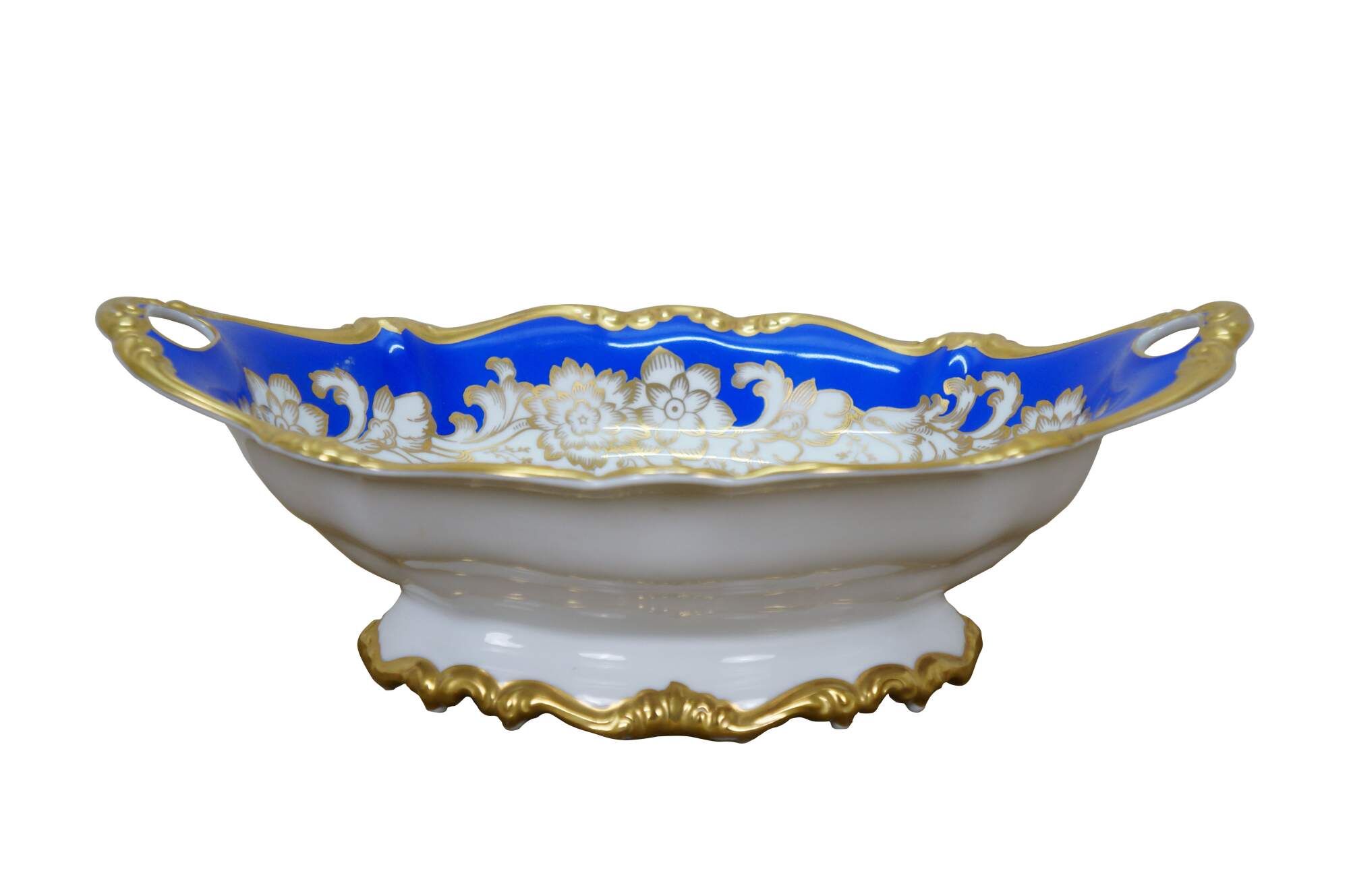 Antique 1933 Rosenthal Pompadour porcelain centerpiece / serving dish. Oval shape with scalloped edge, footed base, pierced handles, decorated with gilt flowers and trim around a deep blue border.