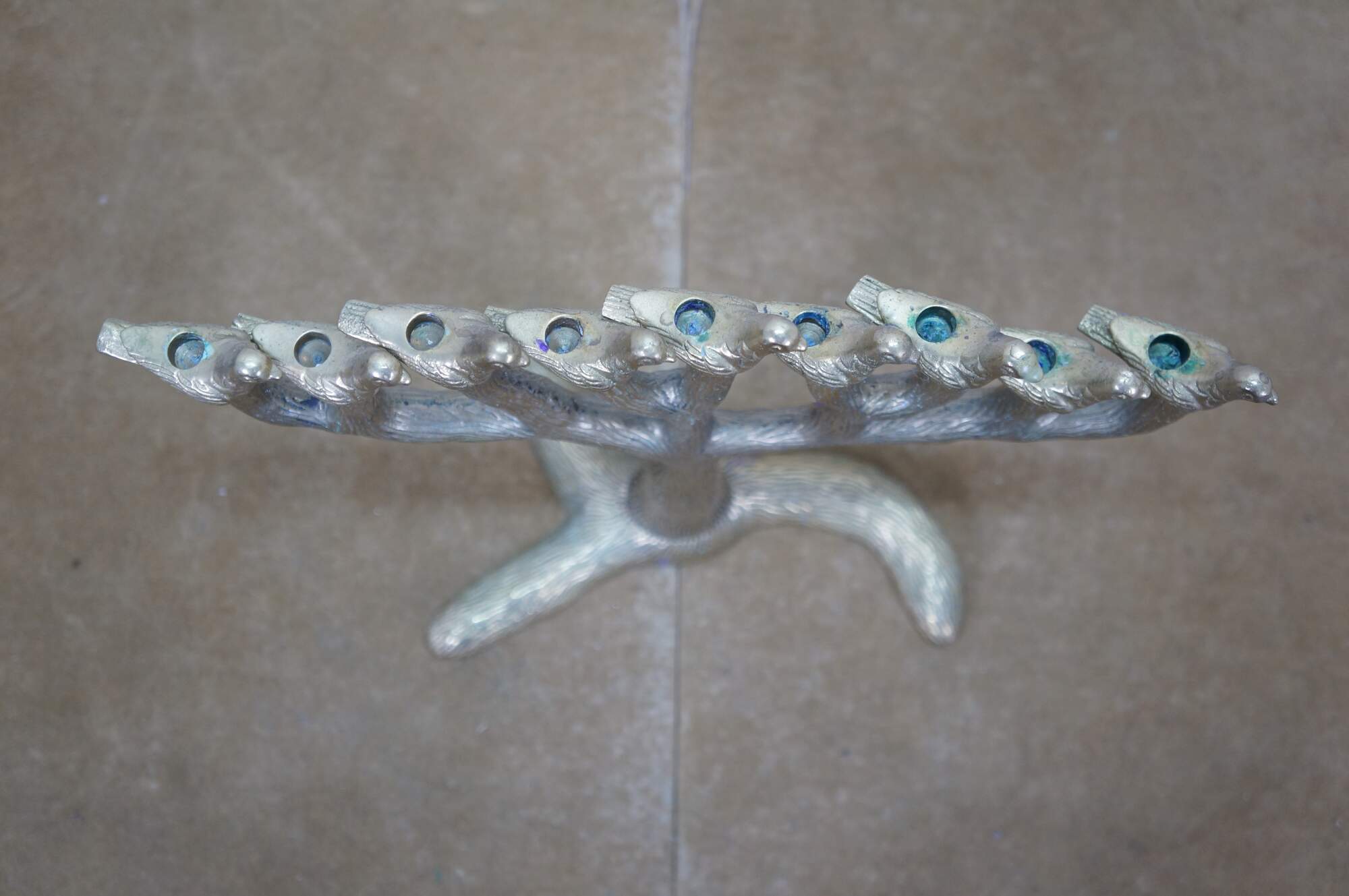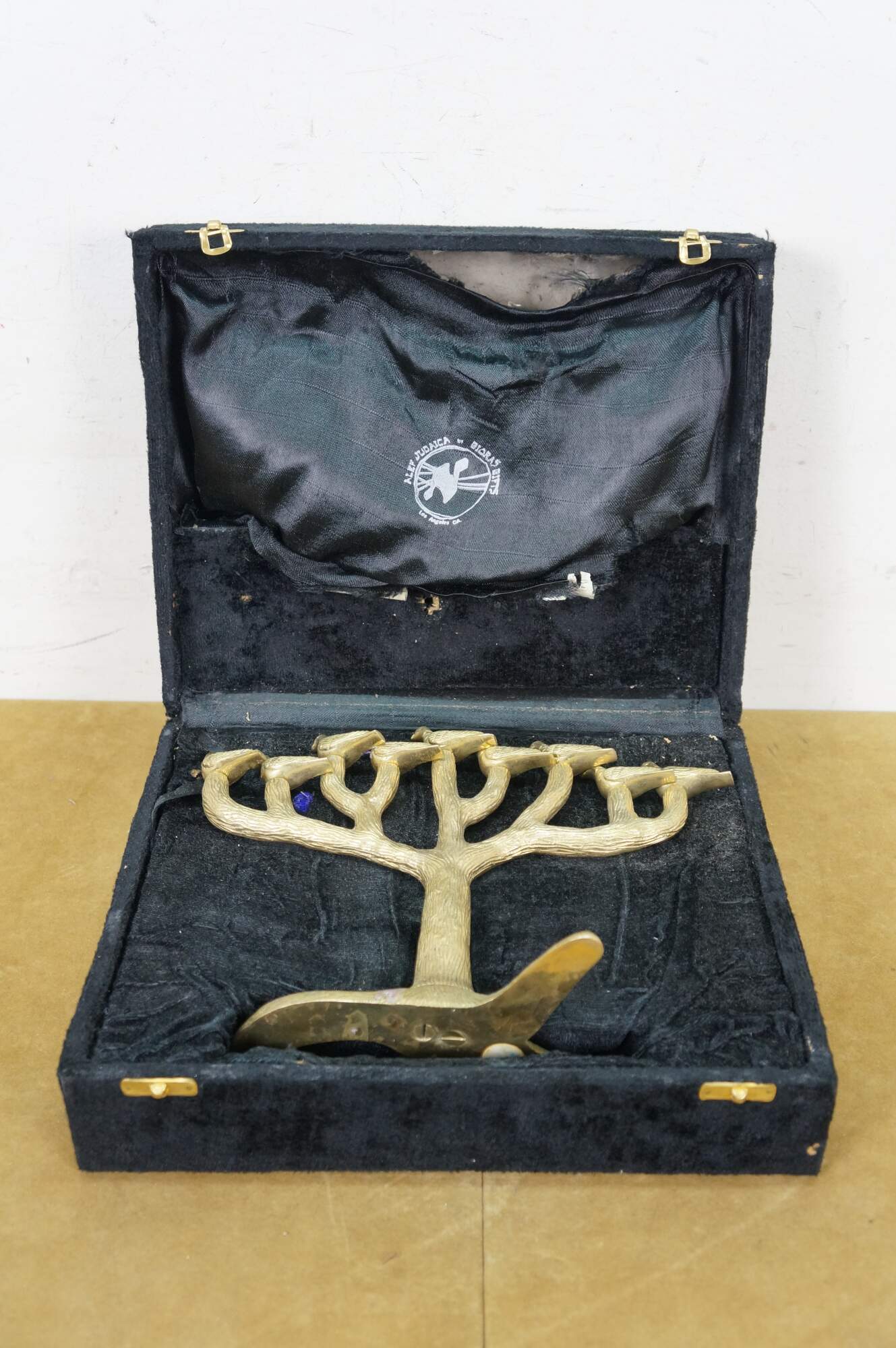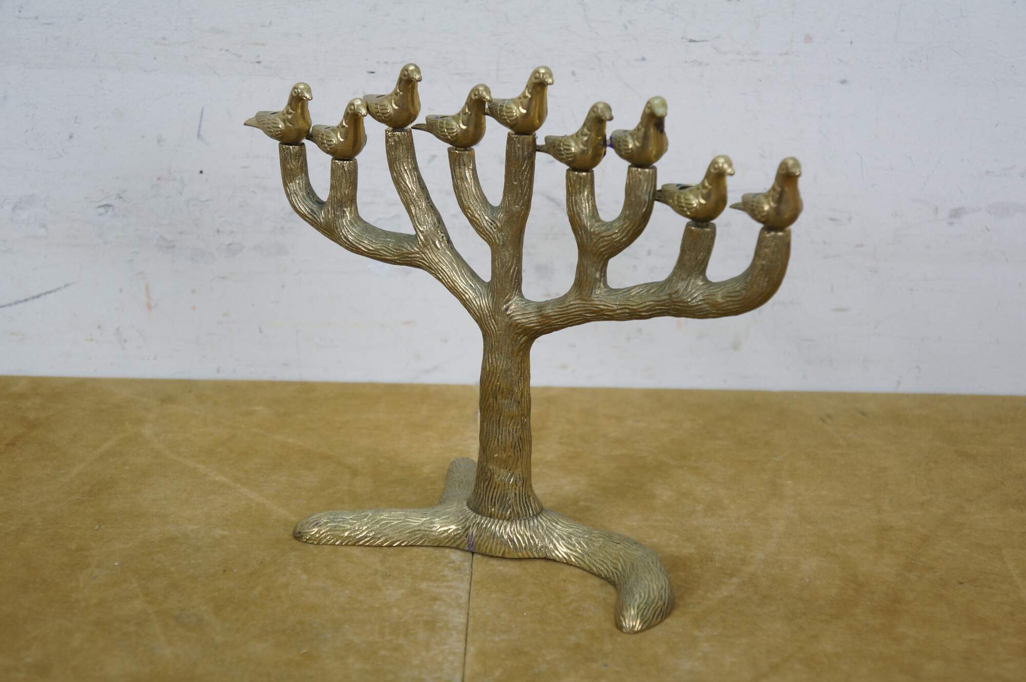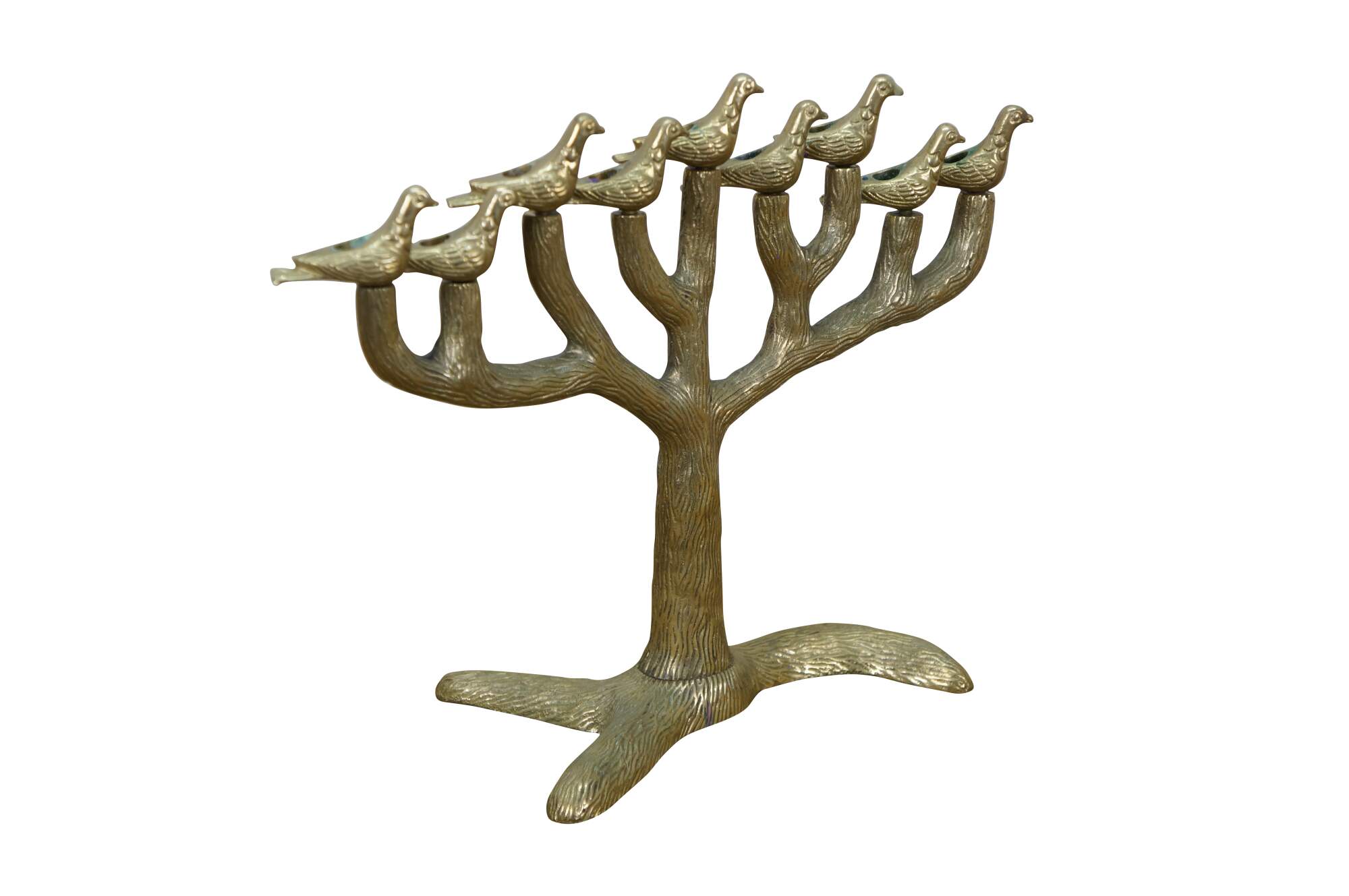 Rare vintage 20th century Alef Judaica heavy brass Chanukah menorah candle holder in the shape of a Tree of Life topped with bird / dove shaped candle cups. Includes black velvet presentation box. Gloria's Gifts of Los Angeles California.