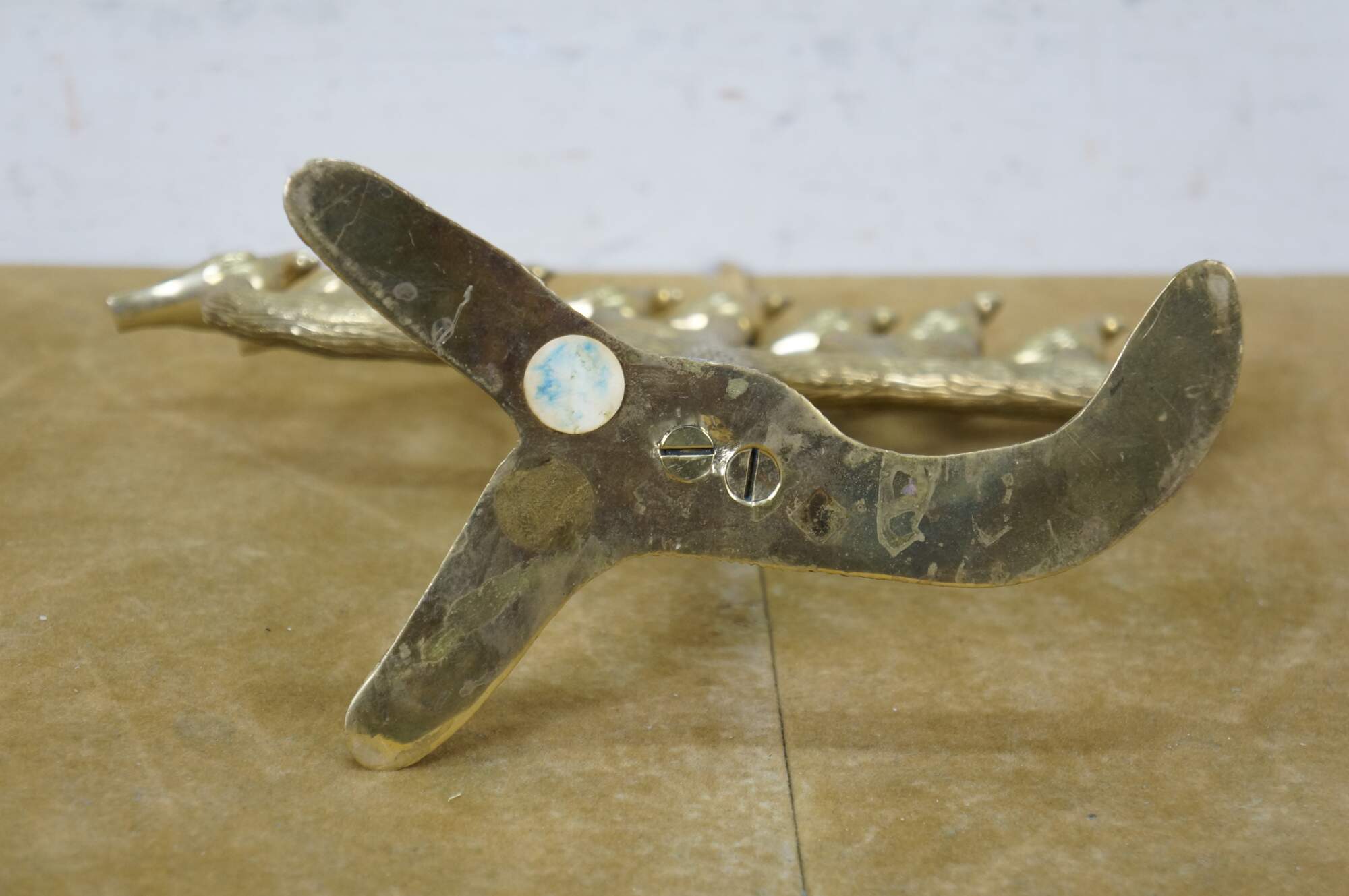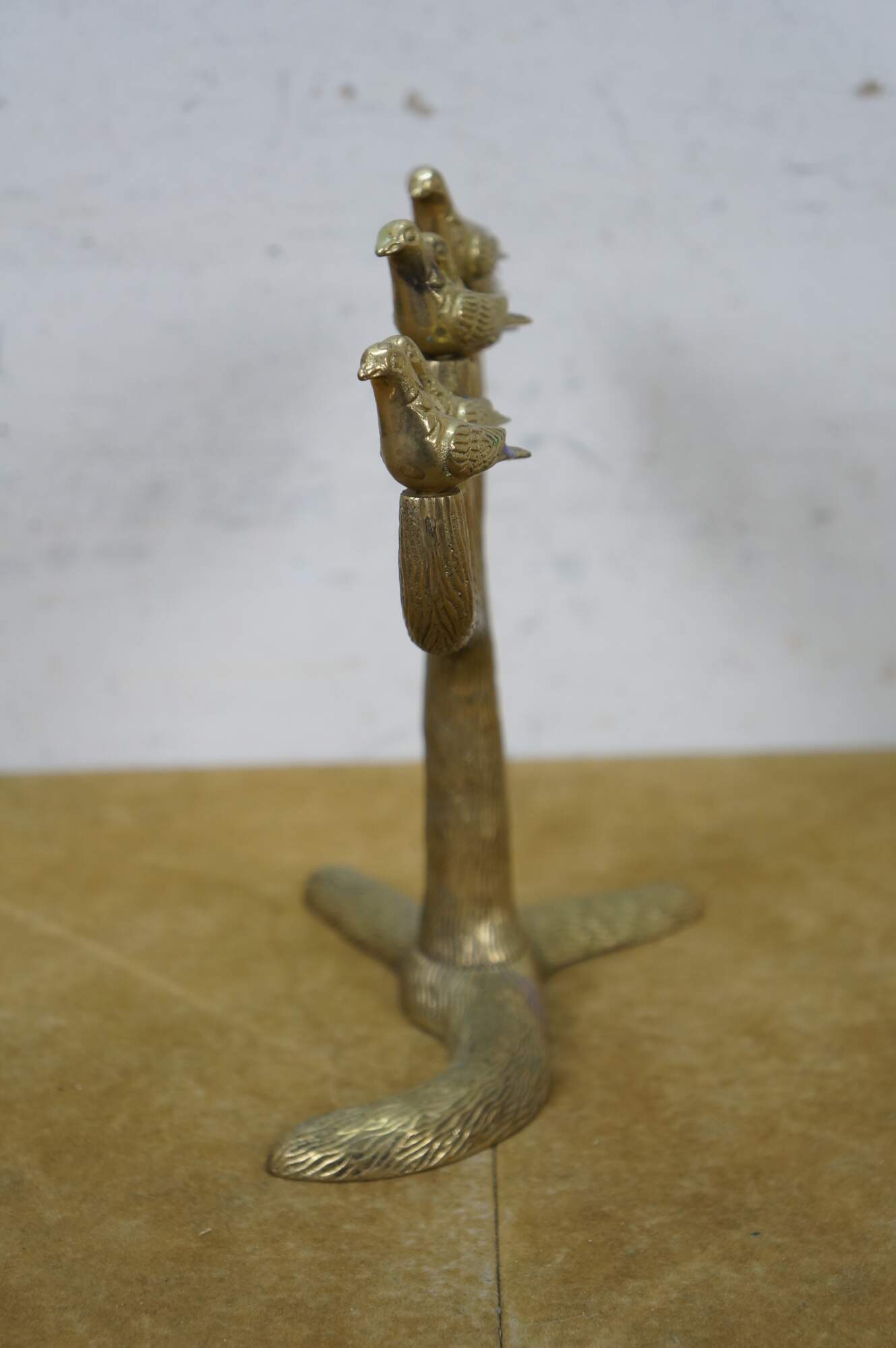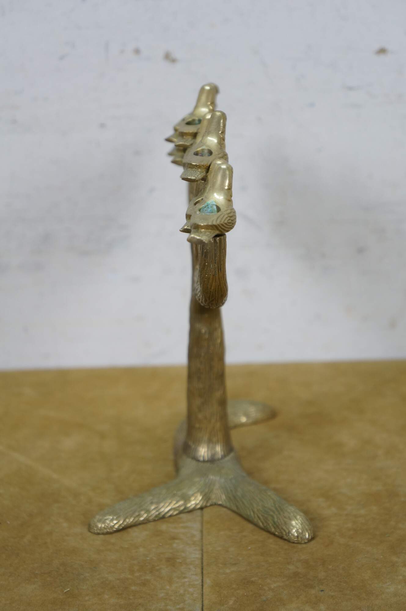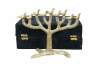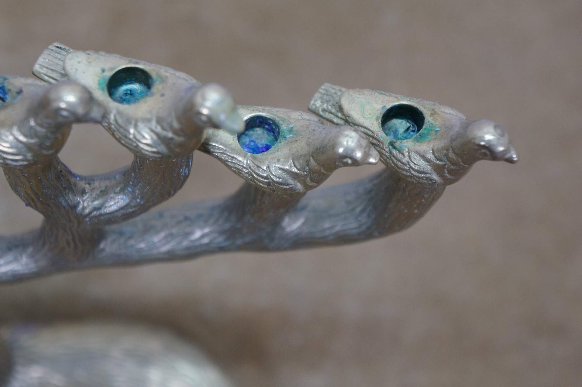 Rare vintage 20th century Alef Judaica heavy brass Chanukah menorah candle holder in the shape of a Tree of Life topped with bird / dove shaped candle cups. Includes black velvet presentation box. Gloria's Gifts of Los Angeles California.
