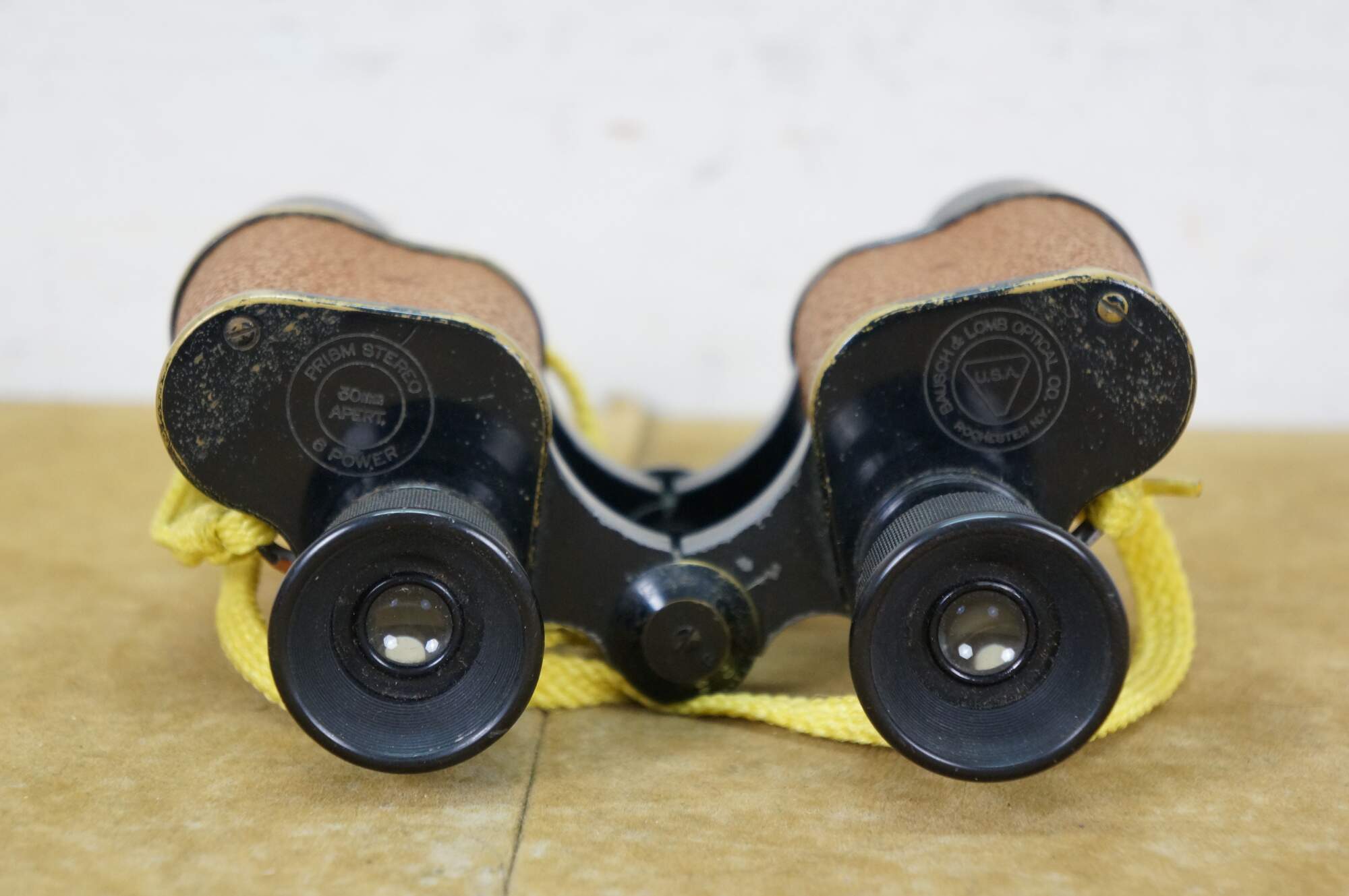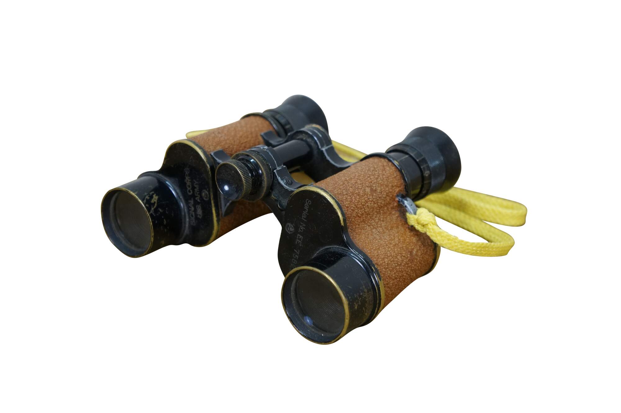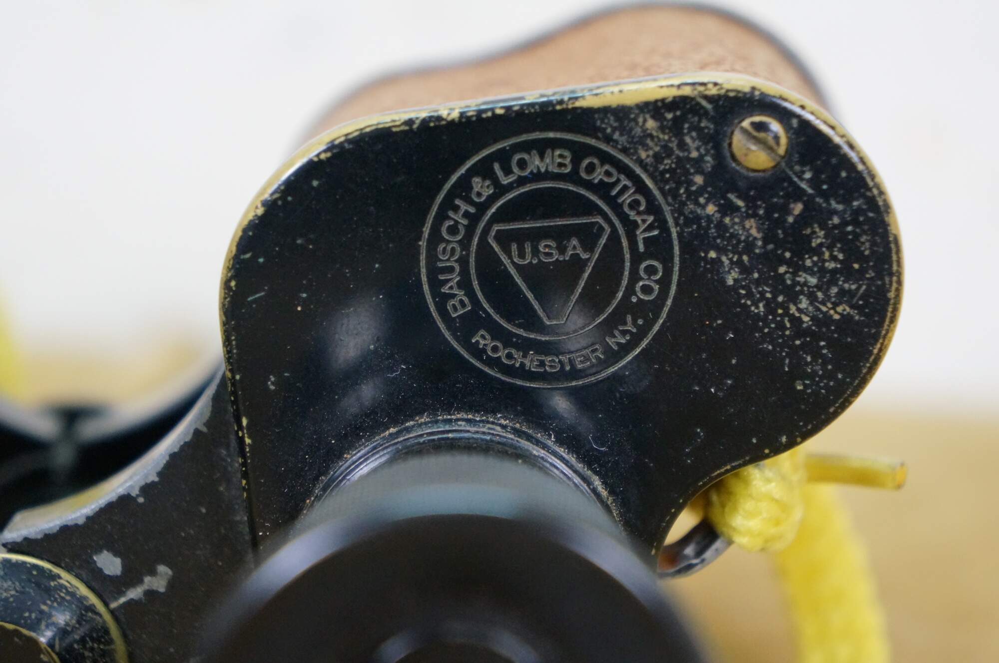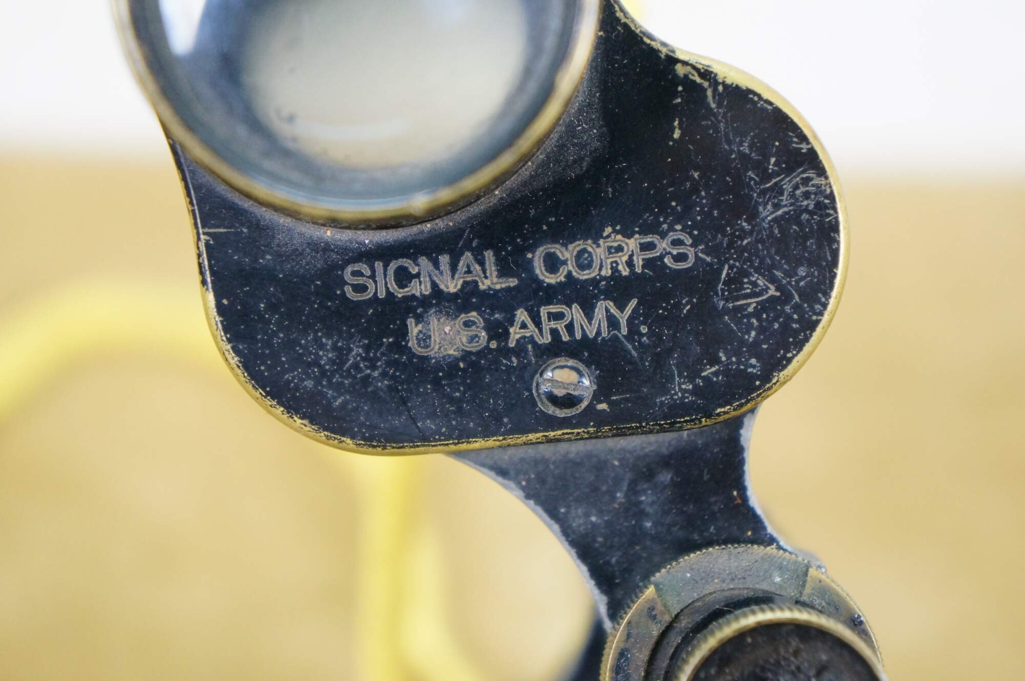 World War II era United States Army Signal Corps binoculars - black painted brass with brown leather grips. Serial Number EE 75823. Prism Stereo - 6 Power - 30mm Aperture. Made in USA by Bausch & Lomb Optical Co - Rochester , NY. Strap missing / replaced with yellow shoelace. Includes damaged leather case.