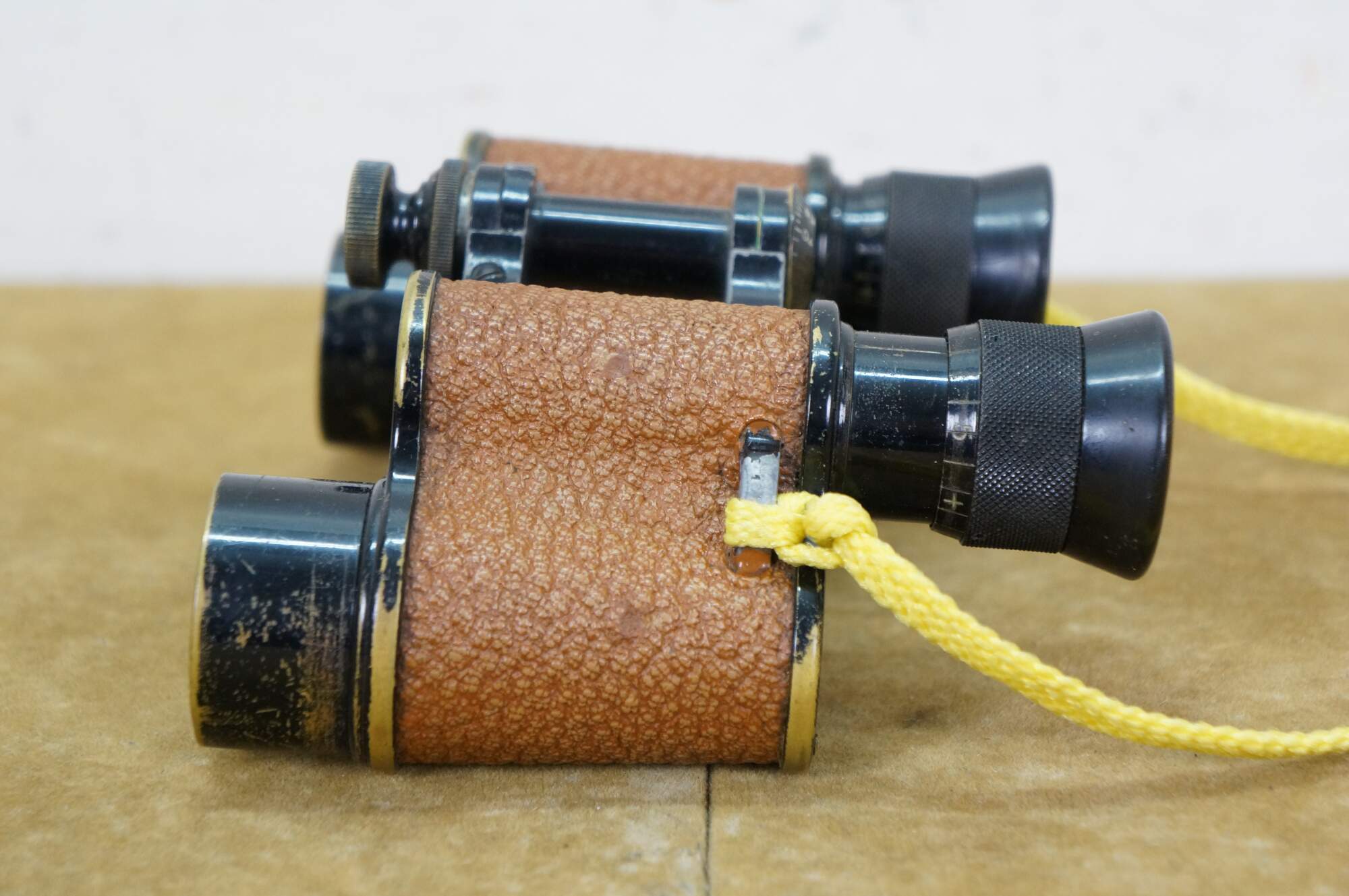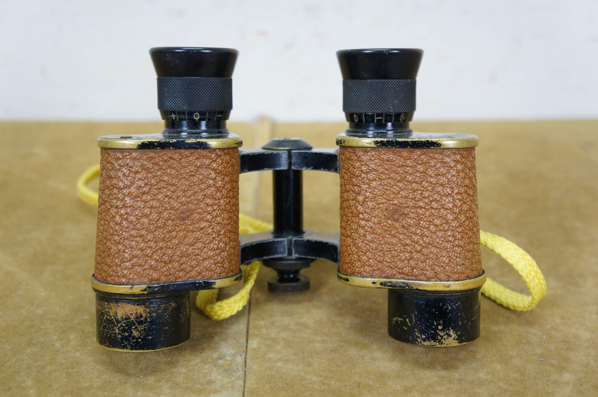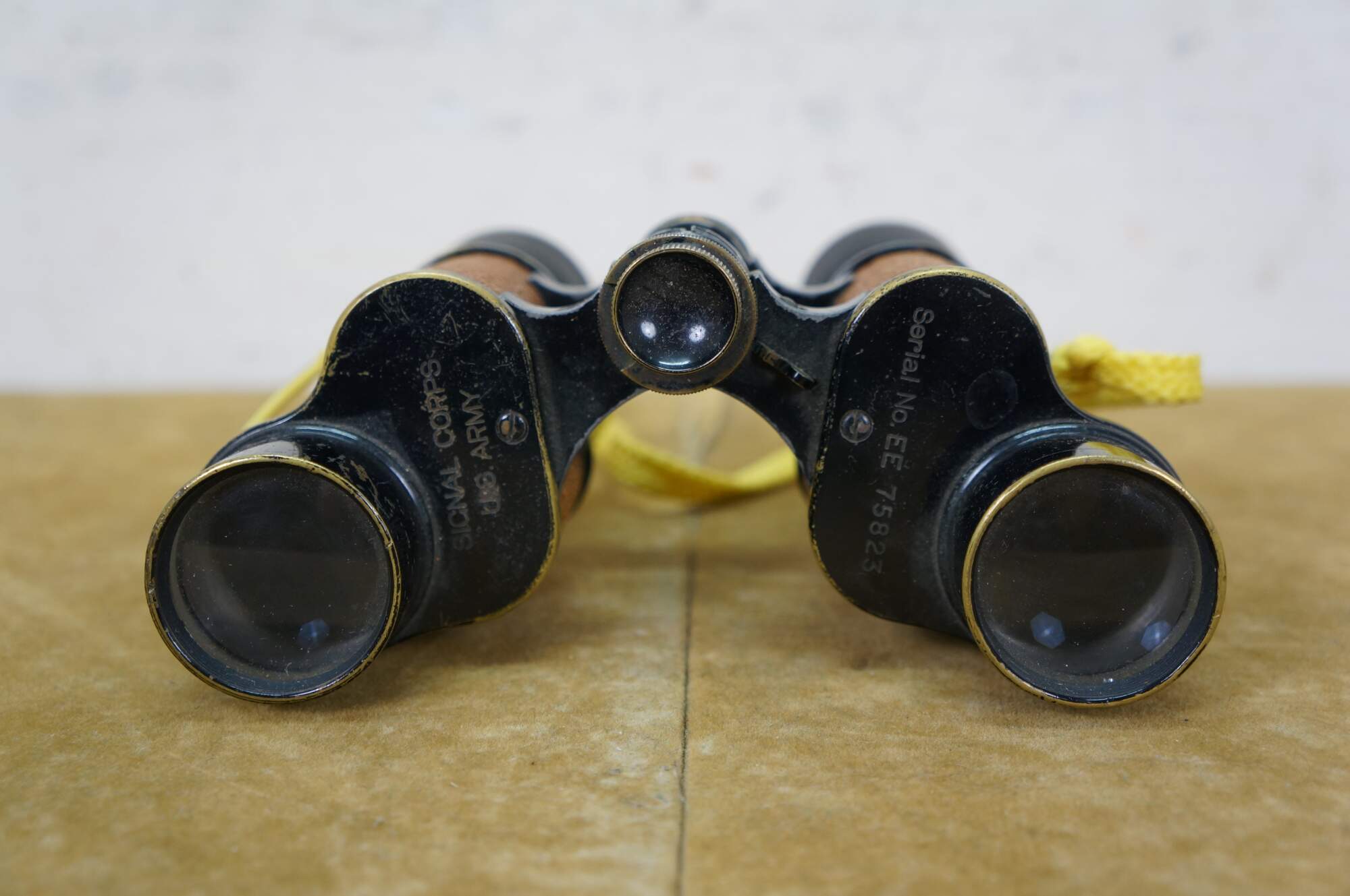 World War II era United States Army Signal Corps binoculars - black painted brass with brown leather grips. Serial Number EE 75823. Prism Stereo - 6 Power - 30mm Aperture. Made in USA by Bausch & Lomb Optical Co - Rochester , NY. Strap missing / replaced with yellow shoelace. Includes damaged leather case.