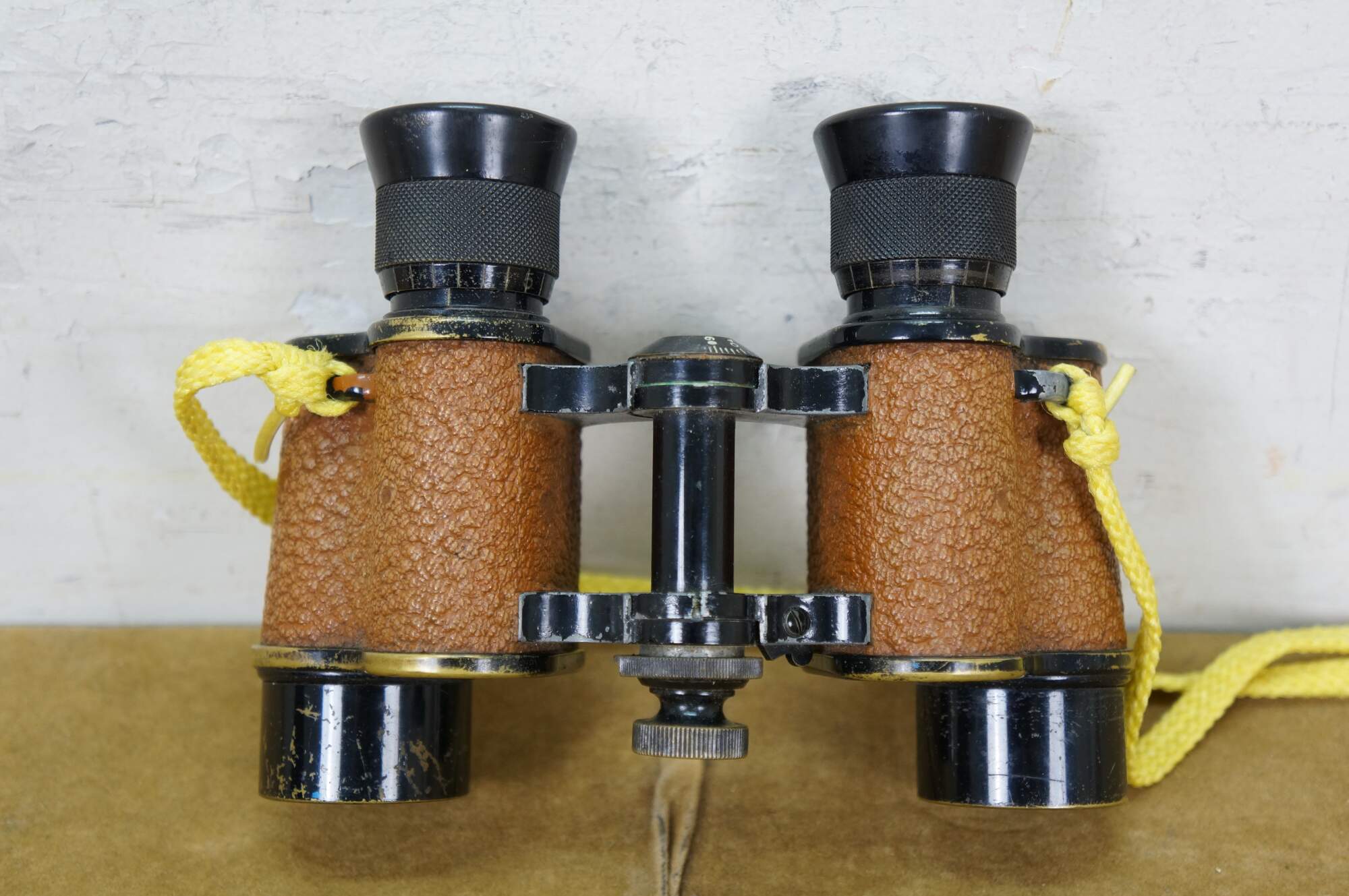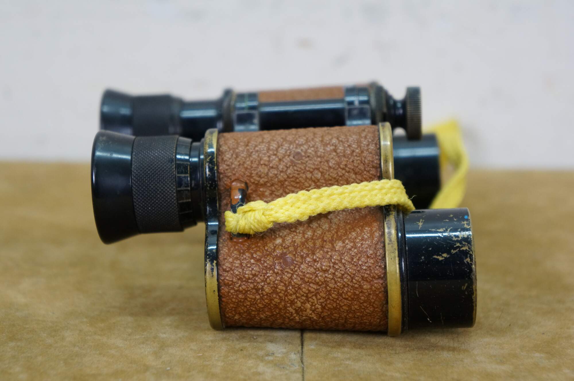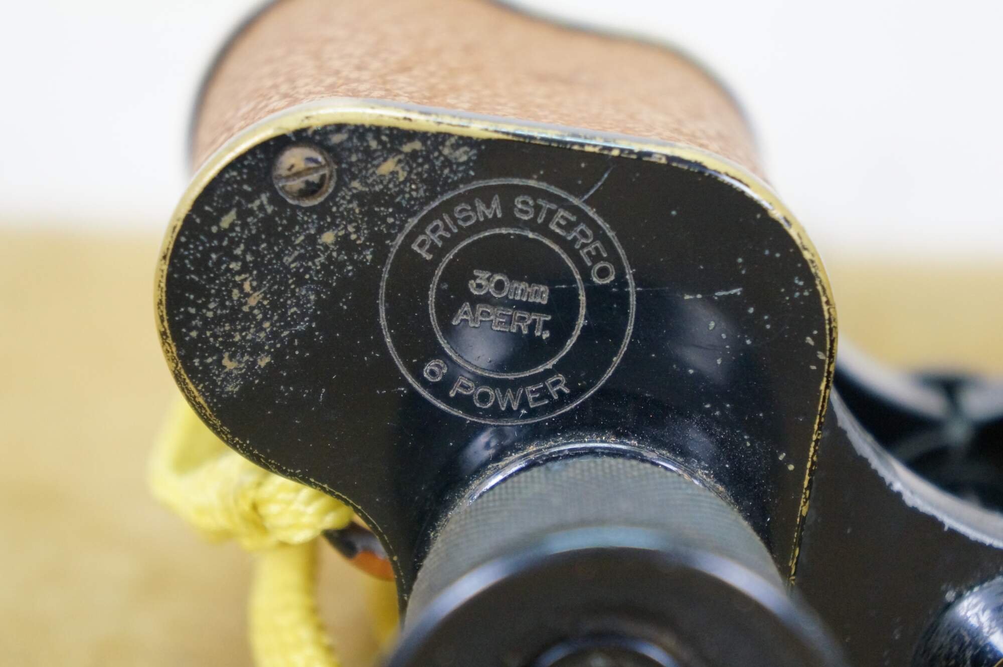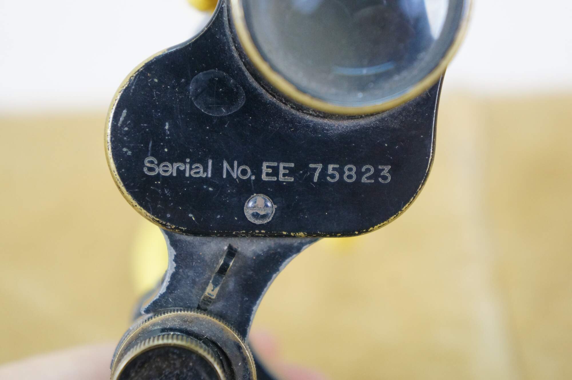 World War II era United States Army Signal Corps binoculars - black painted brass with brown leather grips. Serial Number EE 75823. Prism Stereo - 6 Power - 30mm Aperture. Made in USA by Bausch & Lomb Optical Co - Rochester , NY. Strap missing / replaced with yellow shoelace. Includes damaged leather case.