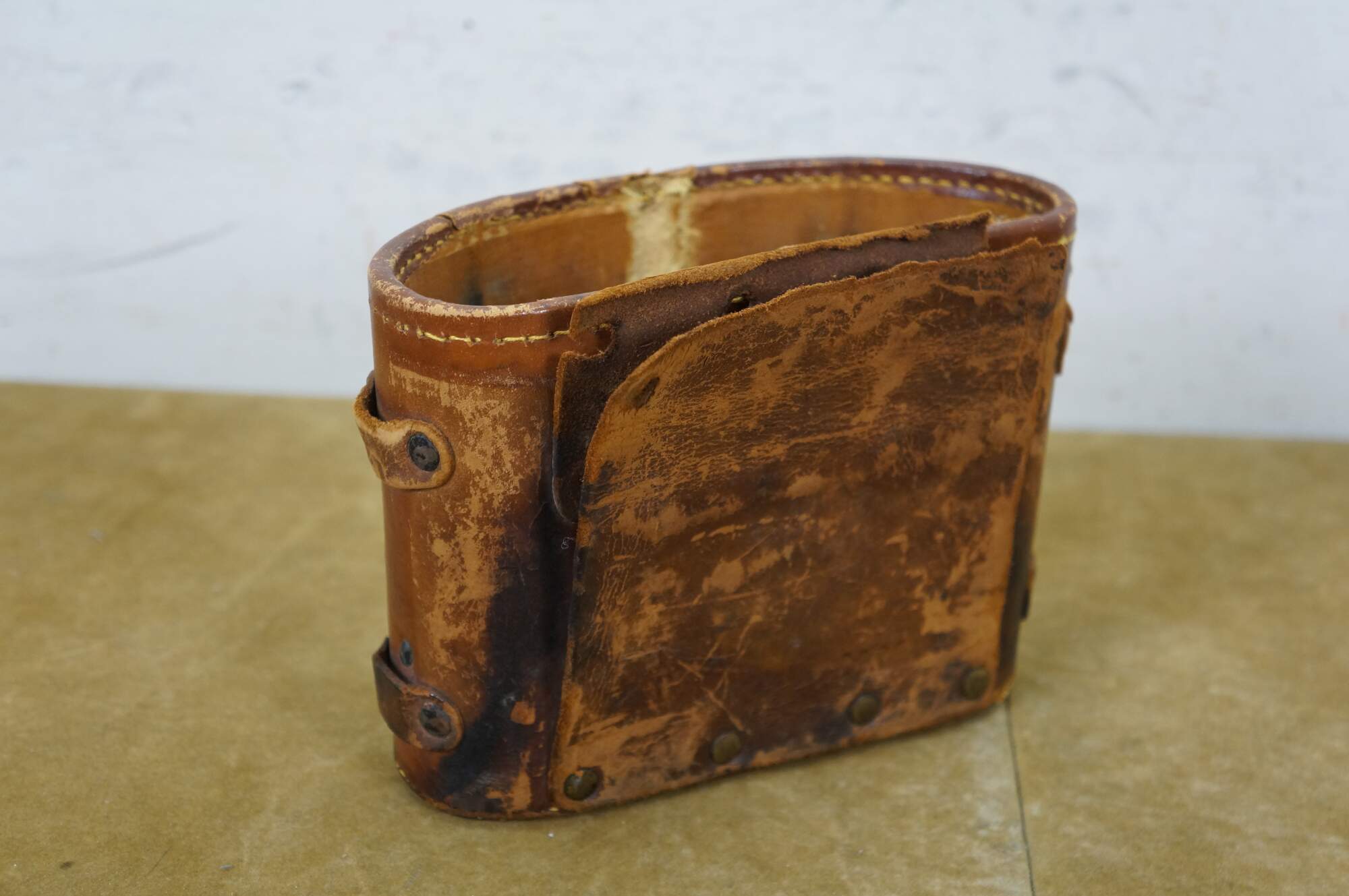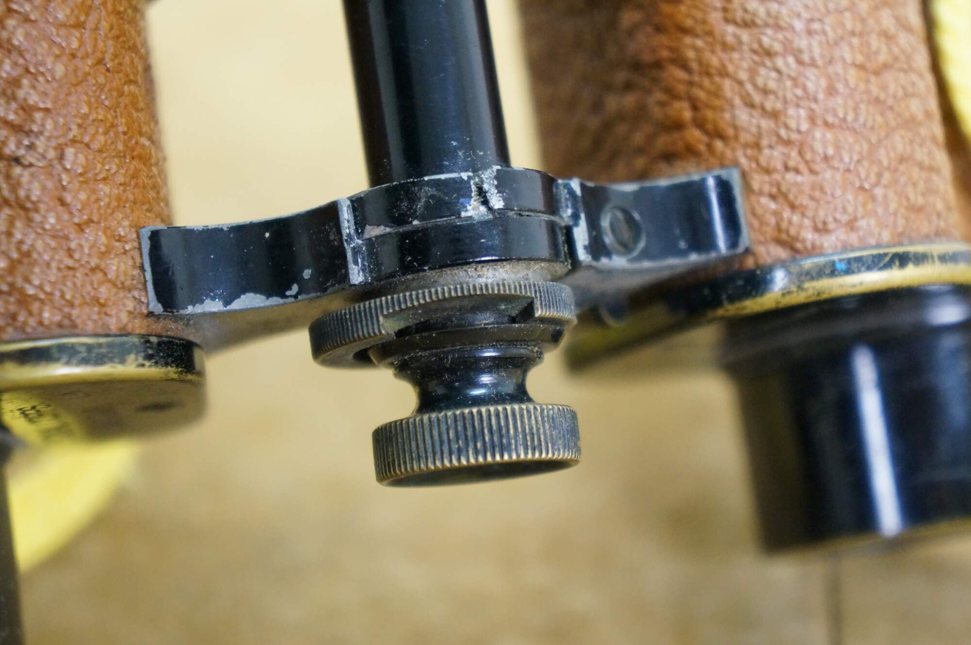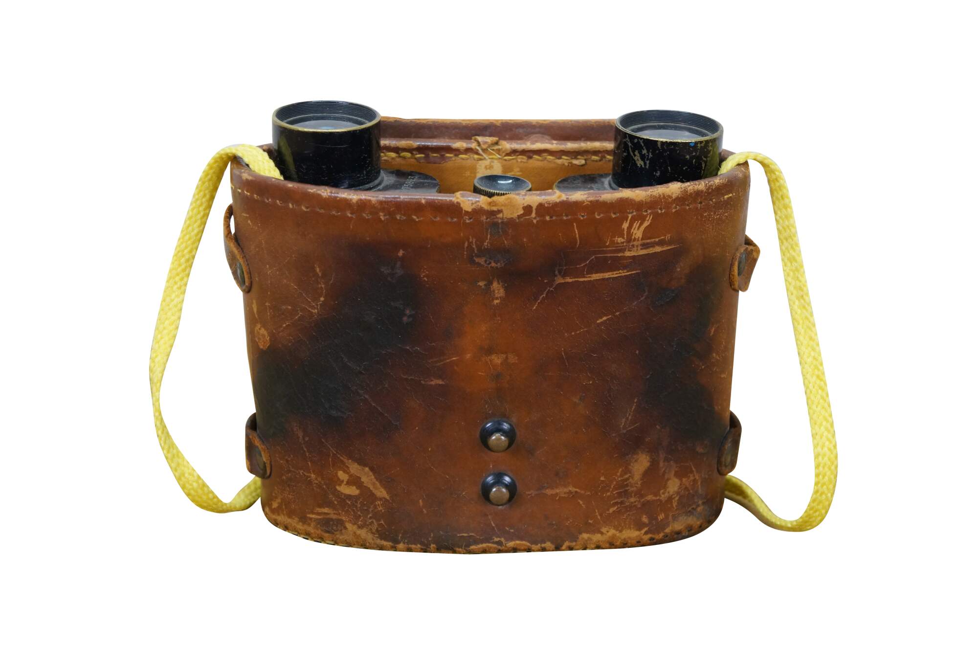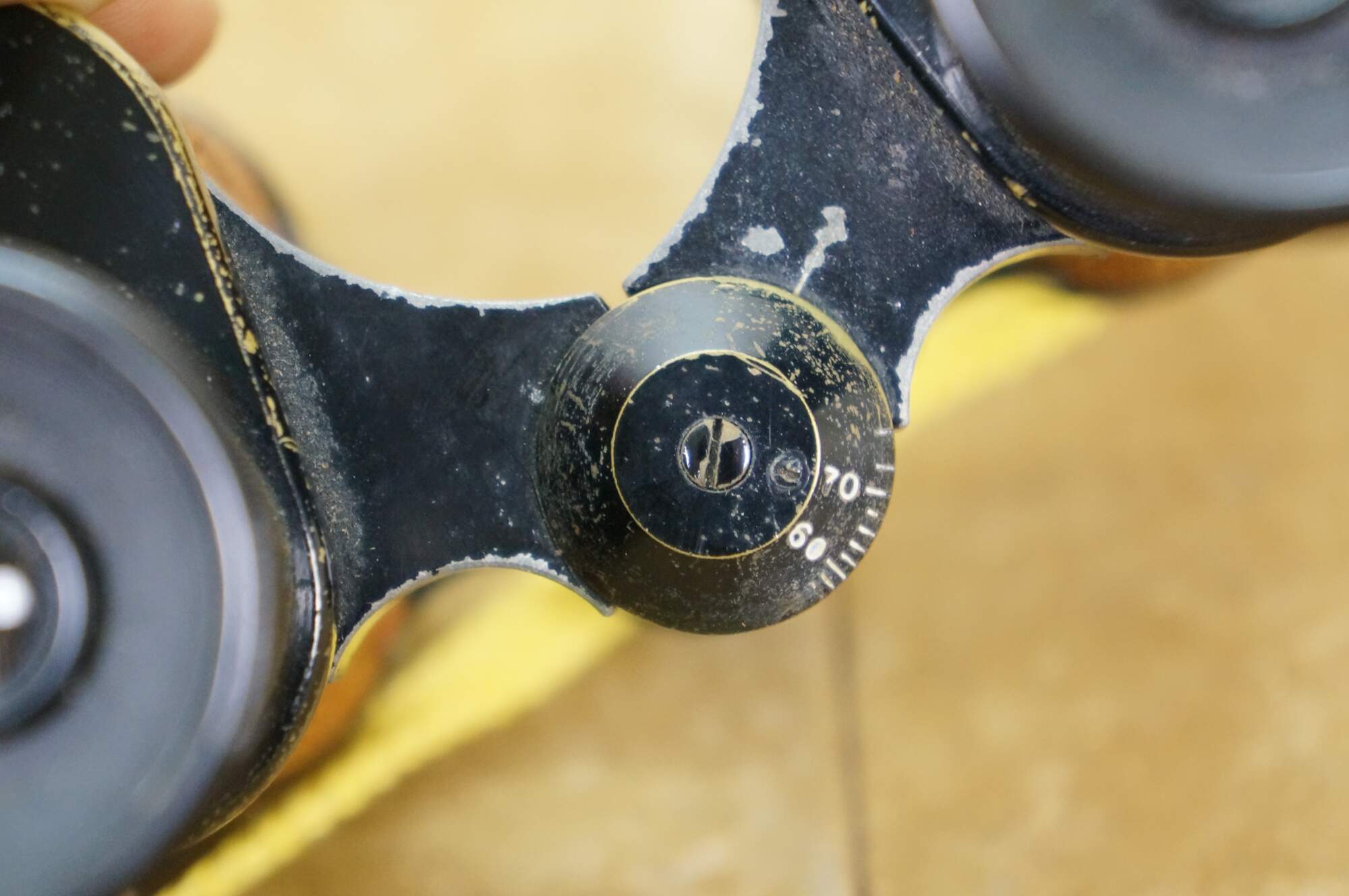 Scrapes/wear to paint; scuffs/stains to leather; missing lid on case and original strap to binoculars