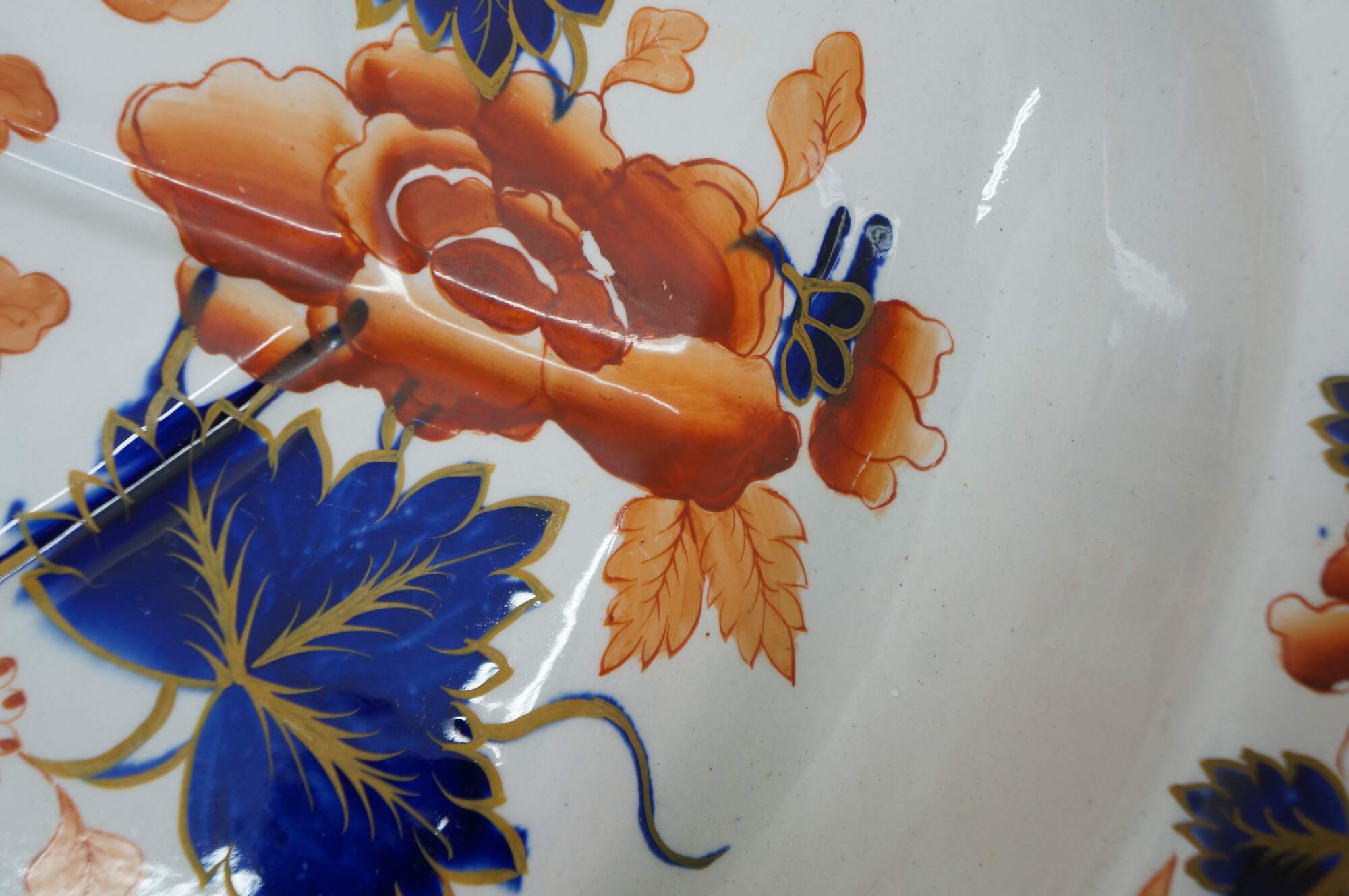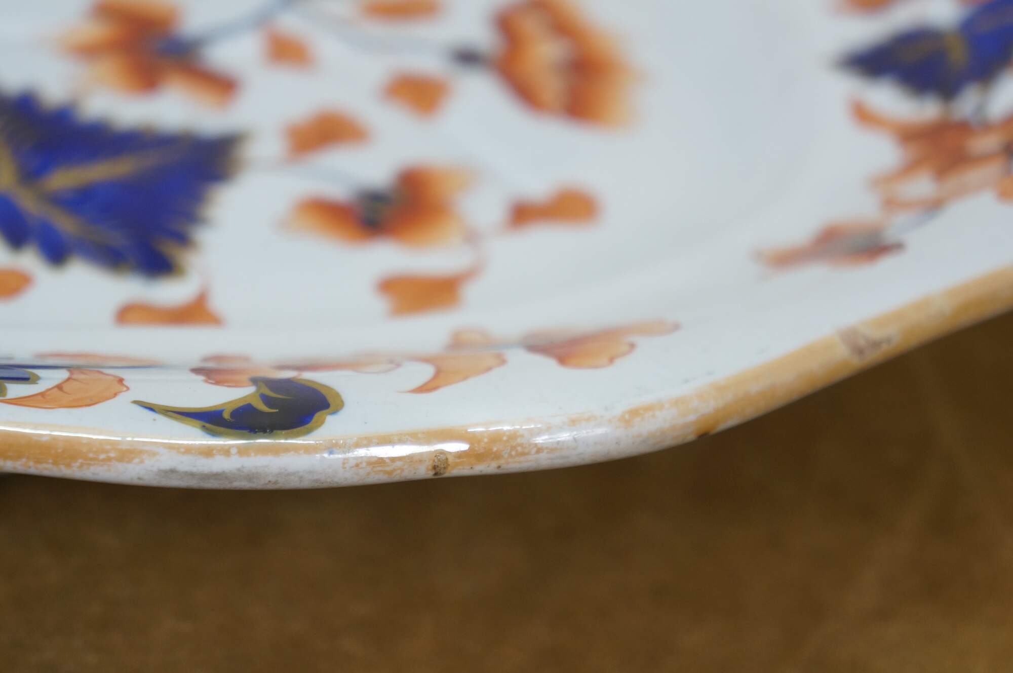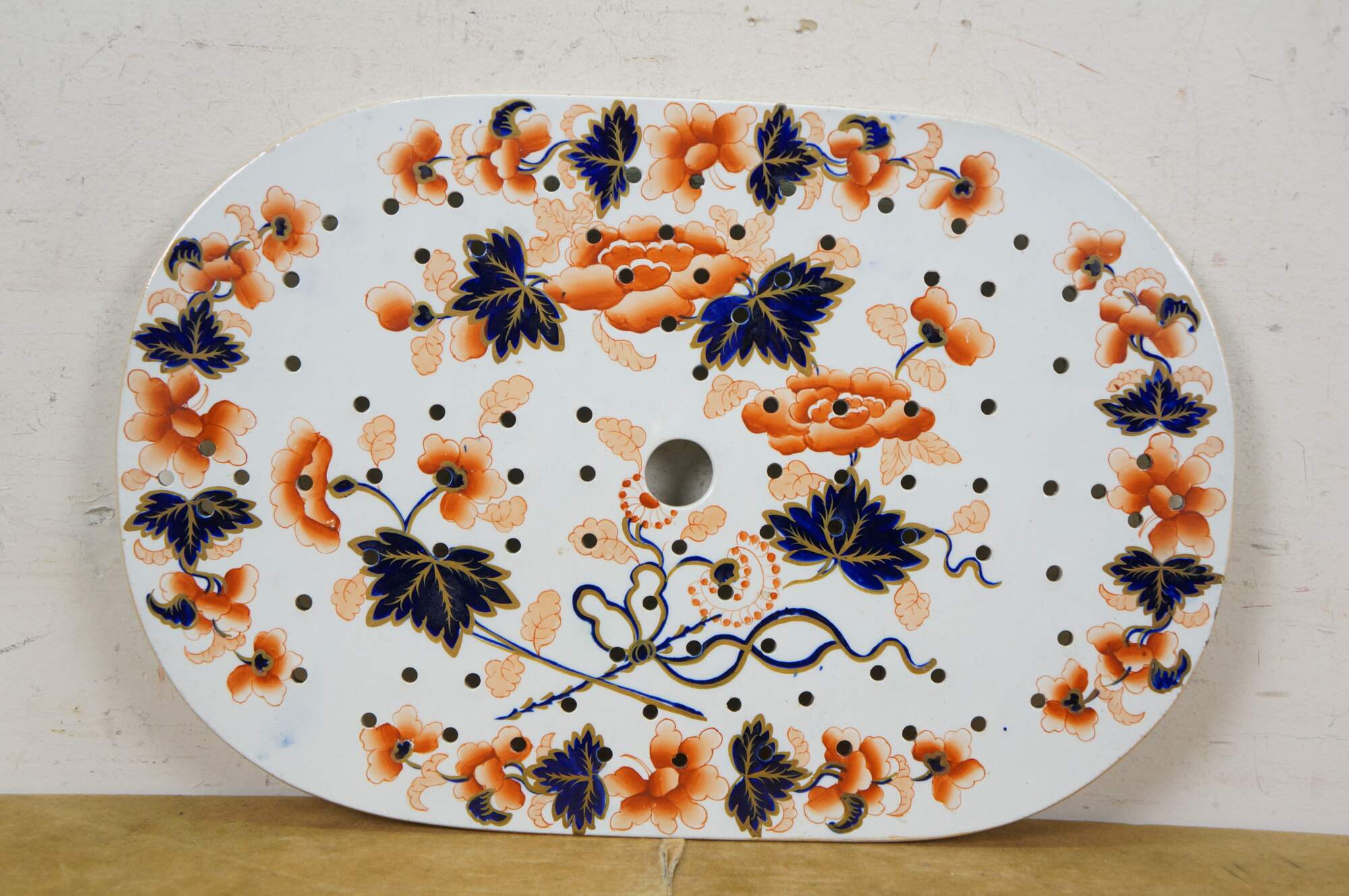 Rare antique late 19th to early 20th century stone china / ironstone porcelain two part meat platter set. Rounded rectangular shape with scalloped edge, hand painted with an Imari style floral and foliate pattern in cobalt blue and orange with gilt details. Includes base with incised grooves and reservoir for drippings and a removable upper portion pierced throughout with holes.
