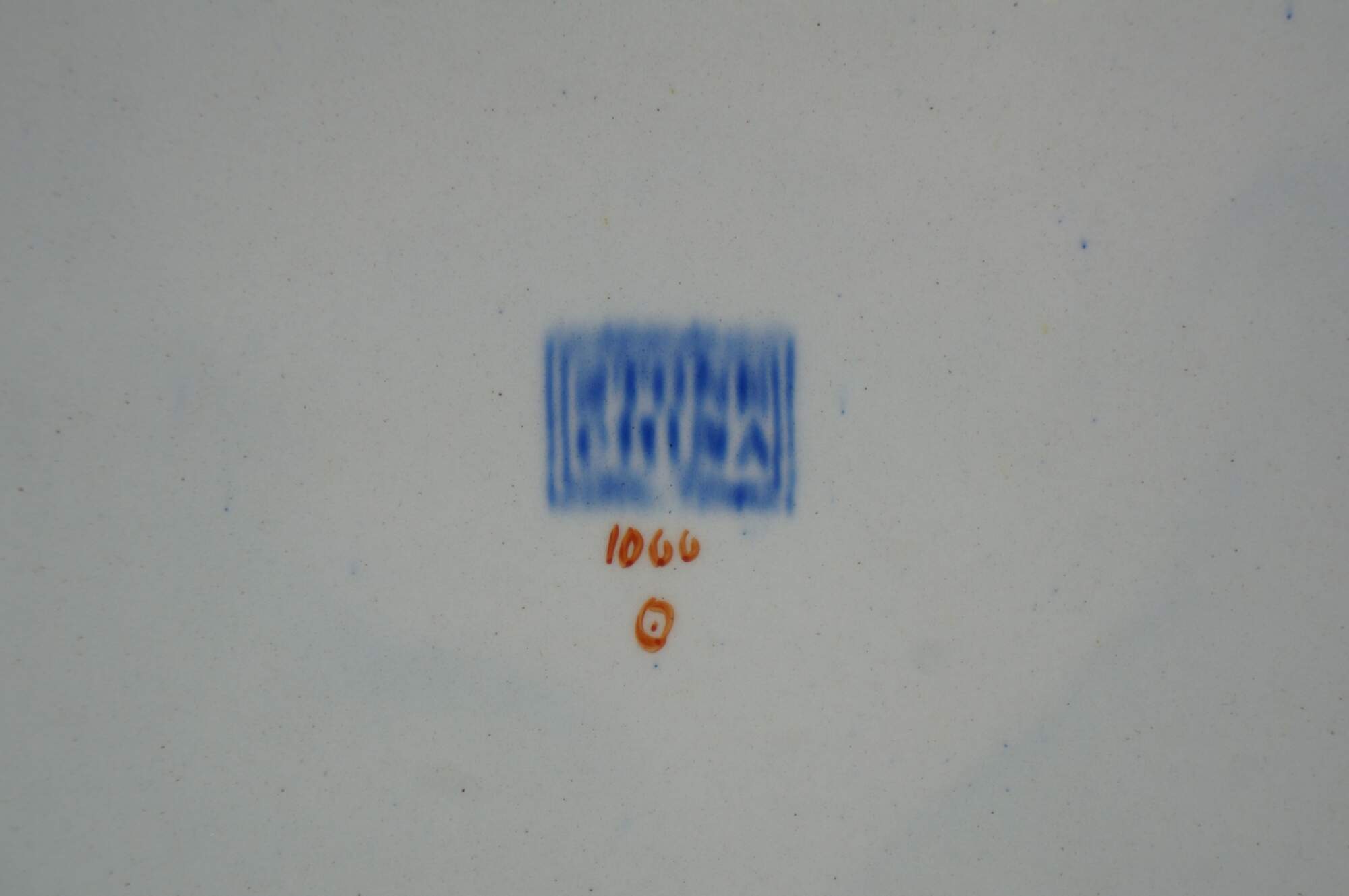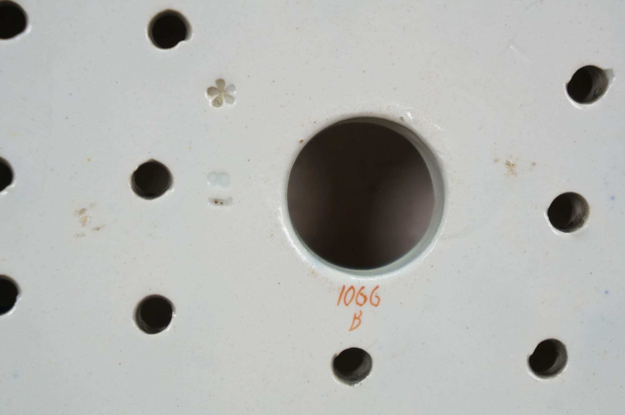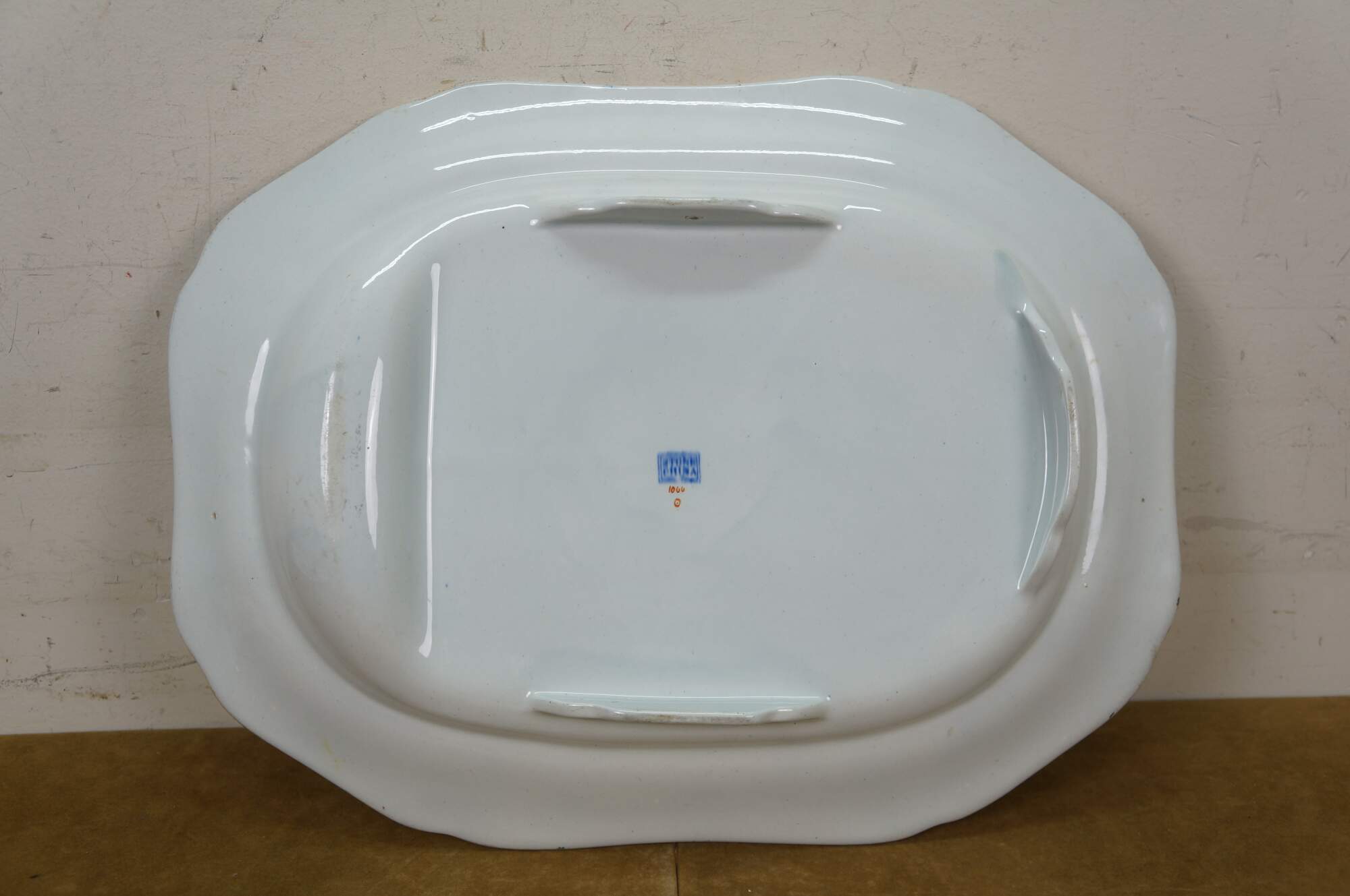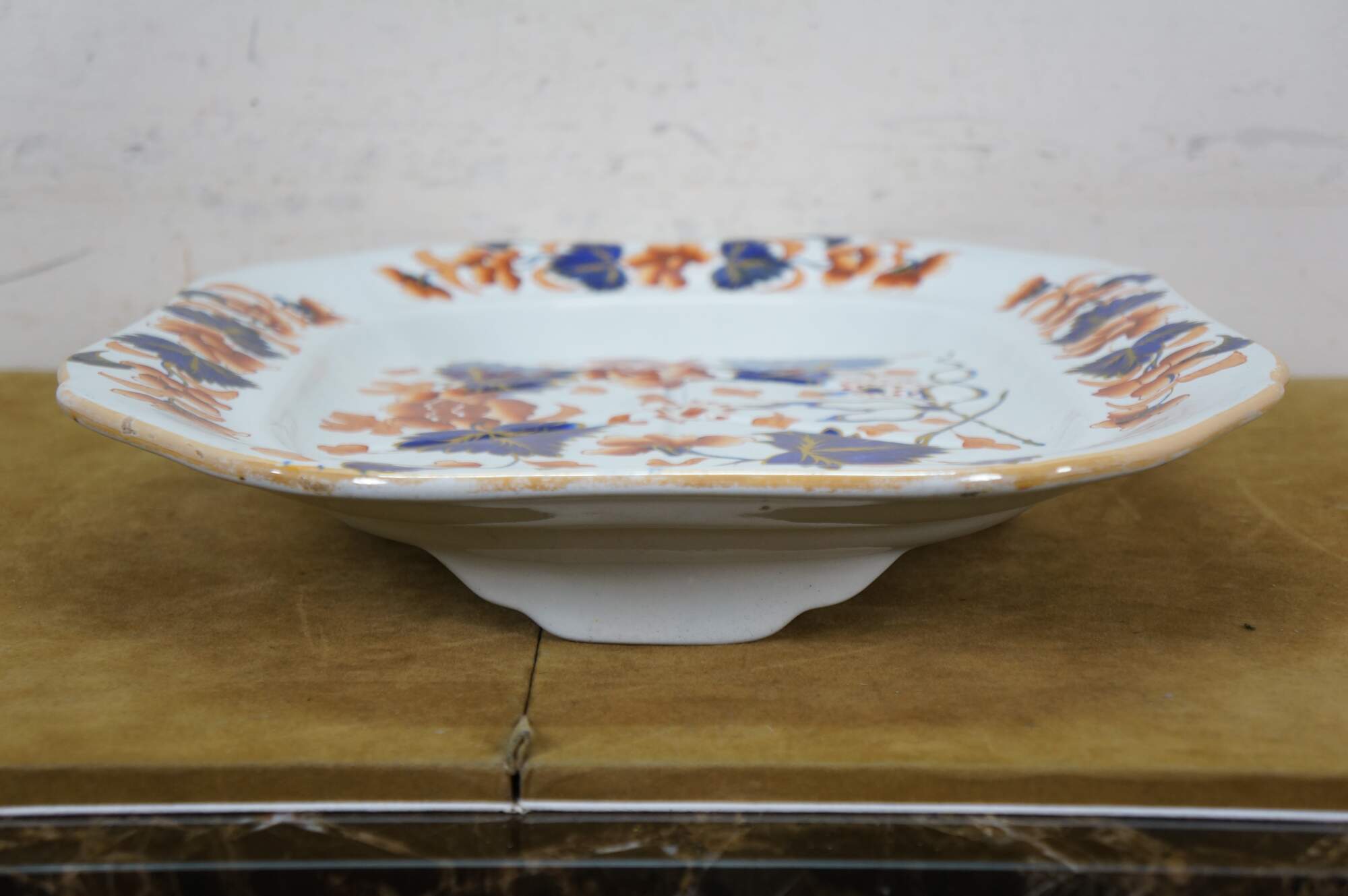 Rare antique late 19th to early 20th century stone china / ironstone porcelain two part meat platter set. Rounded rectangular shape with scalloped edge, hand painted with an Imari style floral and foliate pattern in cobalt blue and orange with gilt details. Includes base with incised grooves and reservoir for drippings and a removable upper portion pierced throughout with holes.