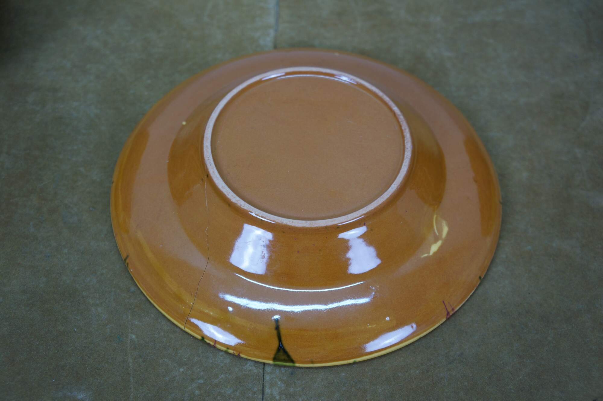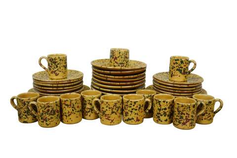 Vintage 45 piece set of Horchow Italian earthenware pottery dinnerware. Glazed in yellow and speckled with red and green spots. Set includes: 8 Dinner Plates, 13 Bread Plates, 11 Soup Bowls, 13 Mugs / Cups. Made in Italy.