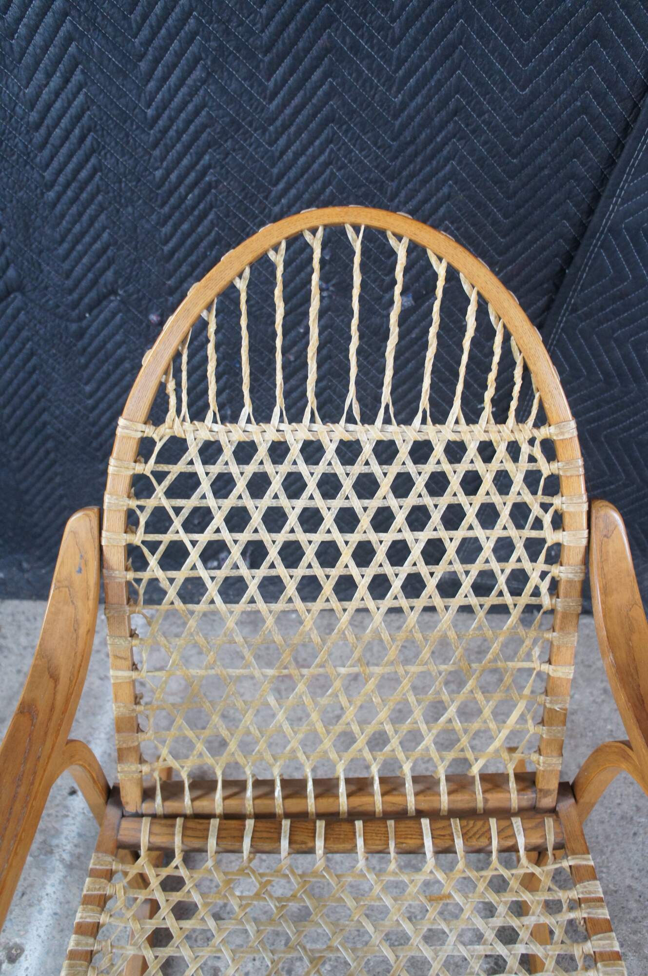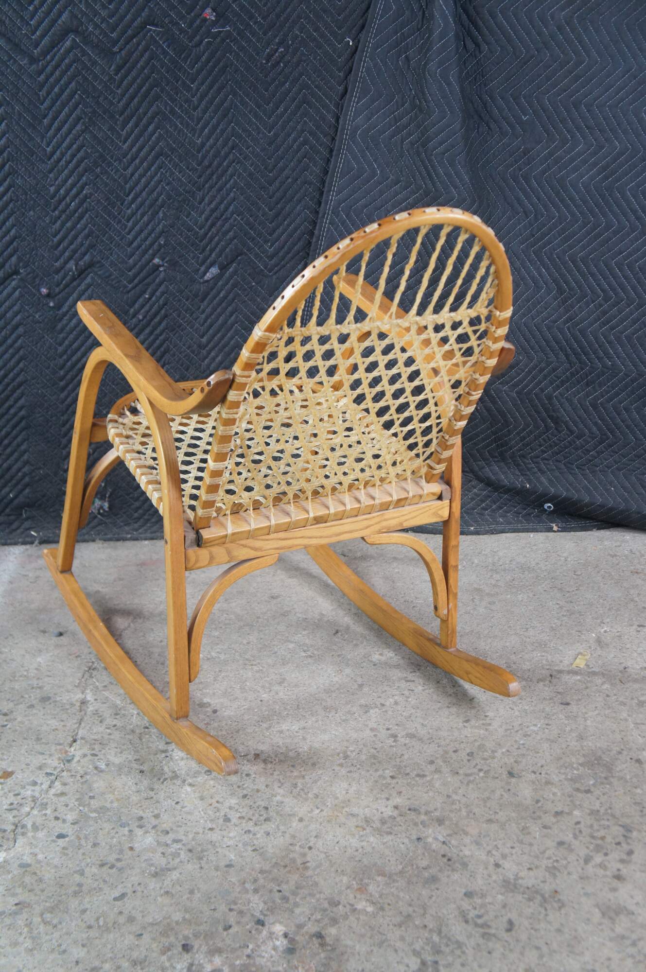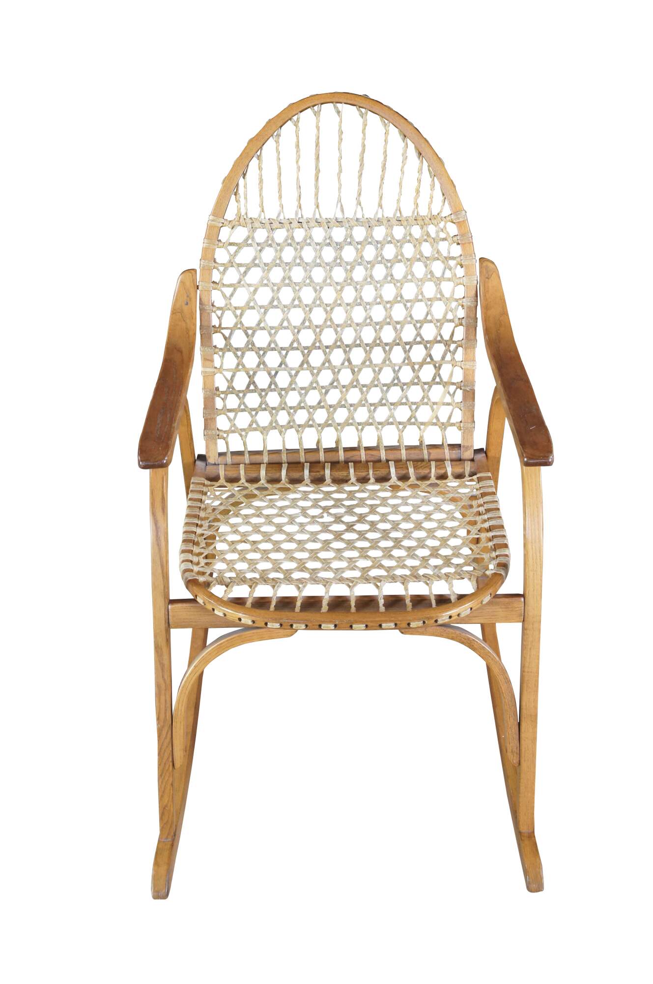 Vintage Vermont Tubbs snowshoe rocking chair featuring an oak frame with rawhide lacing.