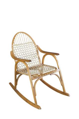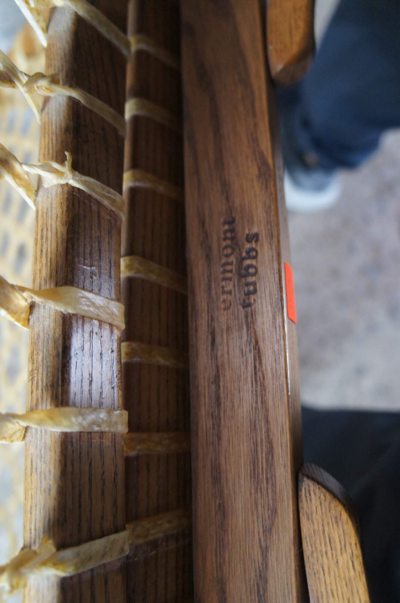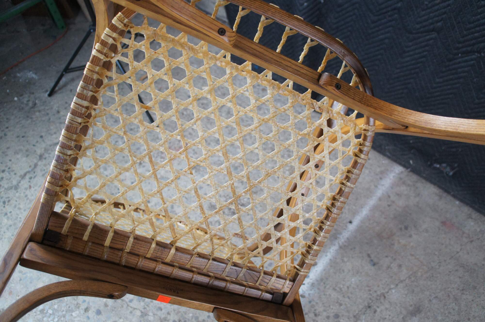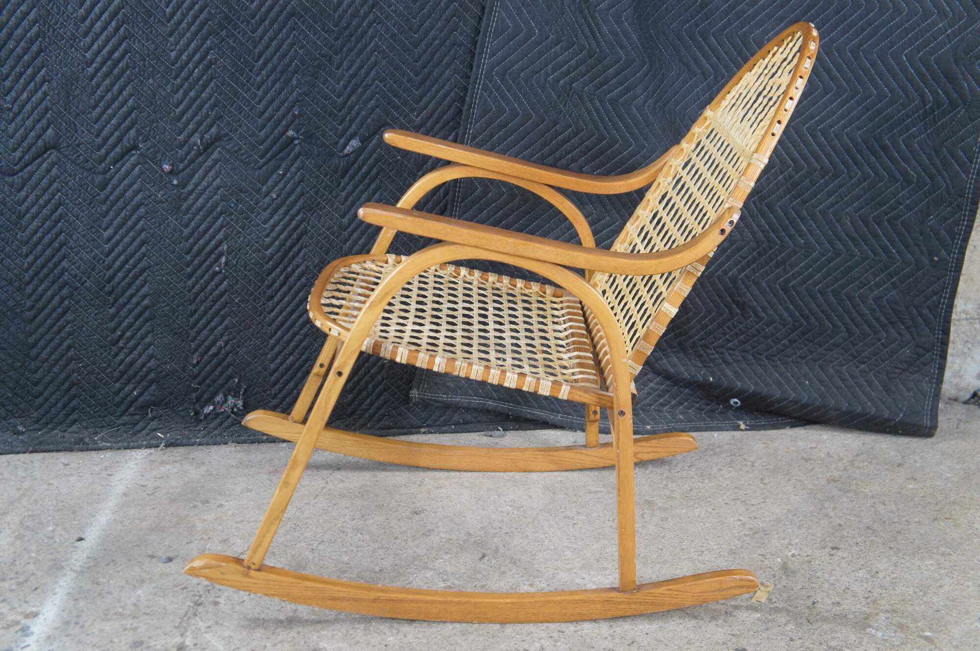 Vintage Vermont Tubbs snowshoe rocking chair featuring an oak frame with rawhide lacing.