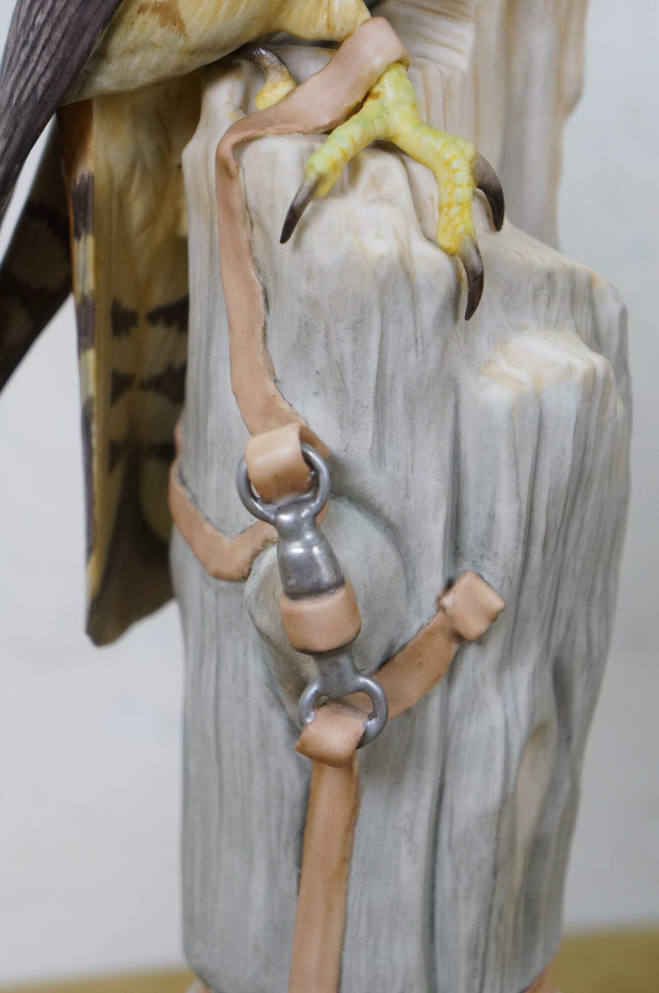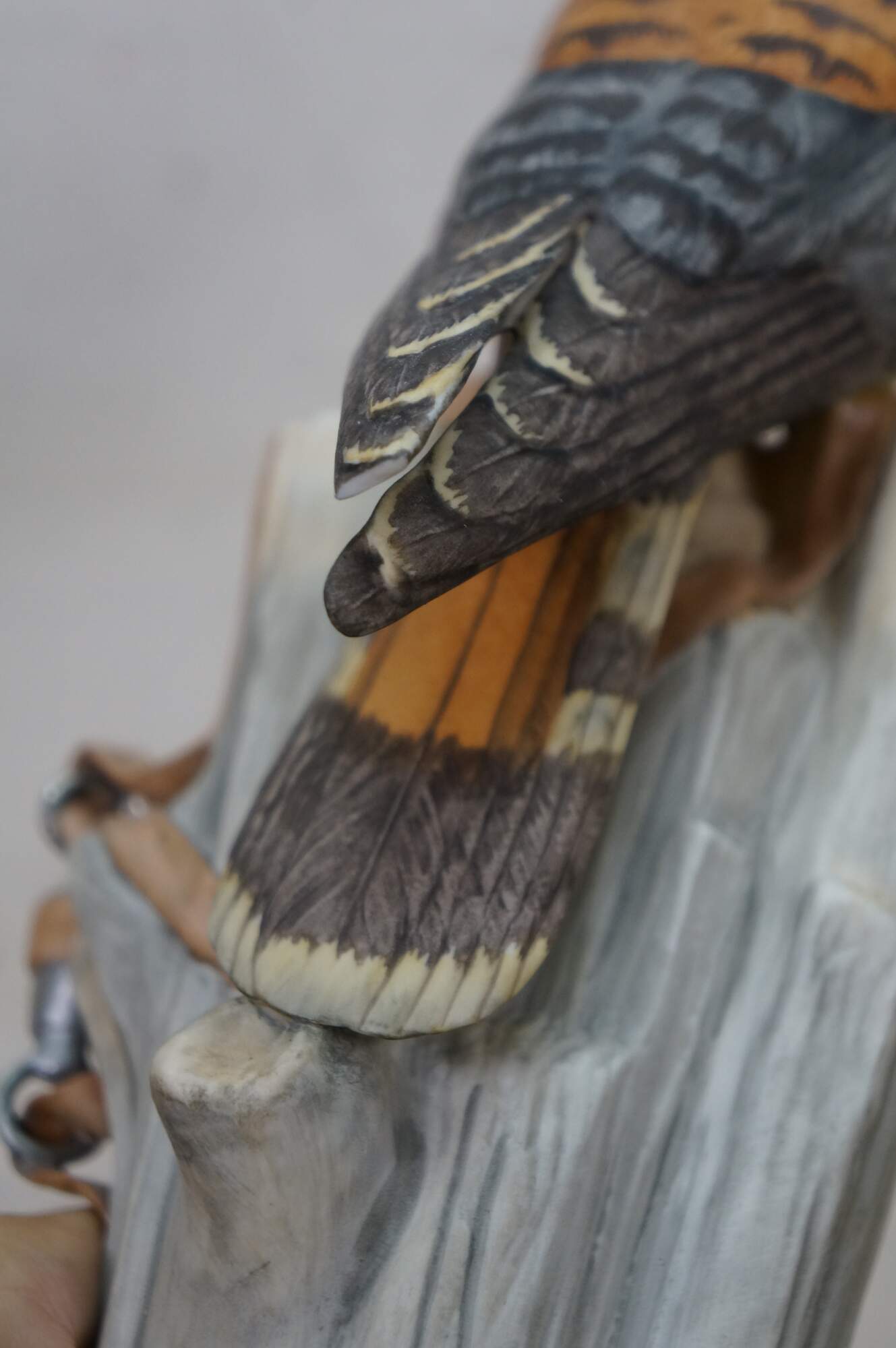 Circa mid 20th century Boehm Limited Edition porcelain Kestrel Falcons (Falco sparverius s.) number 492 and 492W figurines / sculptures. Depicts a pair of kestrels tethered to tree stumps, decked out for hunting with plumed leather hoods. Made in USA.
