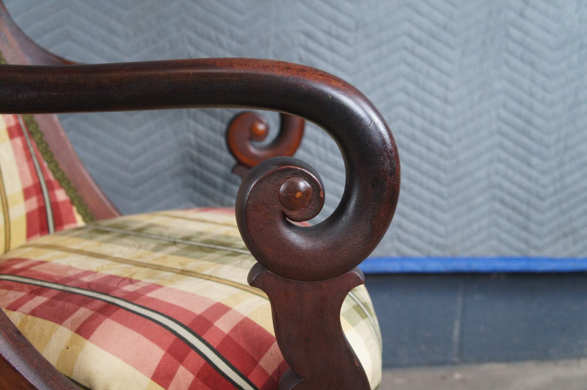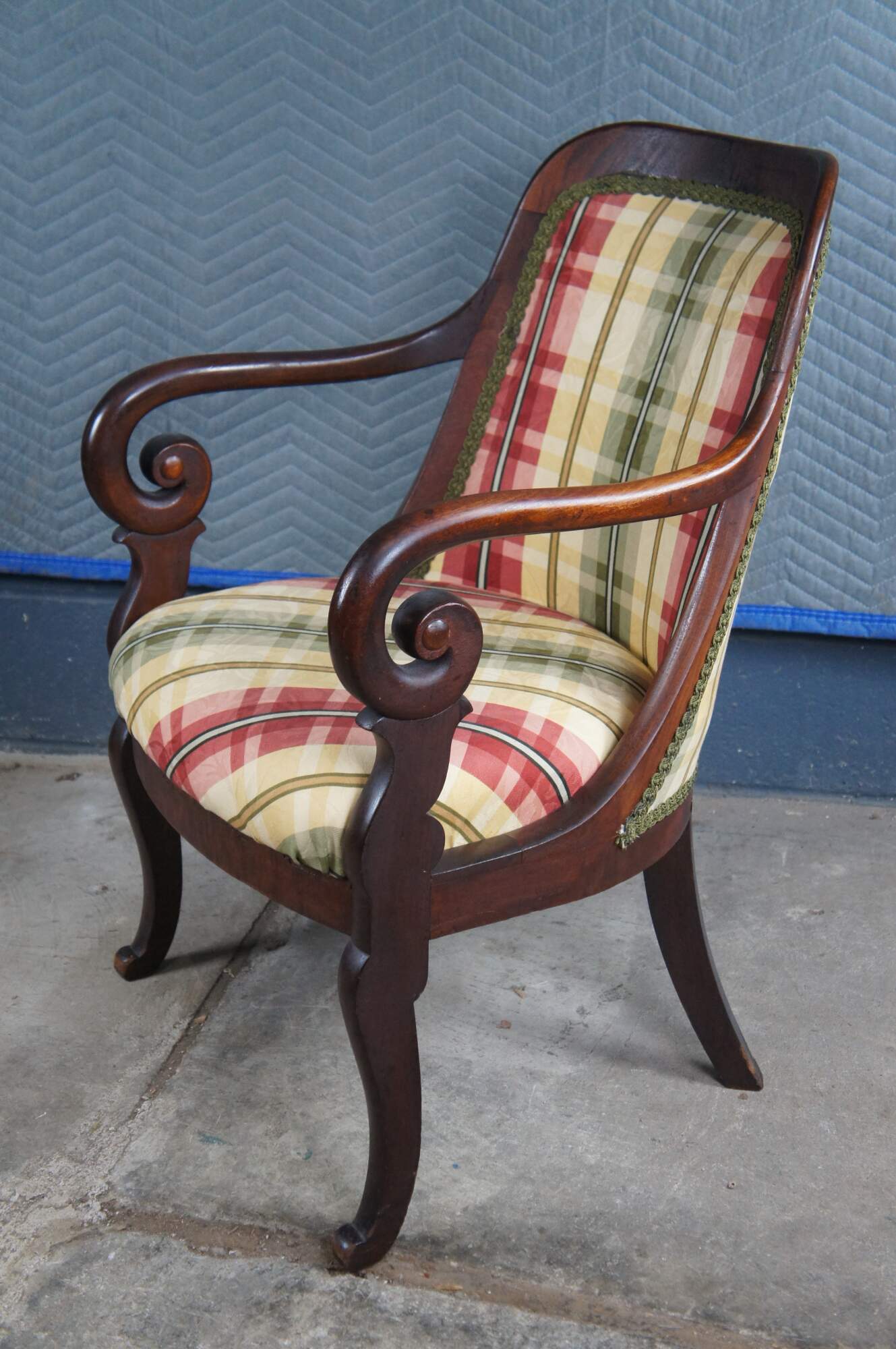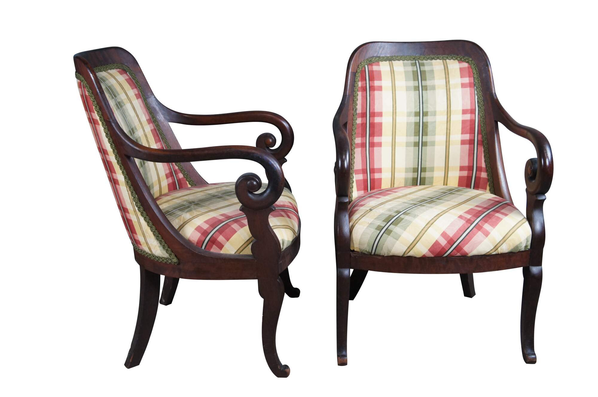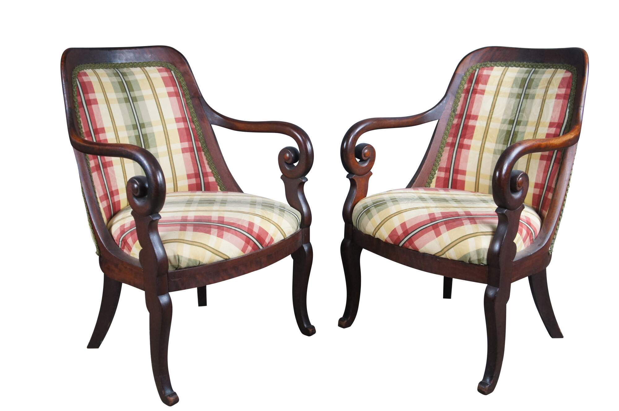 Antique Victorian library / parlor arm chairs. Made of mahogany featuring American Empire / regency styling with scrolled arms and plaid upholstery.