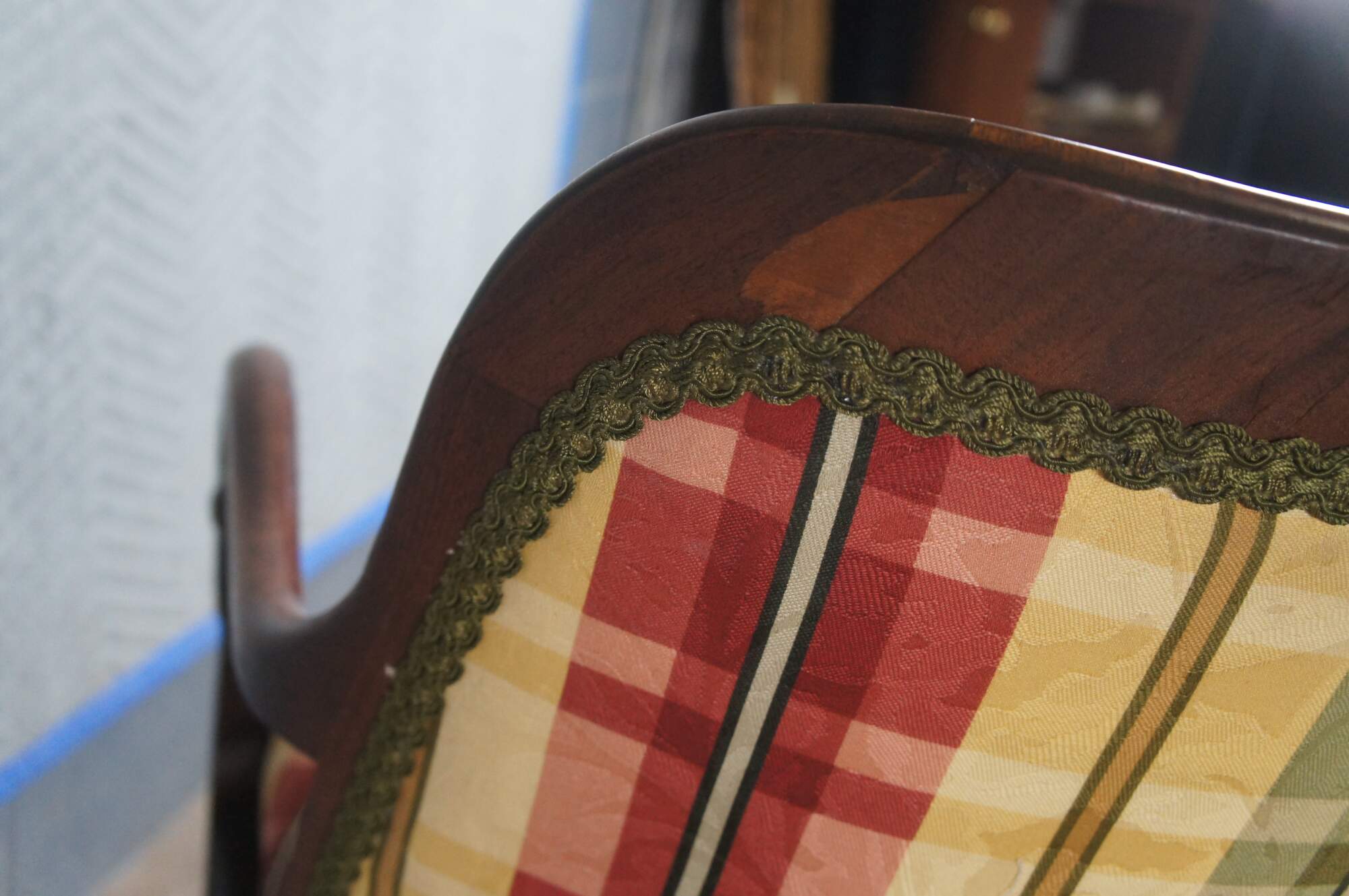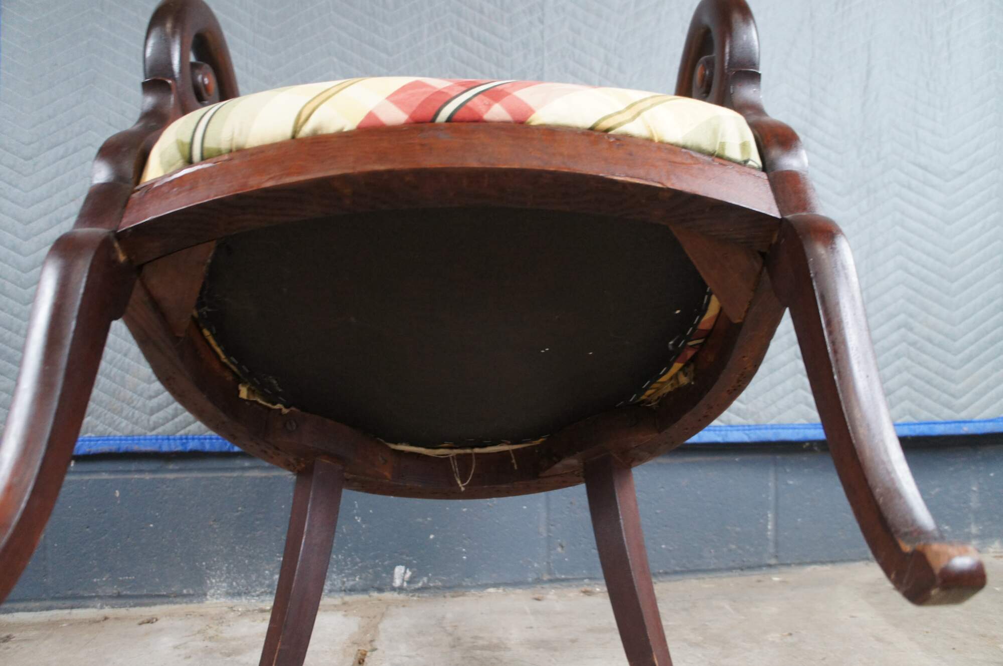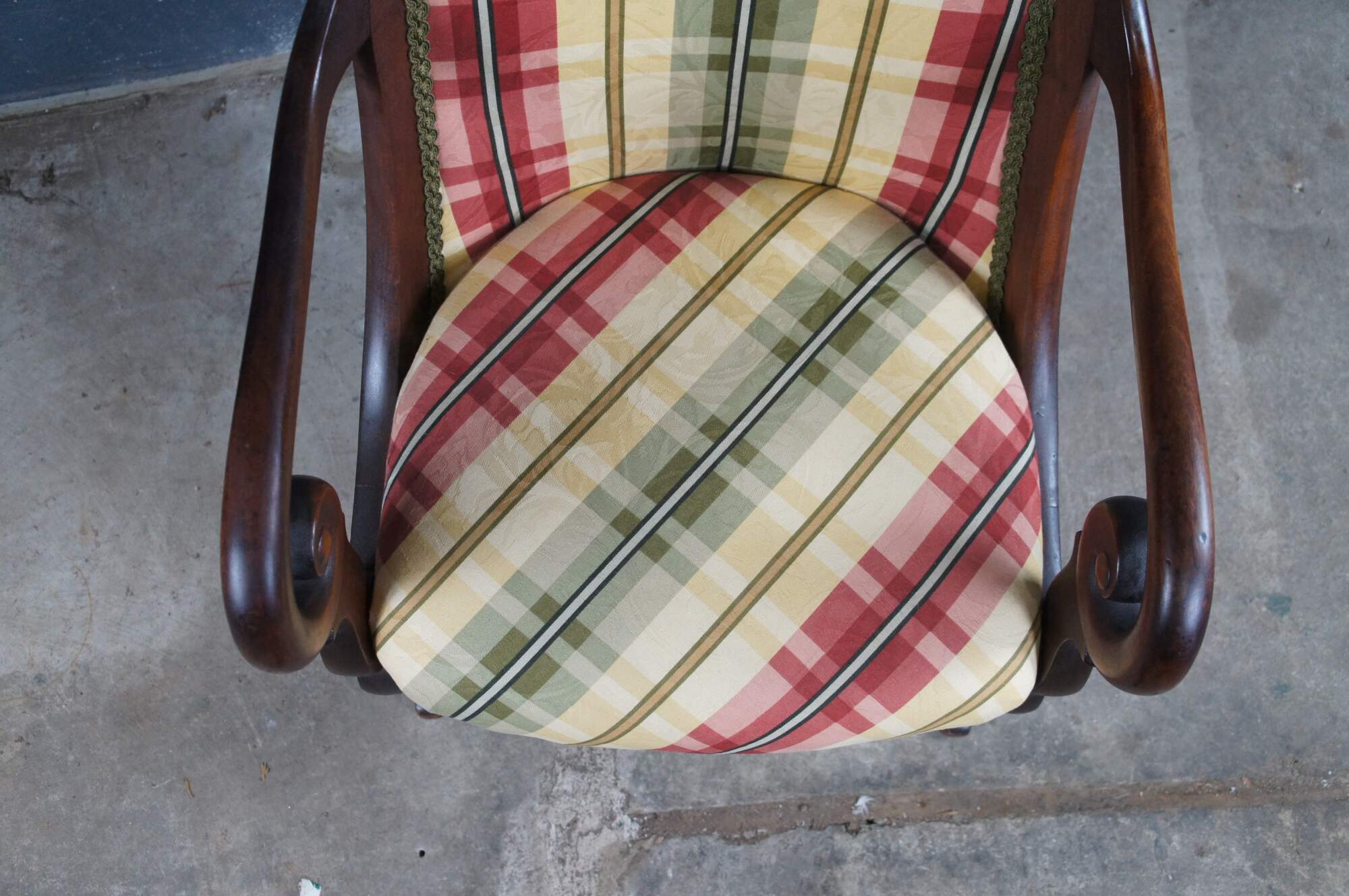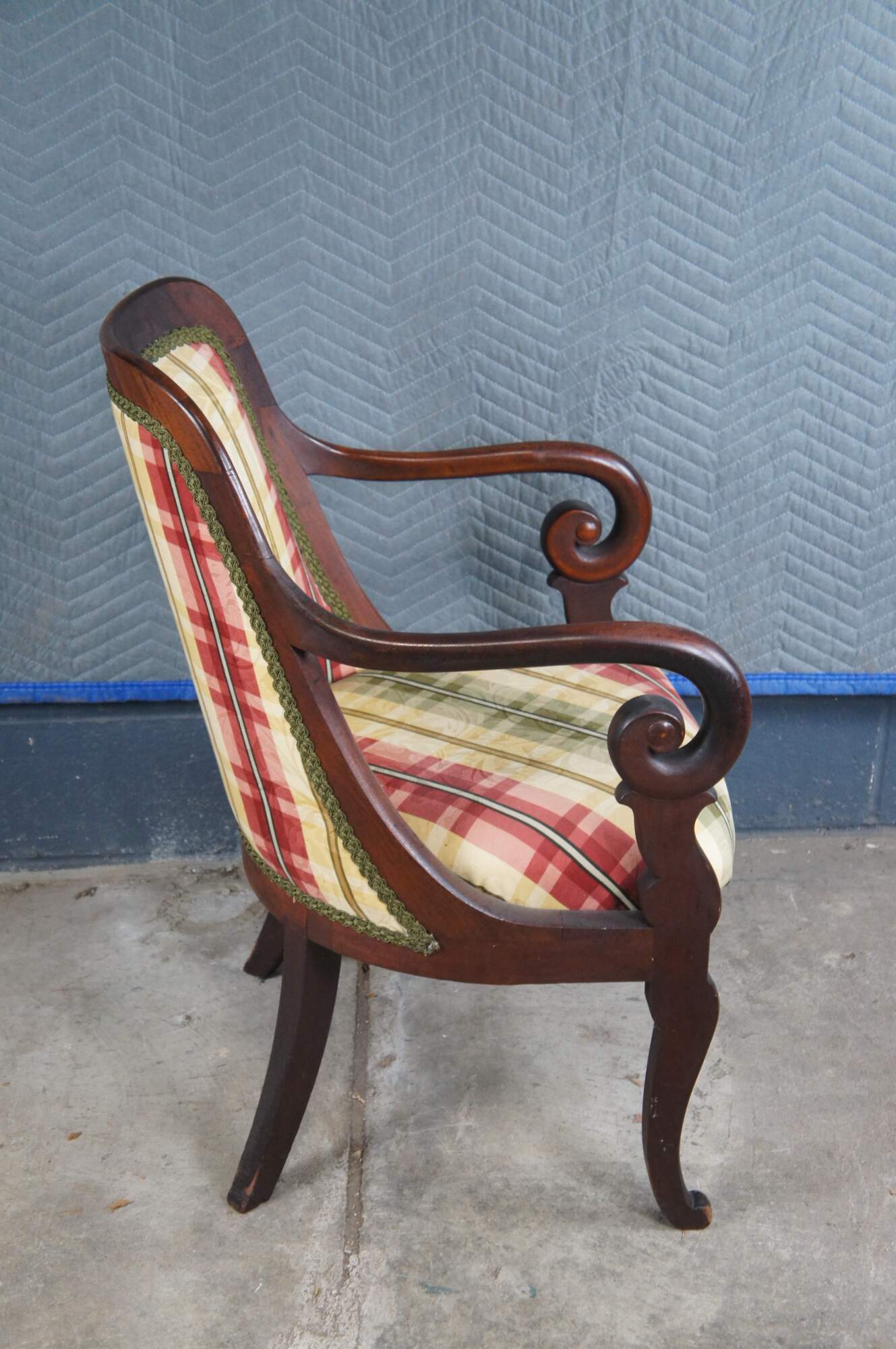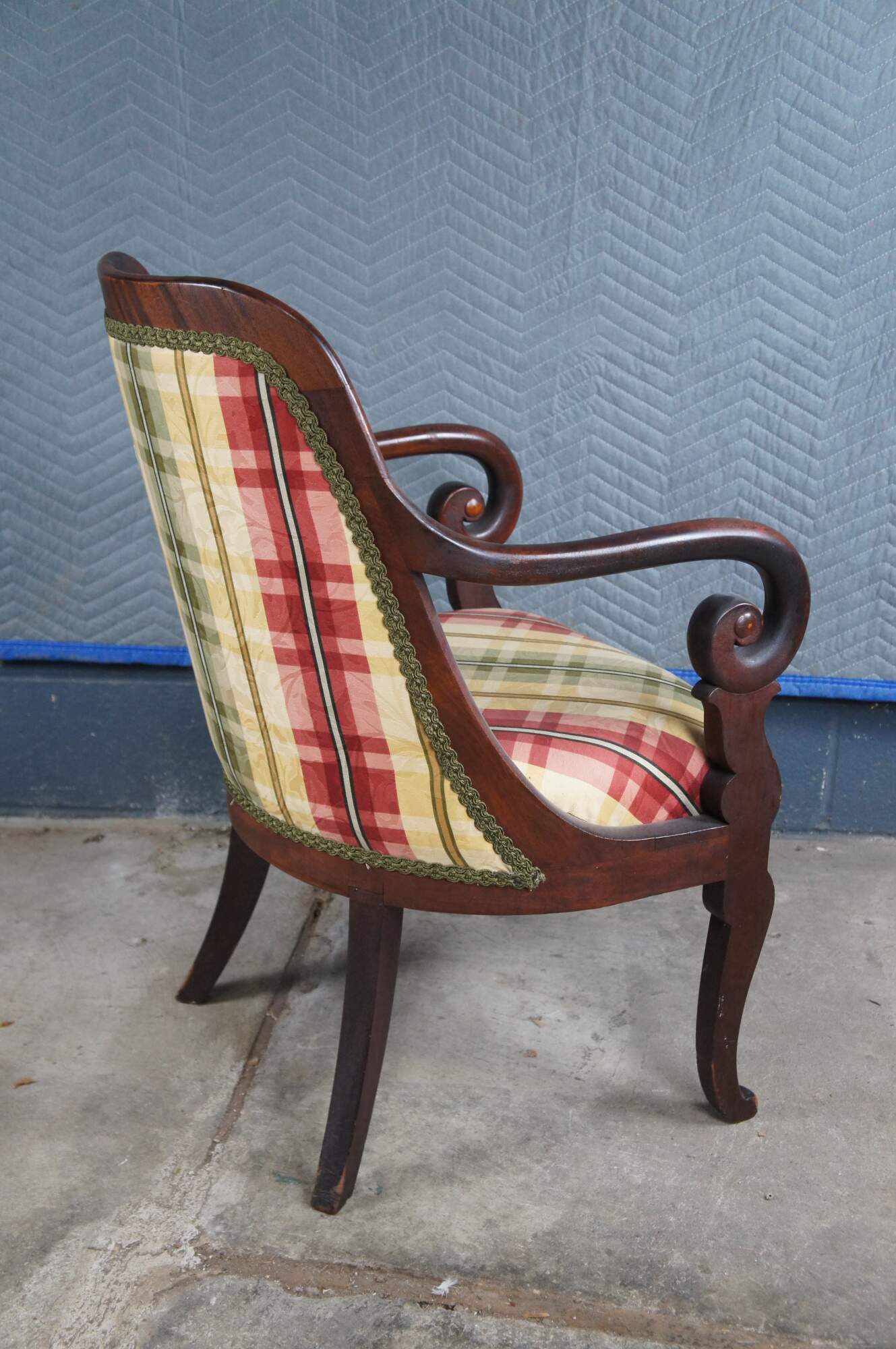 Antique Victorian library / parlor arm chairs. Made of mahogany featuring American Empire / regency styling with scrolled arms and plaid upholstery.